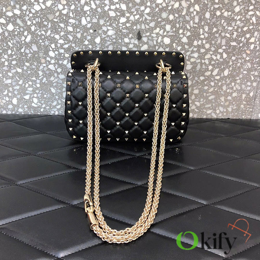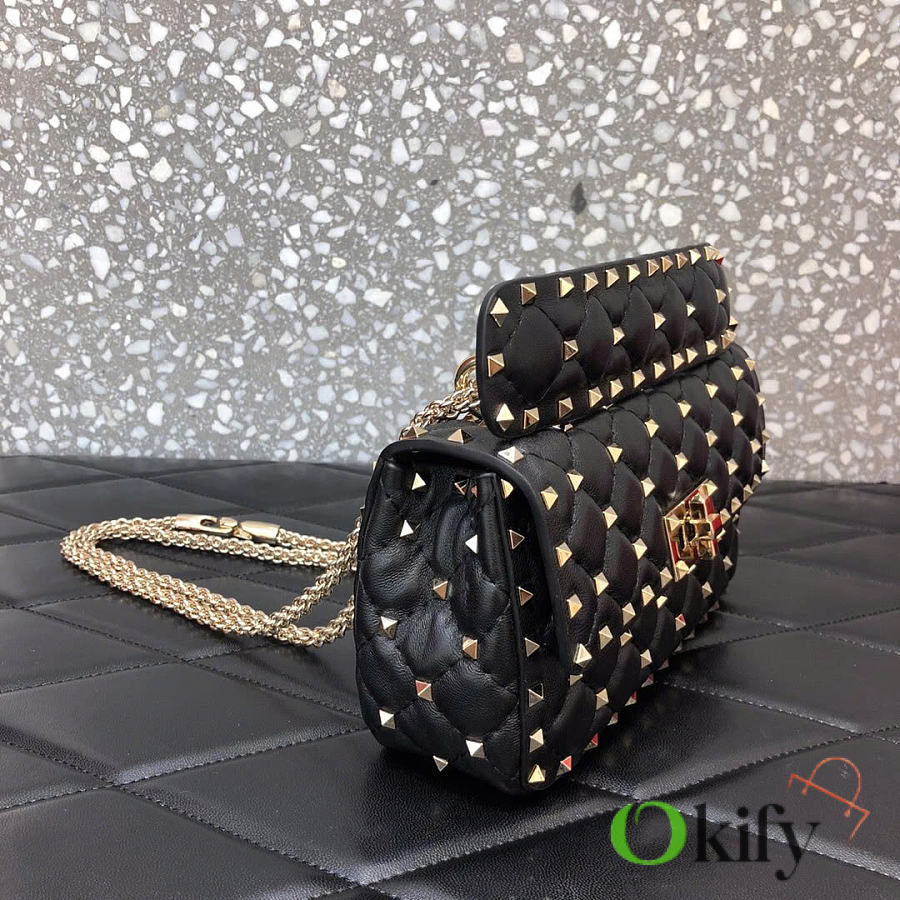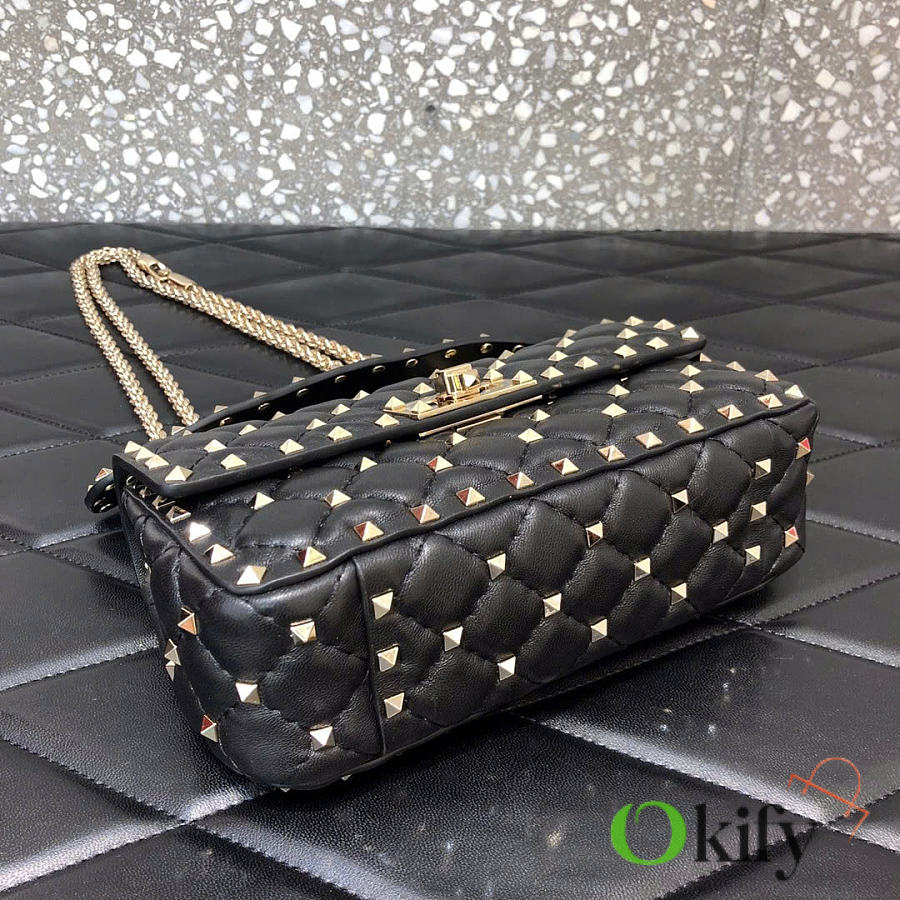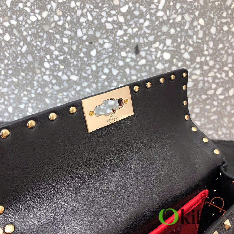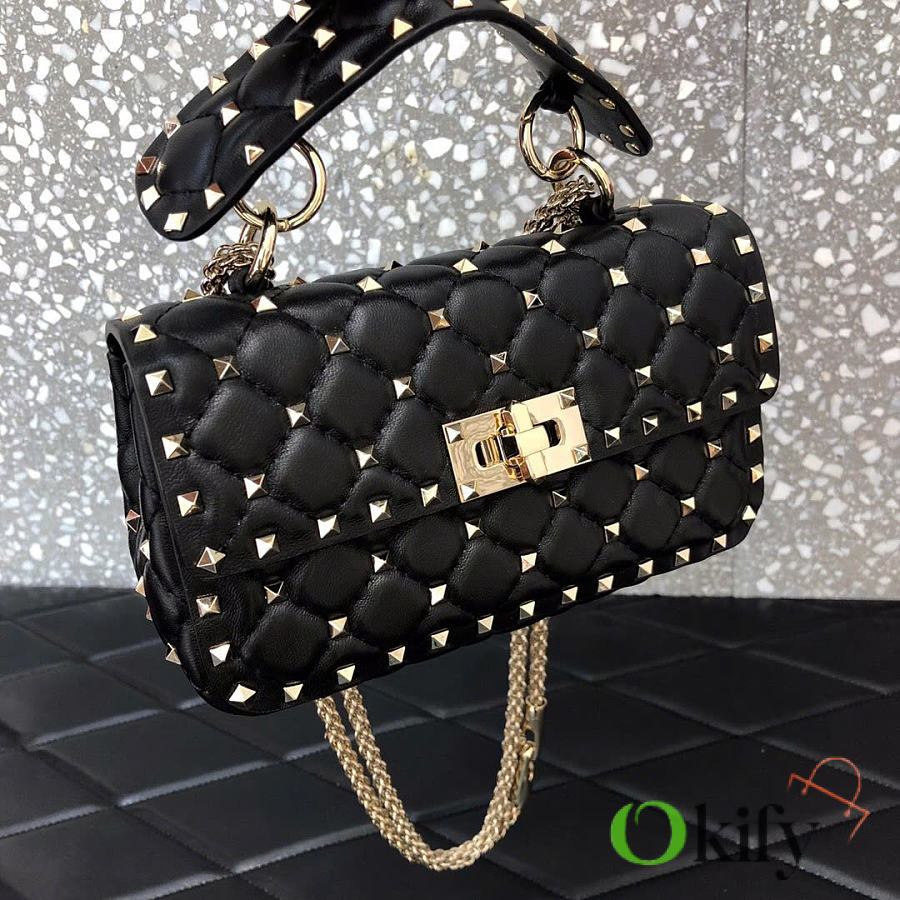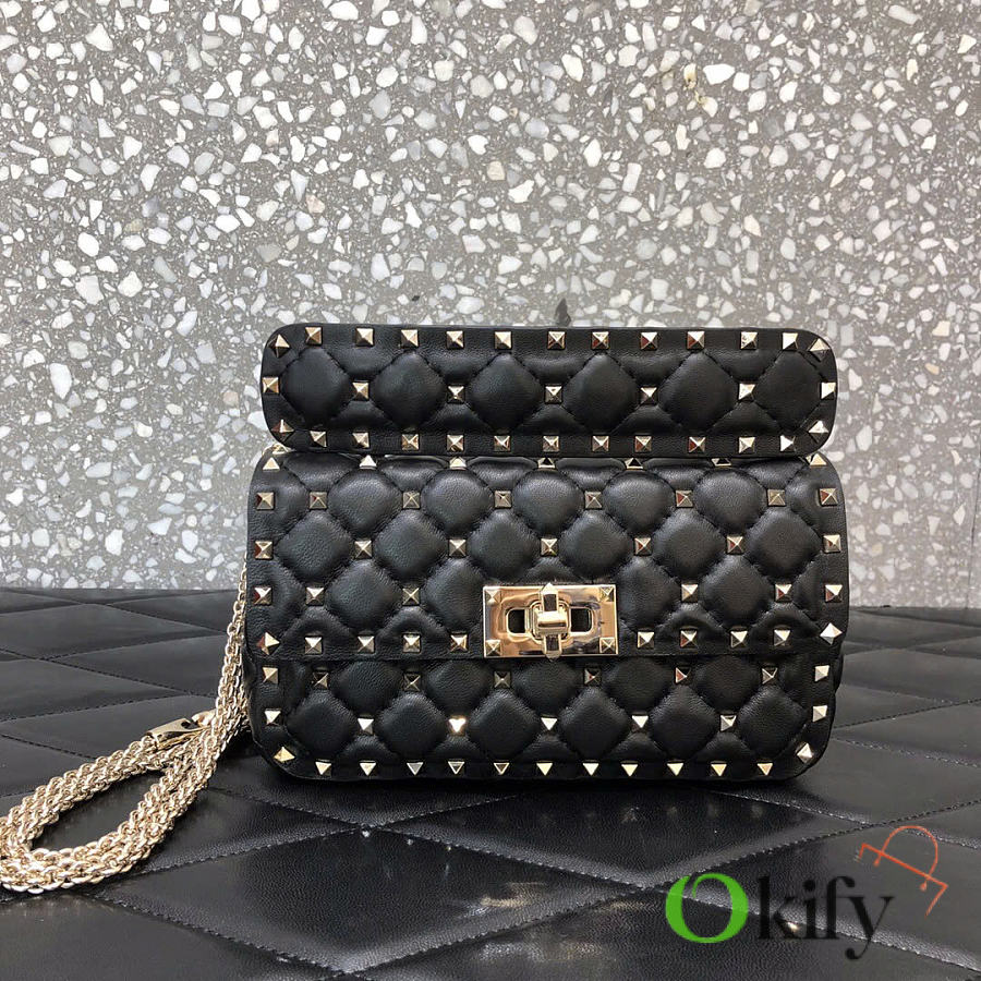 Made of soft, wrinkled lambskin, this bag features a detachable handle, sliding clasp, and a detachable chain shoulder strap. It can be carried over the shoulder, crossbody, or by hand. It boasts a diamond-patterned geometric embroidery, and features 240 sets of high-gloss electroplated rivets and metal hardware, all hand-set over 3 hours. It has a turn-lock flap closure, a red leather lining, and a zippered pocket