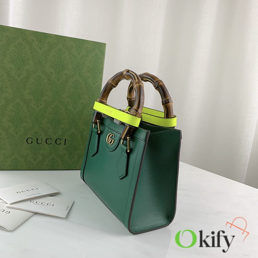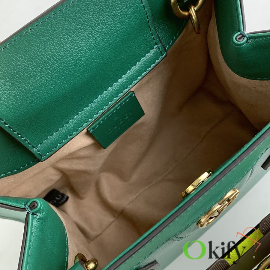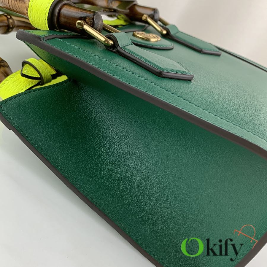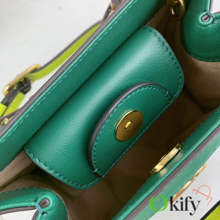This mini tote bag in green original leather combines two recognizable brand elements: bamboo handles and double-sided hardware. The green leather material complements the two neon-colored buckles, highlighting a lively and elegant temperament. Dimensions: 20x16x10 cm.