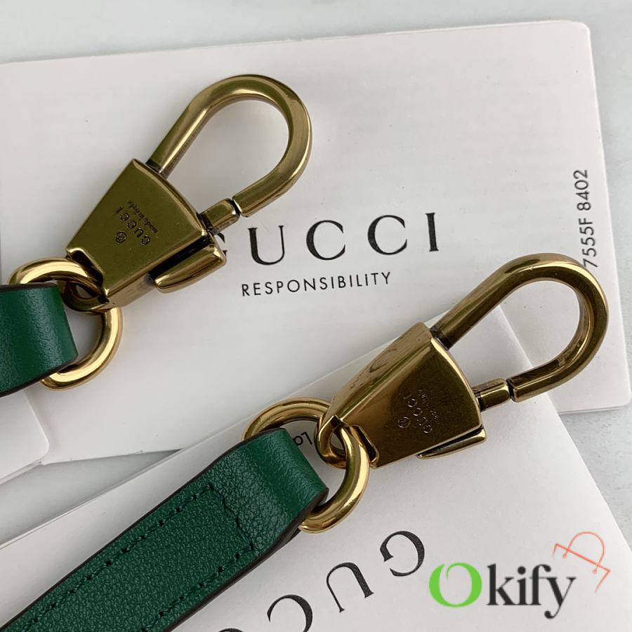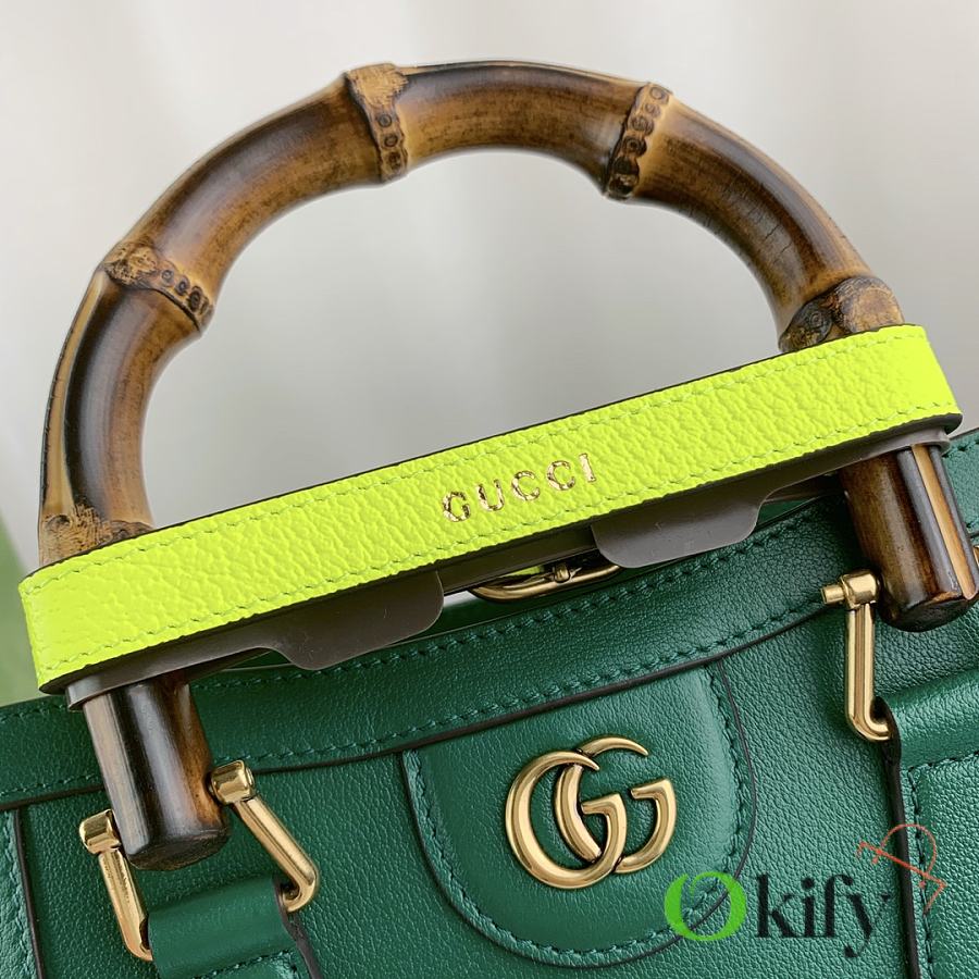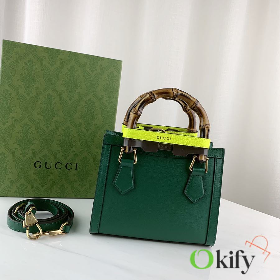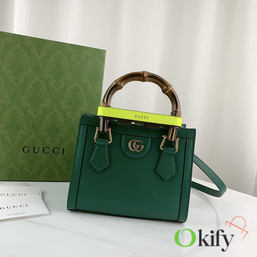 This mini tote bag in green original leather combines two recognizable brand elements: bamboo handles and double-sided hardware. The green leather material complements the two neon-colored buckles, highlighting a lively and elegant temperament. Dimensions: 20x16x10 cm.