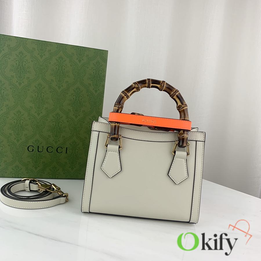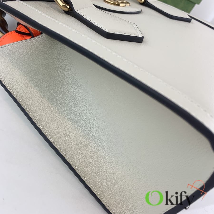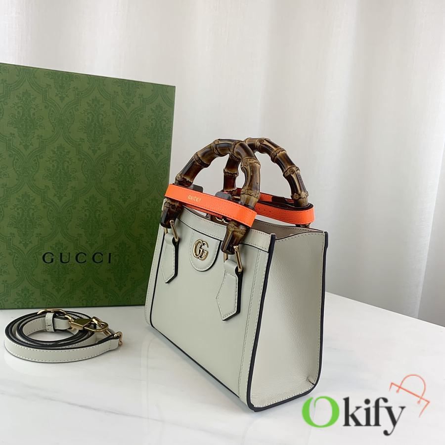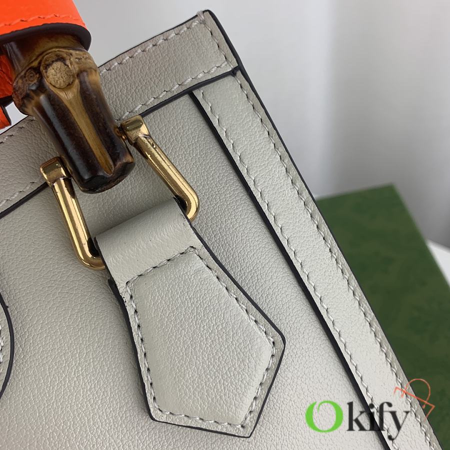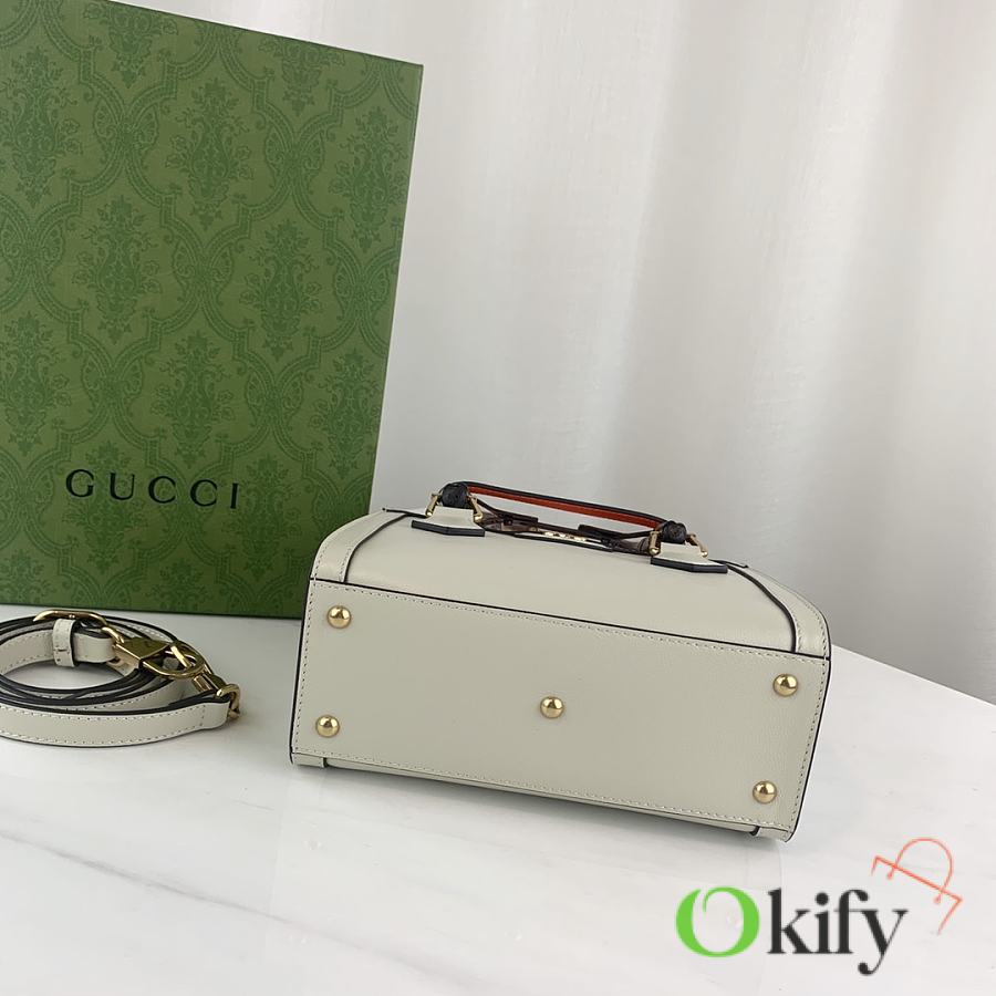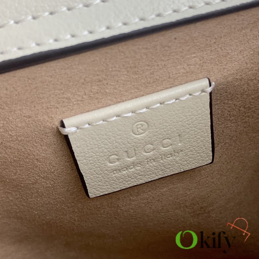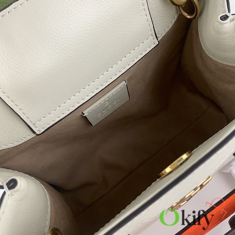 This mini tote bag combines two recognizable brand elements: bamboo handles and double G hardware. The white leather material complements the two neon buckle straps, highlighting a lively and elegant temperament. Dimensions: 20x16x10
