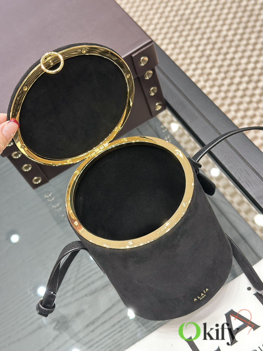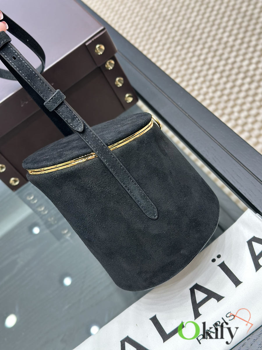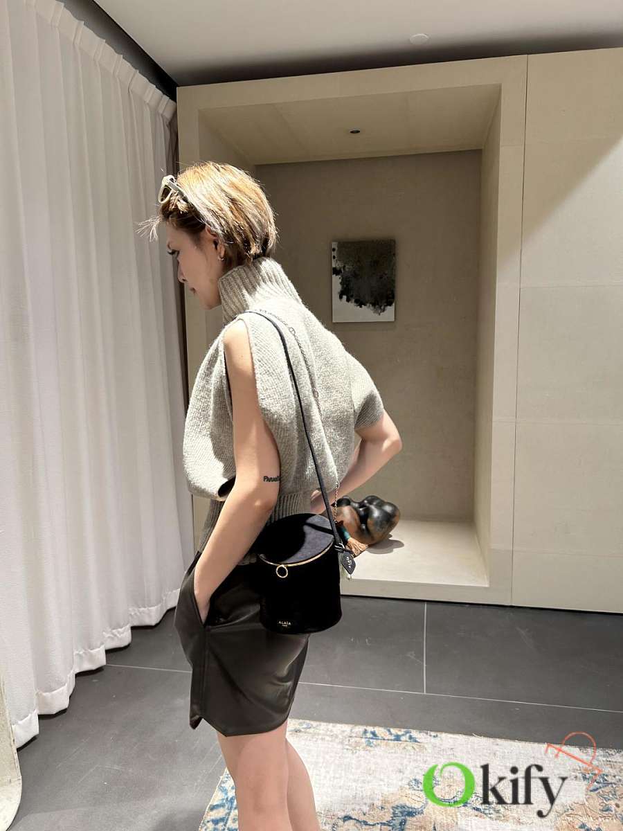 A must-have for fashionistas! The bag features a soft, rounded design with a slanted top and magnetic closure, adorned with a gold-tone metal ring. It also includes an adjustable shoulder strap, allowing for hand-carrying, underarm, or crossbody wear. Made from imported suede goatskin.