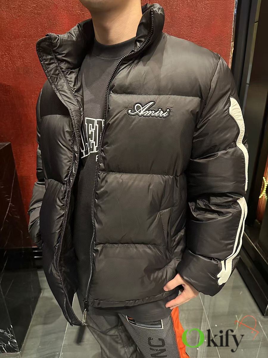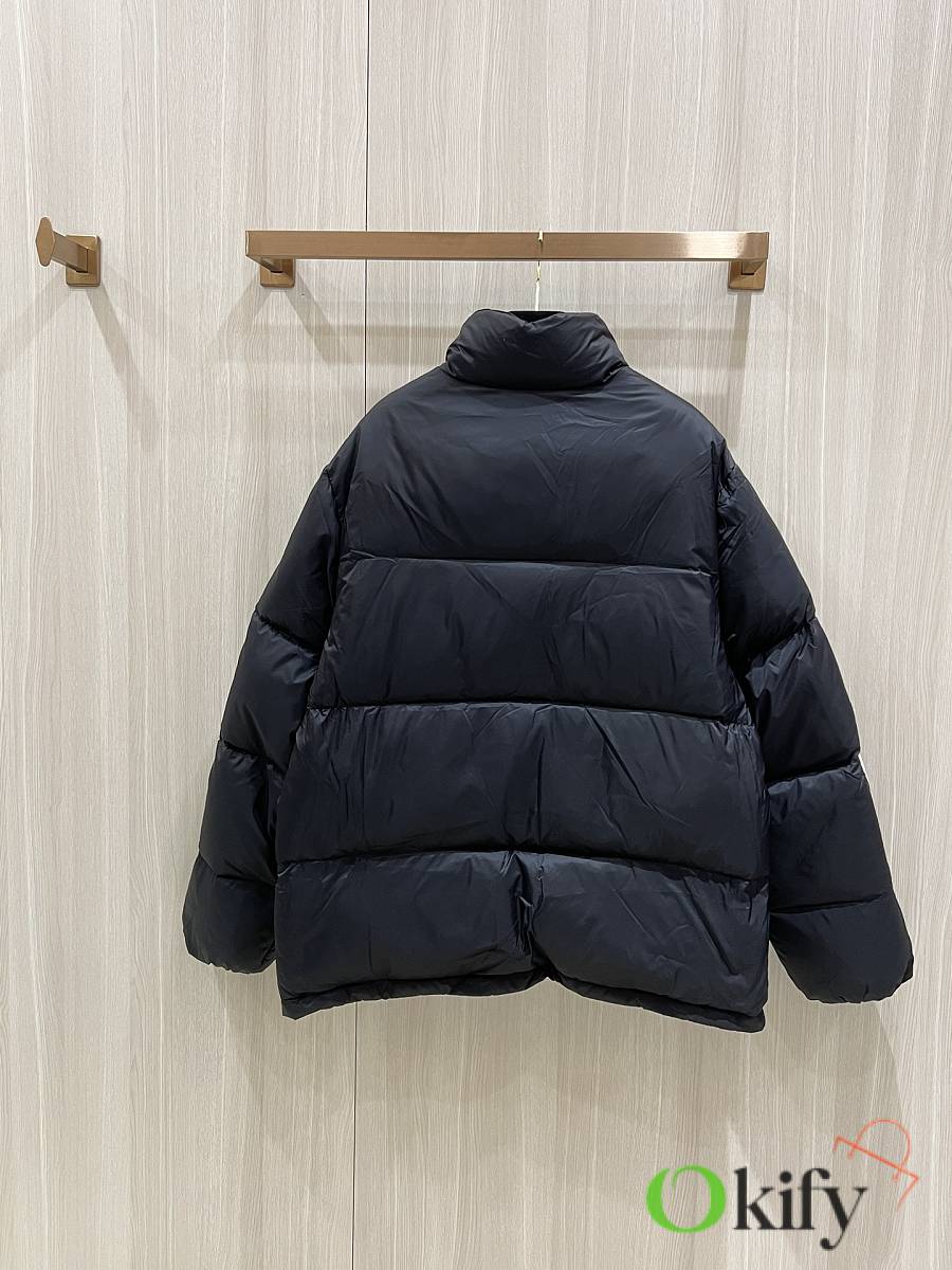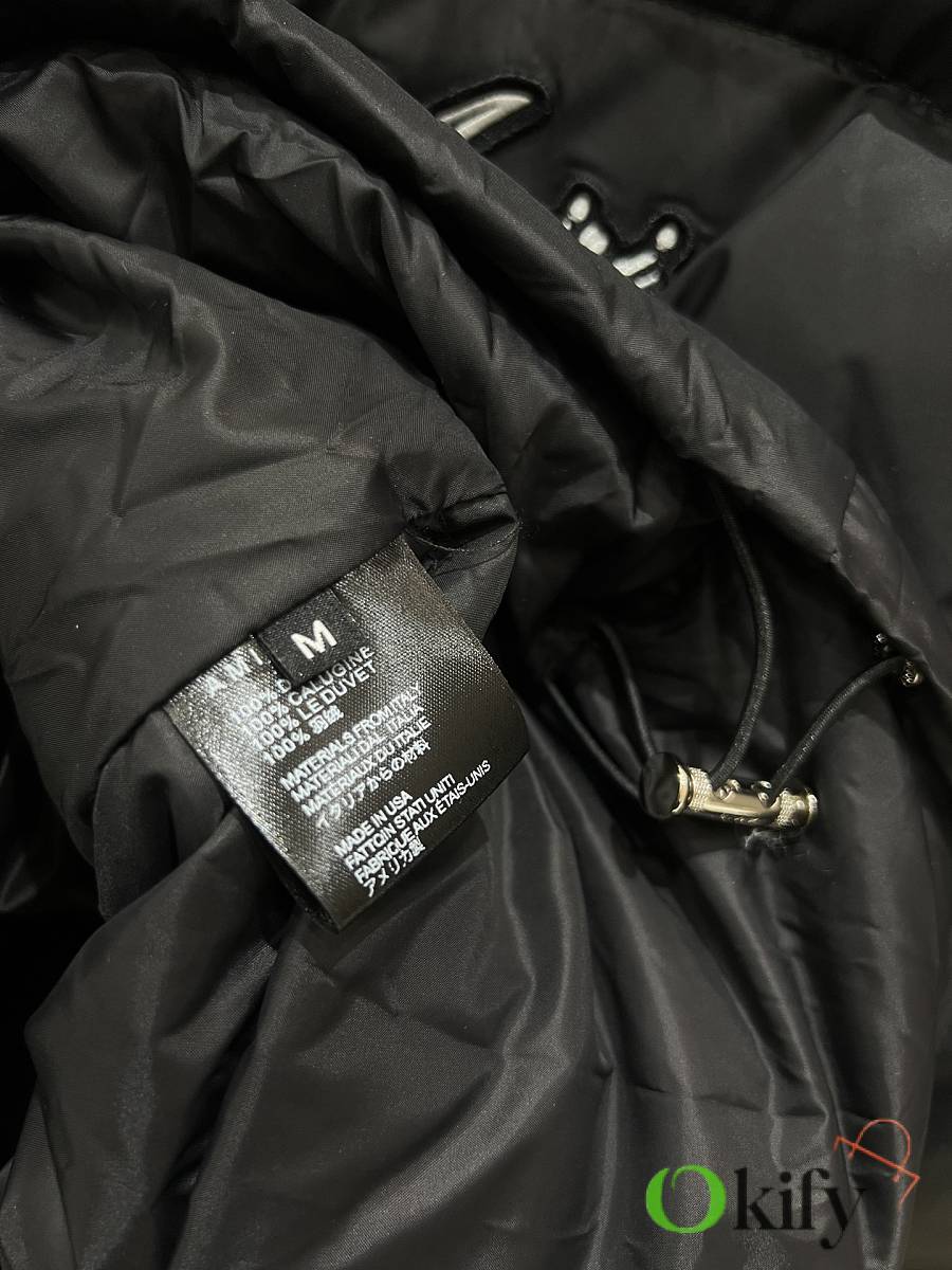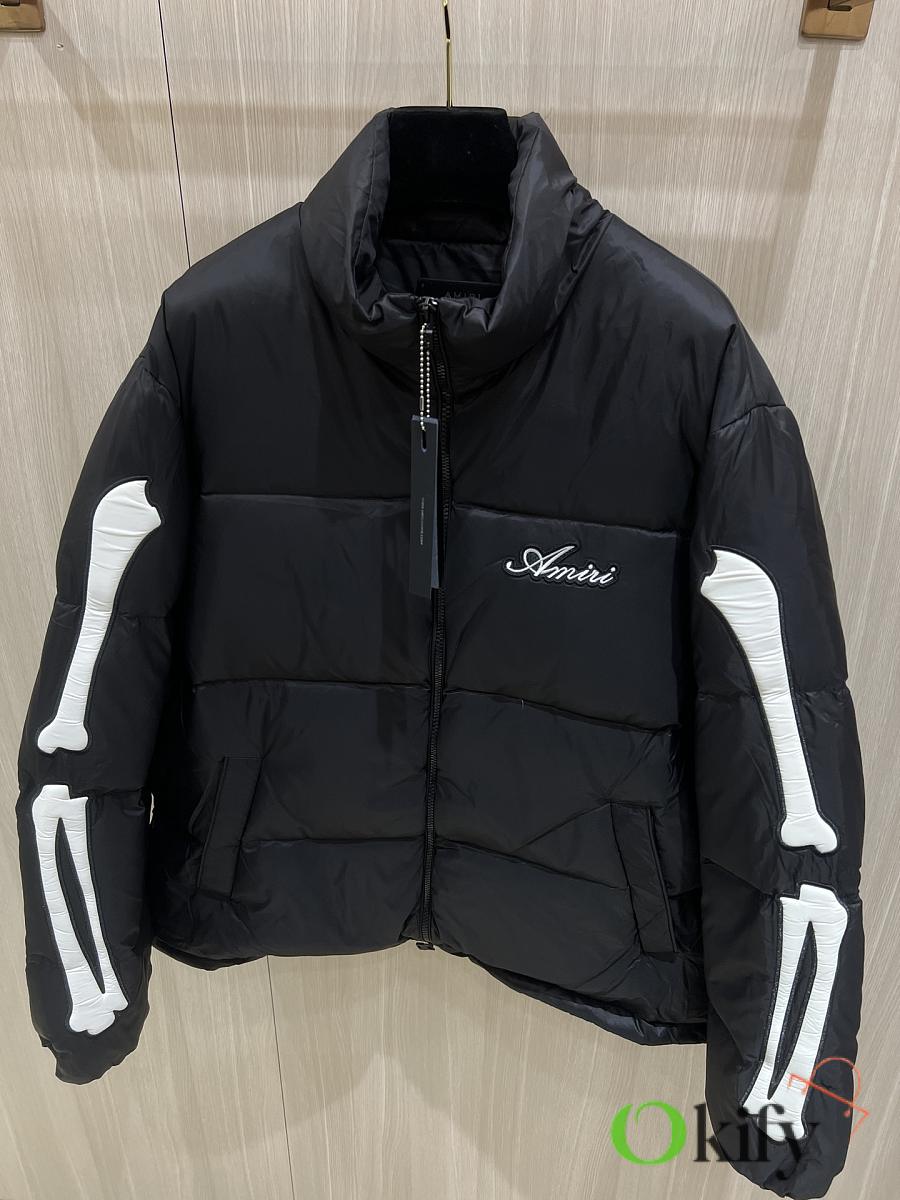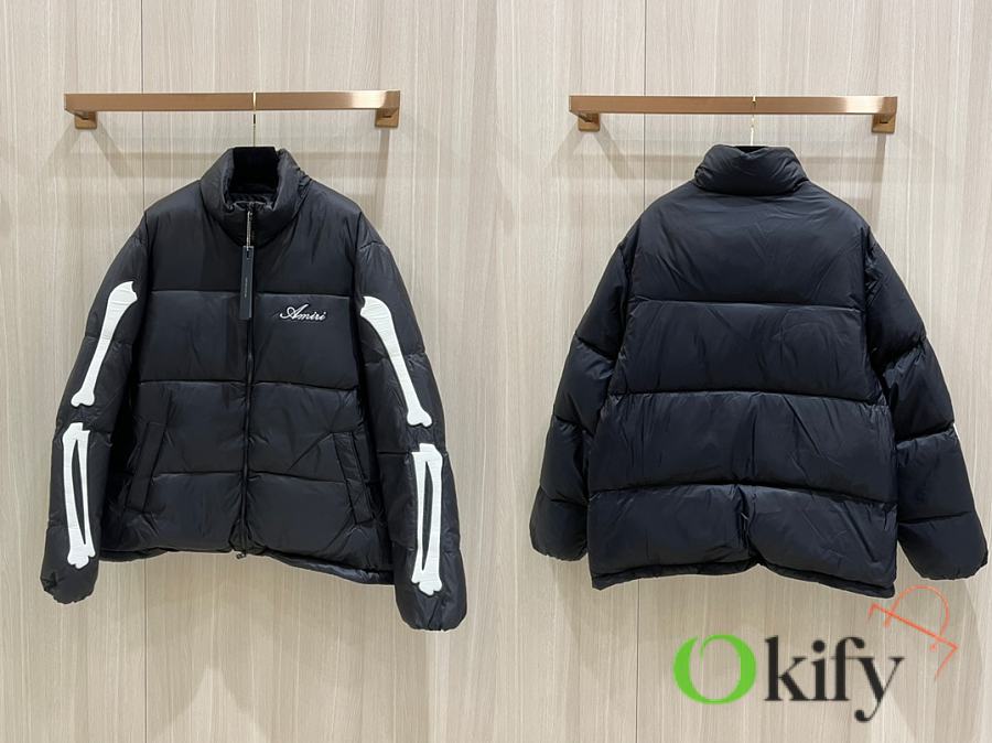 40D nylon fabric is light and durable. Nylon fabric is light and durable, making the down jacket light and not easy to damage, suitable for various outdoor activities and daily wear. The classic brand pattern white skeleton is cleverly integrated into the sleeves. This design element adds a unique personality to the down jacket. The white skeleton pattern contrasts sharply with the black down jacket, highlighting the design sense and showing the wearer's unique style.