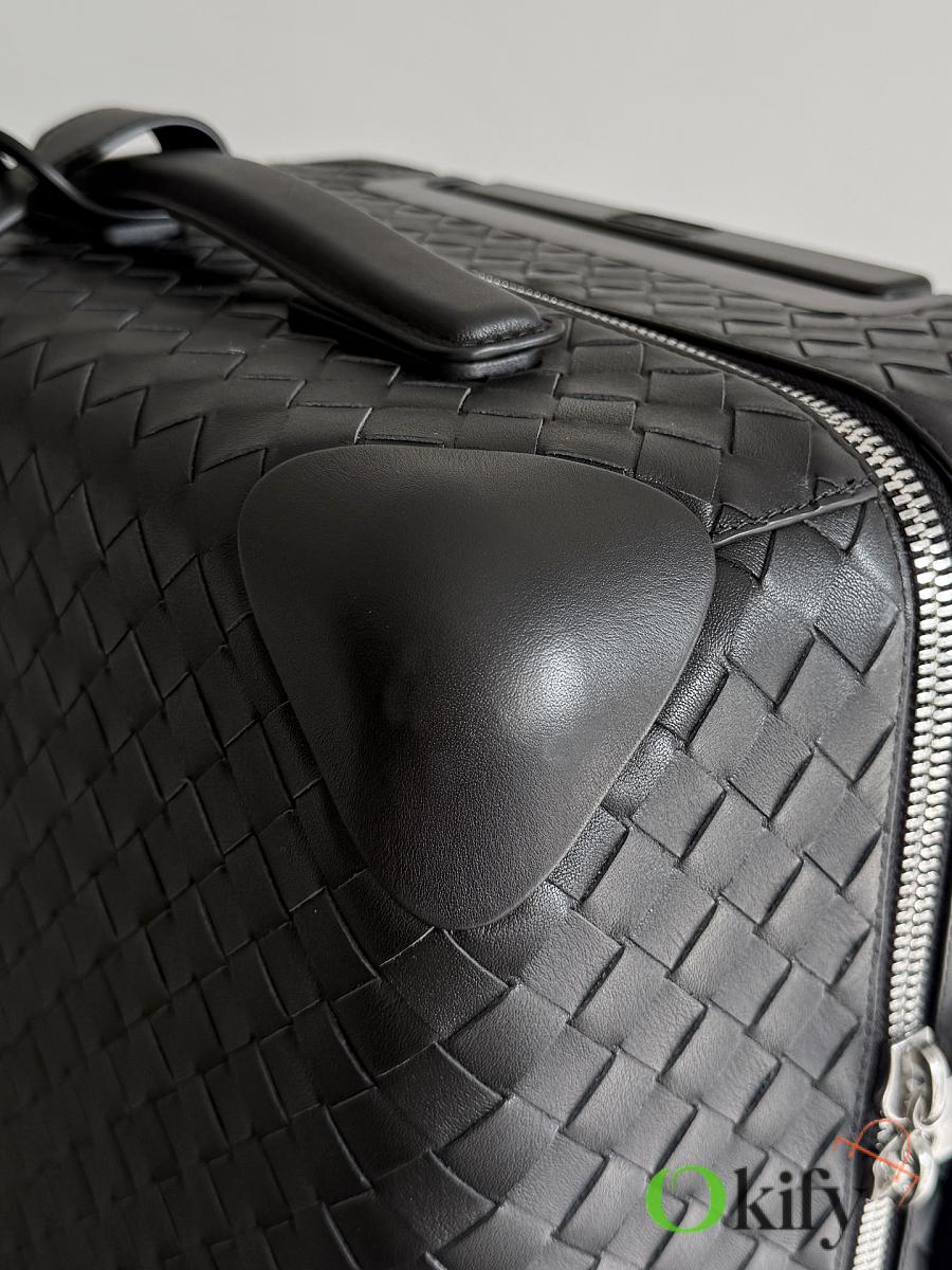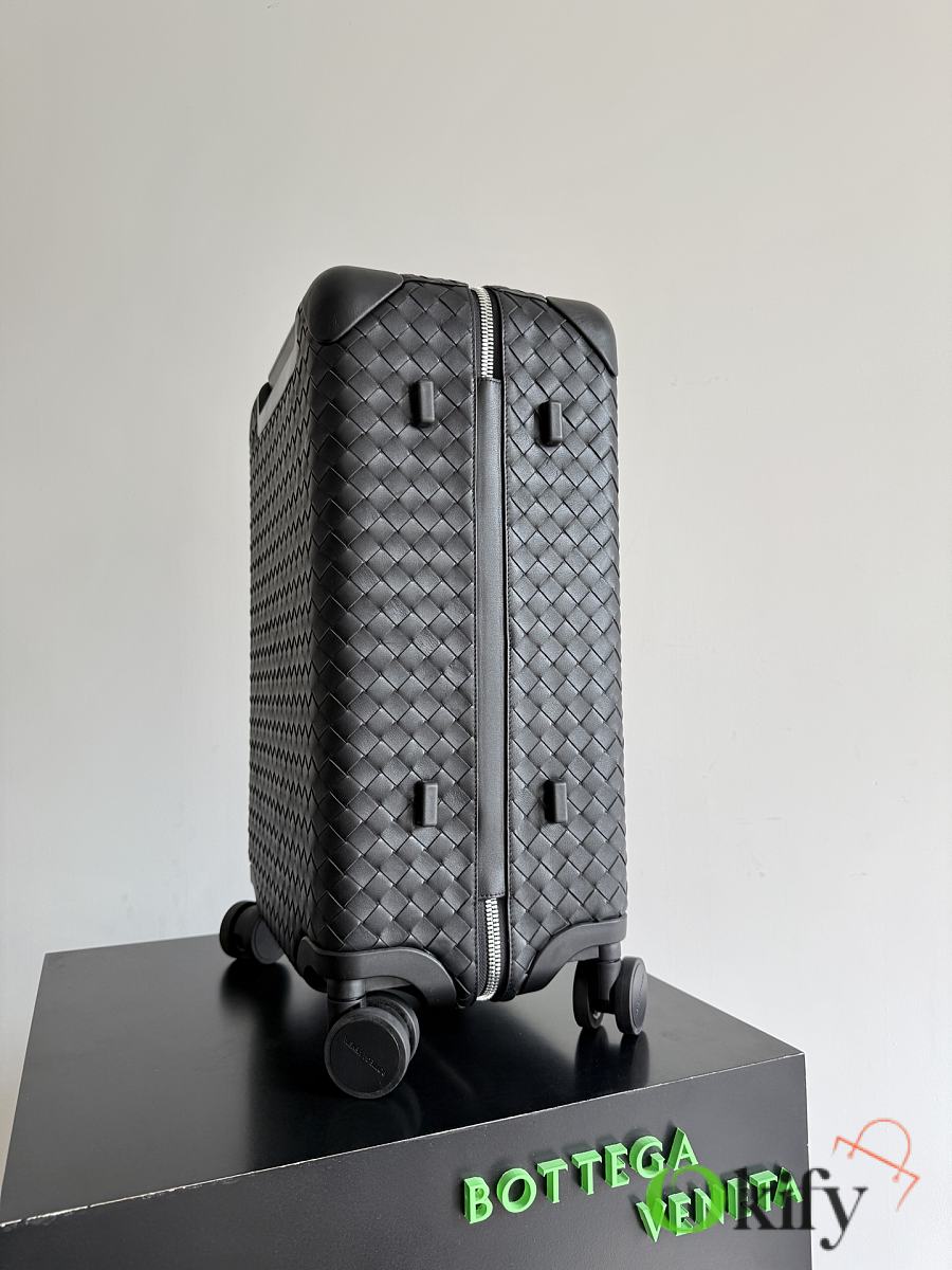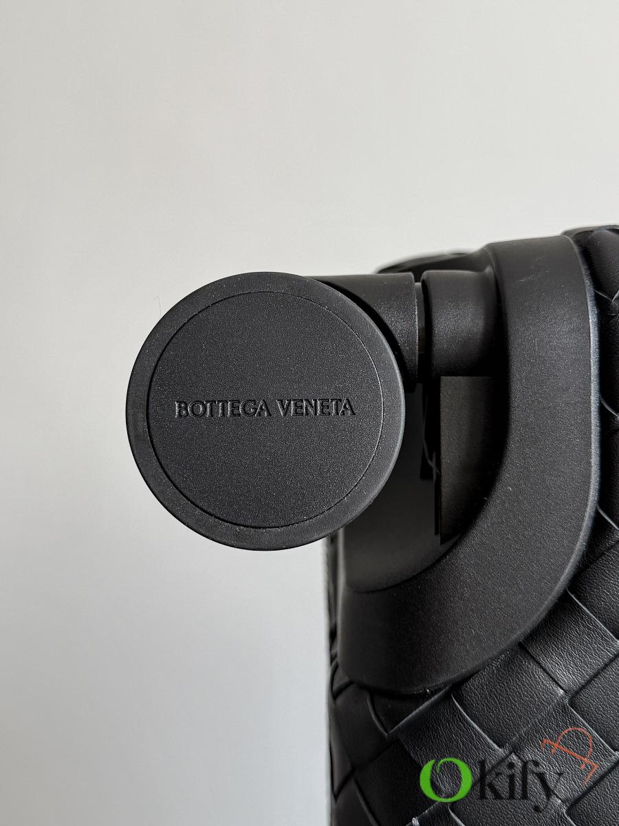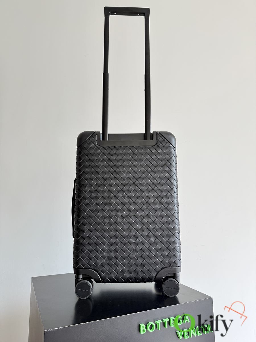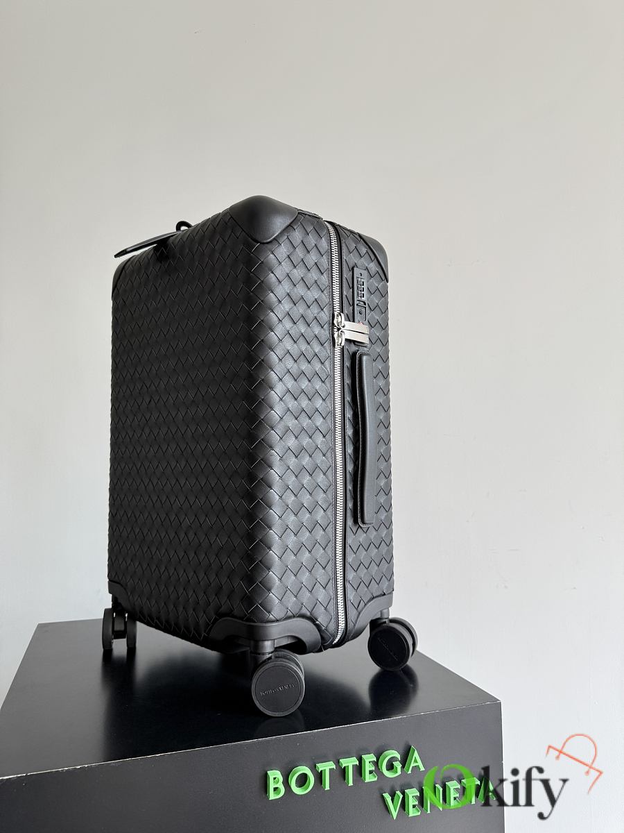 The Bottega Veneta Odyssey carry-on suitcase features an Intrecciato woven finish and a black calfskin leather-wrapped ABS shell, combining quality and durability. ✨ With a 38-liter capacity, it meets carry-on standards. The interior features a canvas lining and multiple compartments for convenient organization. Four 360° silent wheels and a retractable handle ensure smooth and effortless movement. A TSA lock provides security and practicality. Suitable for commuting or short trips, its understated luxury style exudes quality and taste