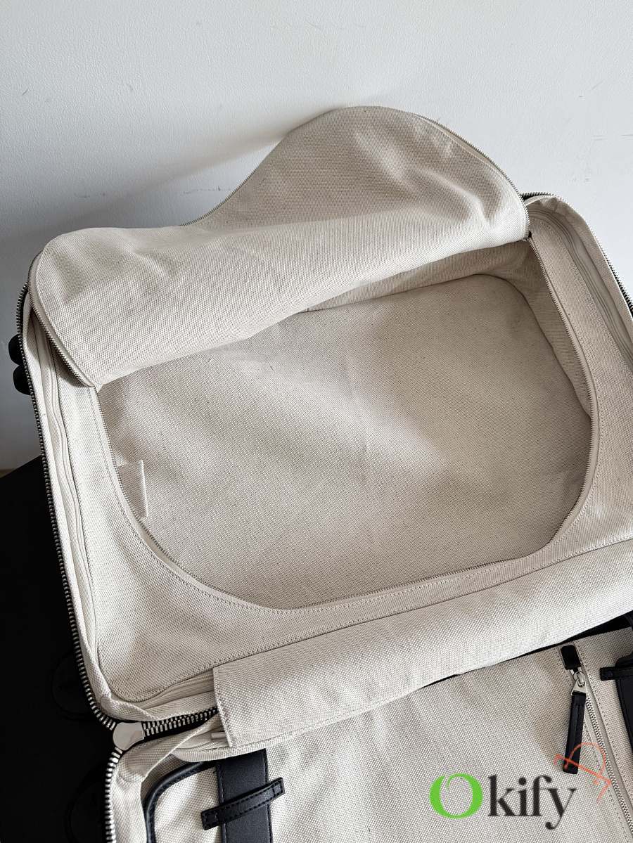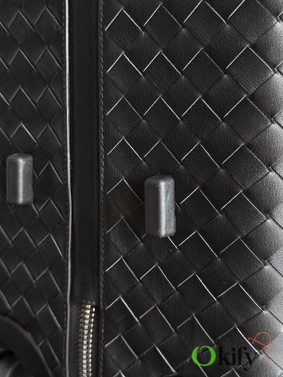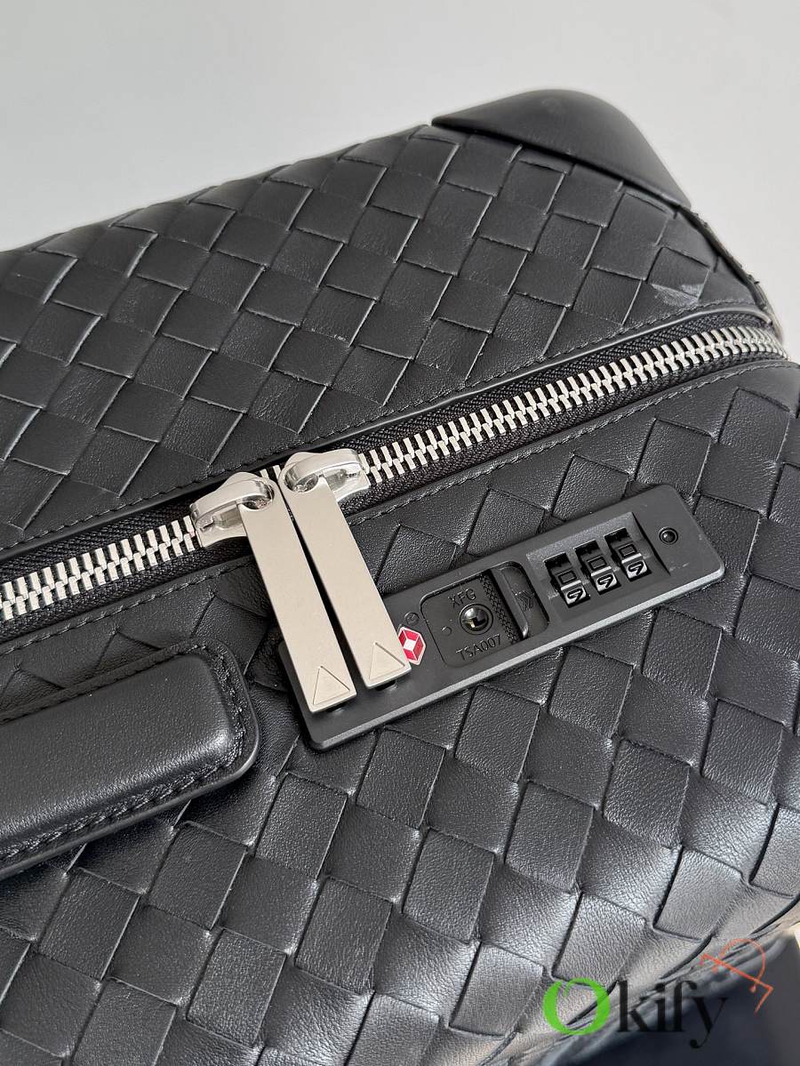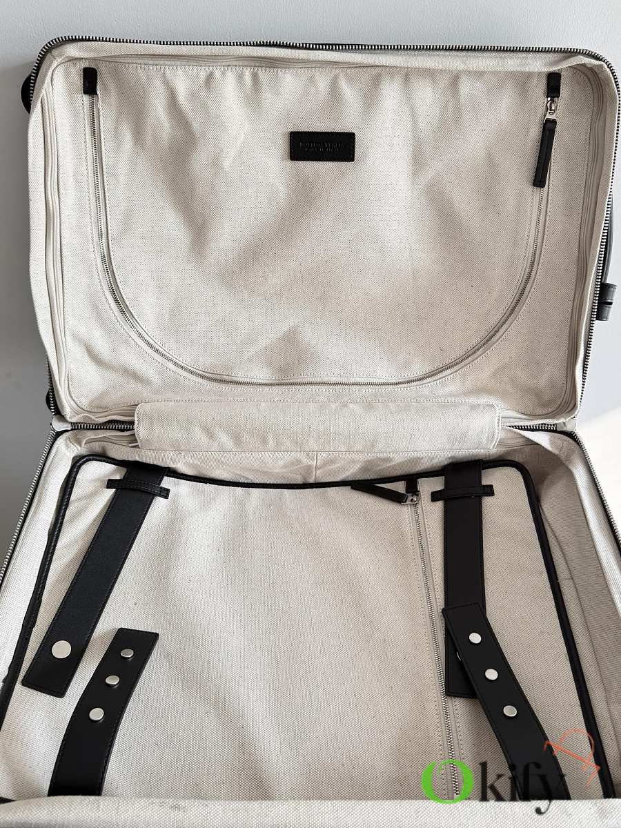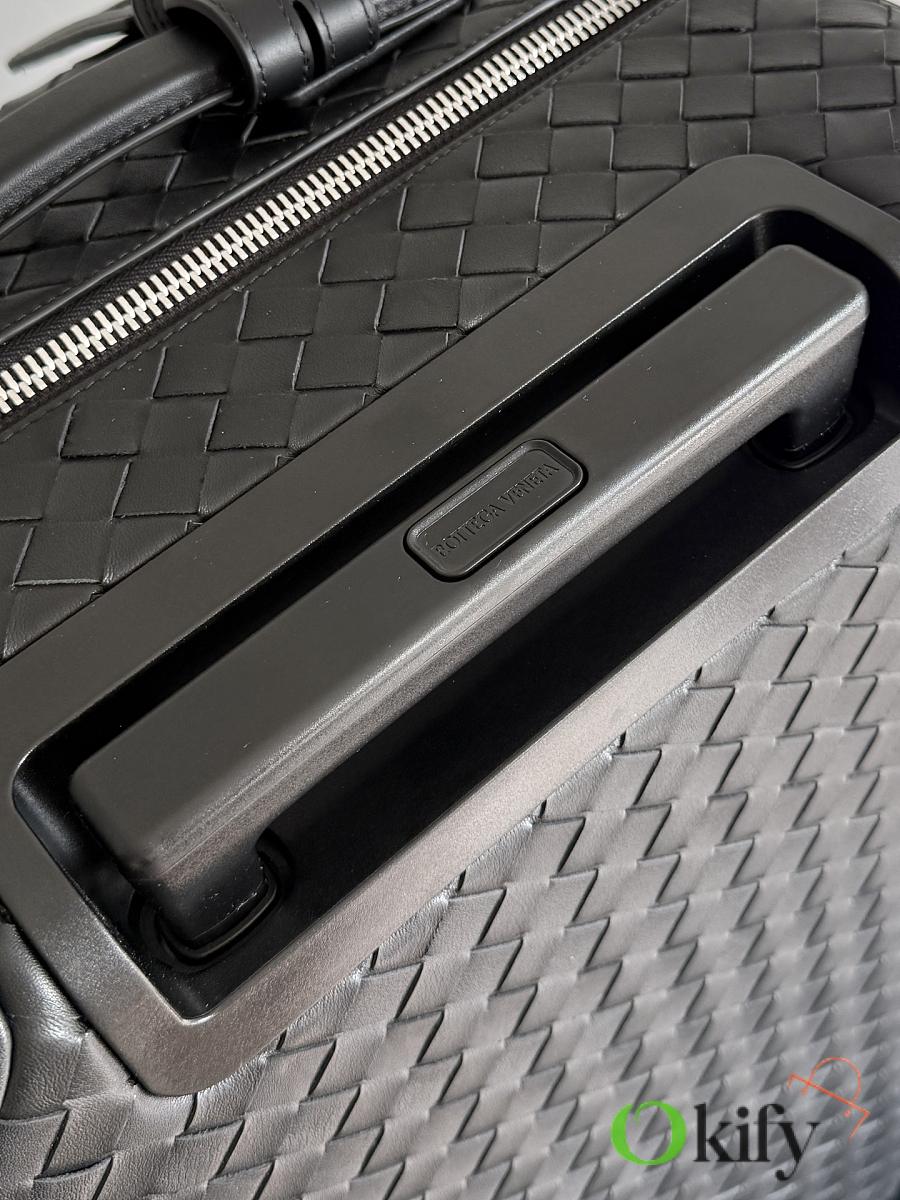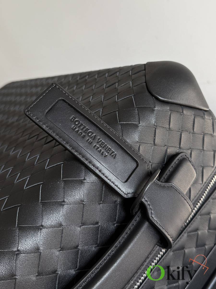 The Bottega Veneta Odyssey carry-on suitcase features an Intrecciato woven finish and a black calfskin leather-wrapped ABS shell, combining quality and durability. ✨ With a 38-liter capacity, it meets carry-on standards. The interior features a canvas lining and multiple compartments for convenient organization. Four 360° silent wheels and a retractable handle ensure smooth and effortless movement. A TSA lock provides security and practicality. Suitable for commuting or short trips, its understated luxury style exudes quality and taste