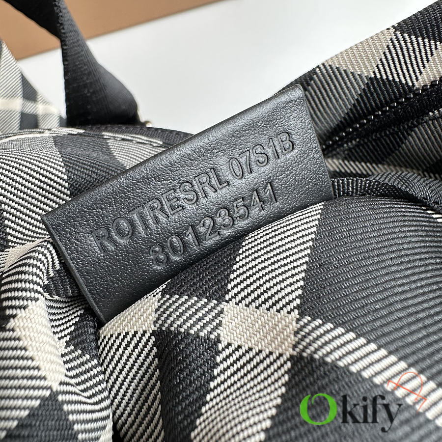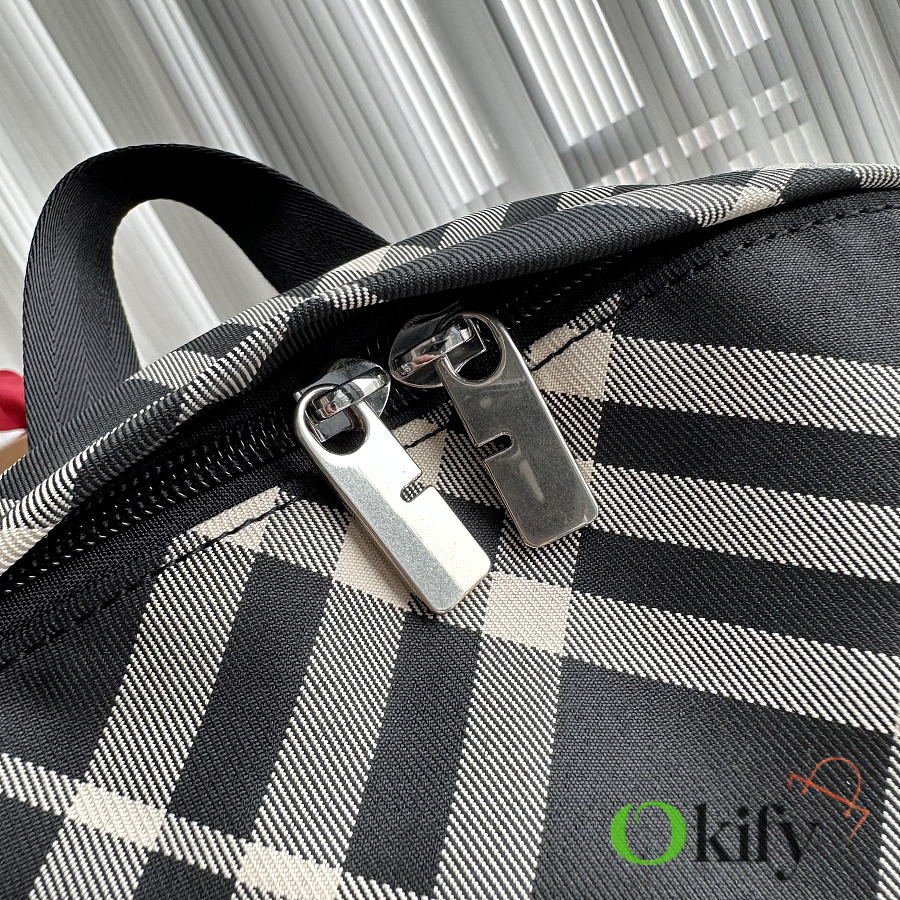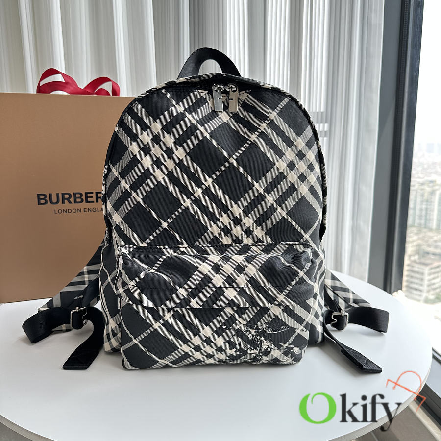 This latest backpack features a matching Burberry check waterproof lining adorned with an Equestrian Knight's Logo (EKD) appliqué. It includes a B-shaped zipper pull and a side pocket for easy water bottle storage. From Burberry's classic collection, this essential piece embodies the brand's signature style. Dimensions: 29 × 11 × 34cm. Model: 354160