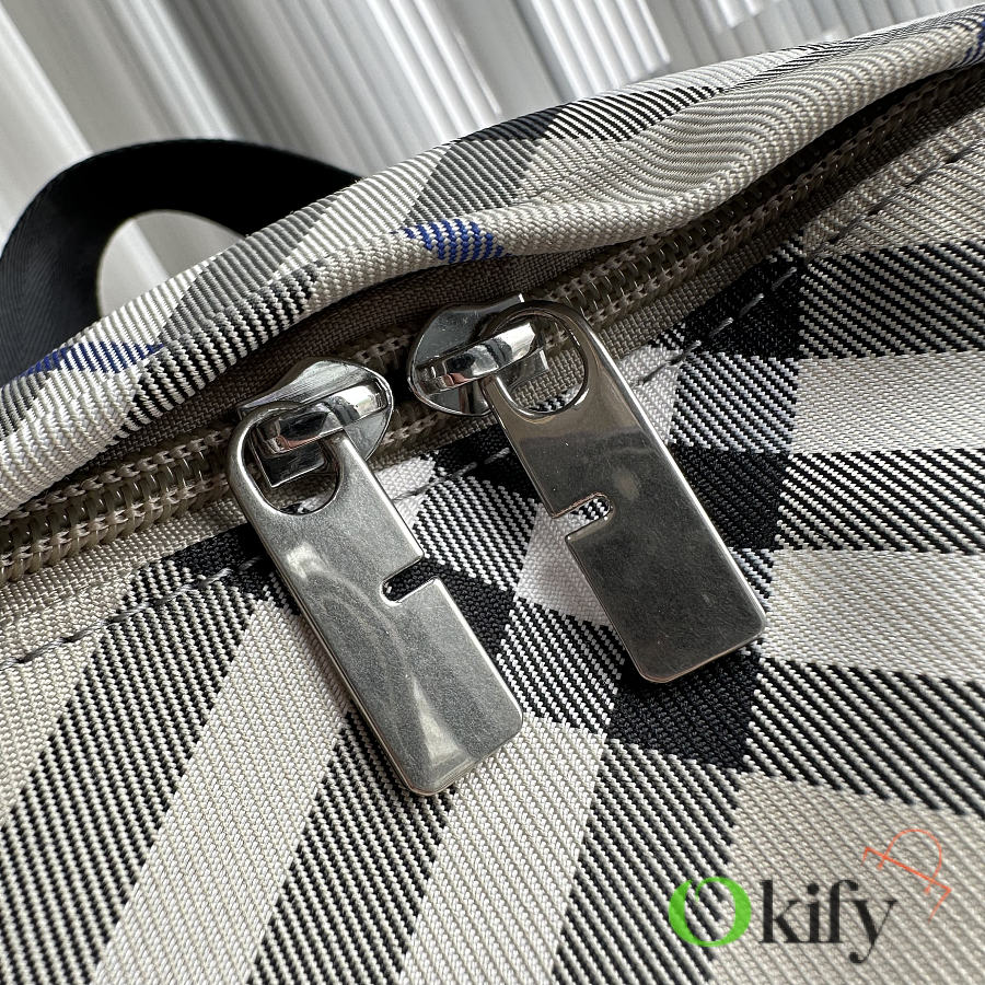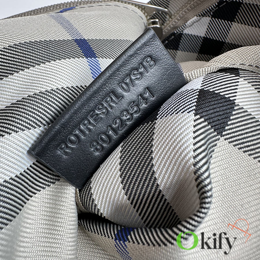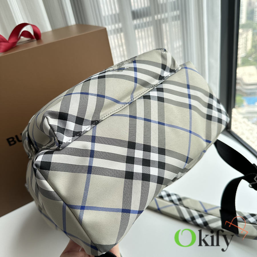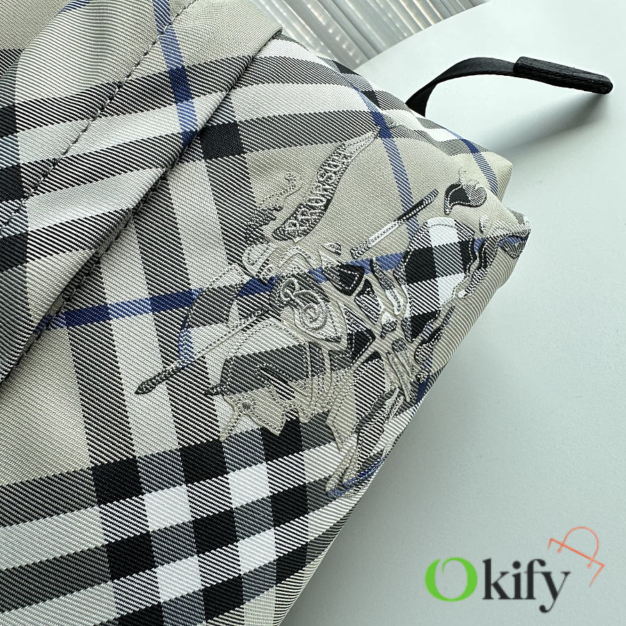 This latest backpack features a matching Burberry check waterproof lining adorned with an Equestrian Knight's Logo (EKD) appliqué. It includes a B-shaped zipper pull and a side pocket for easy water bottle storage. From Burberry's classic collection, this essential piece embodies the brand's signature style. Dimensions: 29 × 11 × 34cm. Model: 354160