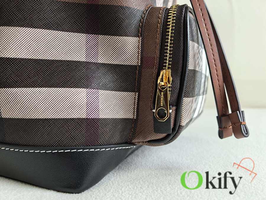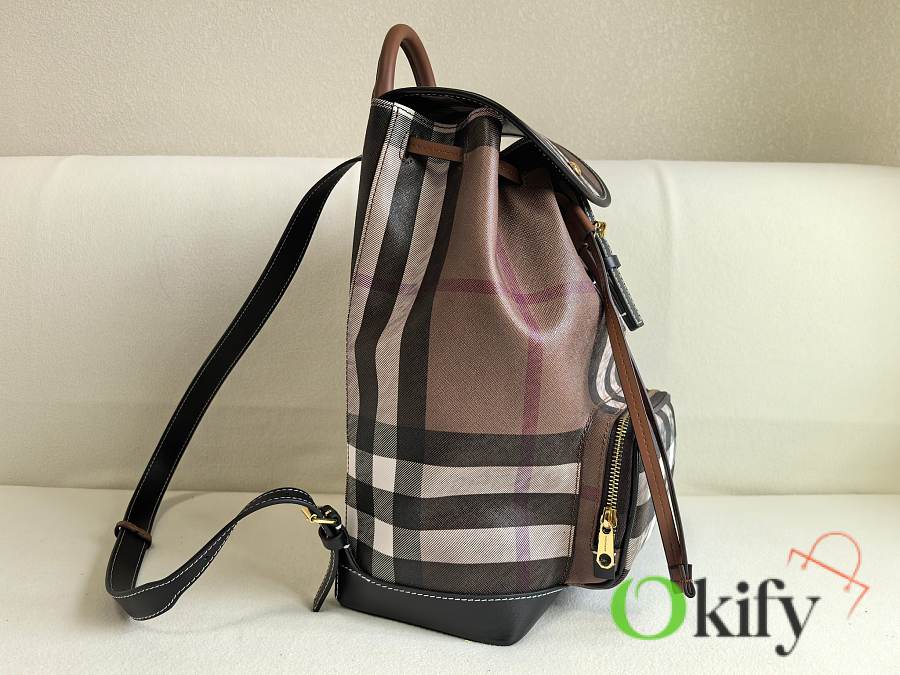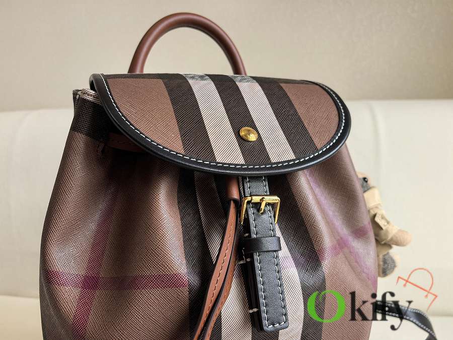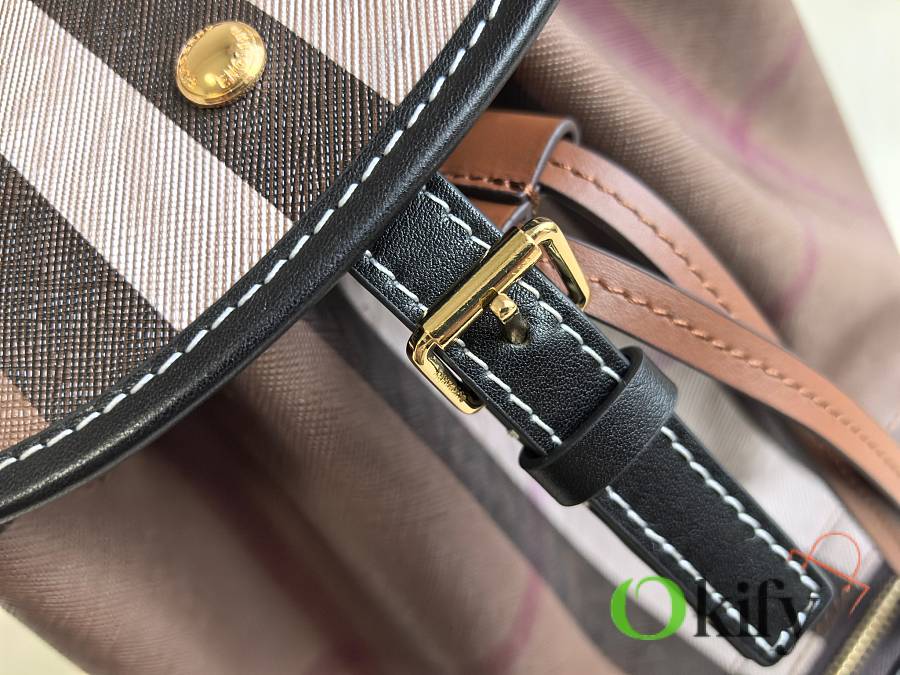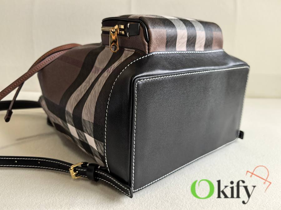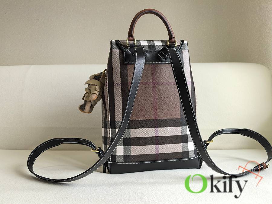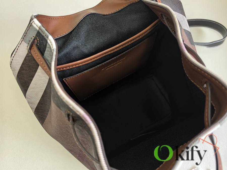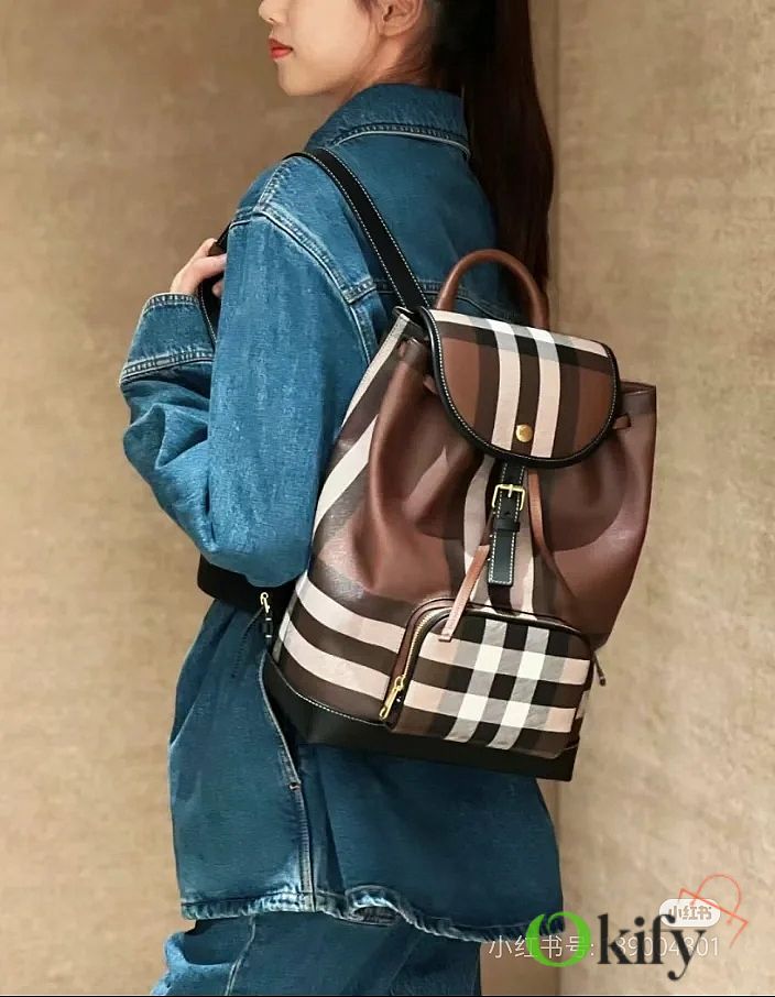 This classic check backpack is both retro and playful, making it incredibly appealing. Even after 10 years, it will still be a trendsetter, exuding the quintessential British Burberry style. Crafted in an Italian workshop, it features the Burberry check pattern with top-stitched leather trim and a cotton-blend lining. It boasts a drawstring closure, a leather top handle, and a front zip pocket. Made with imported calfskin leather.