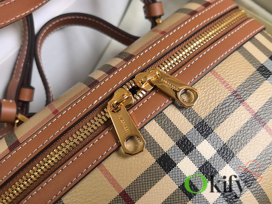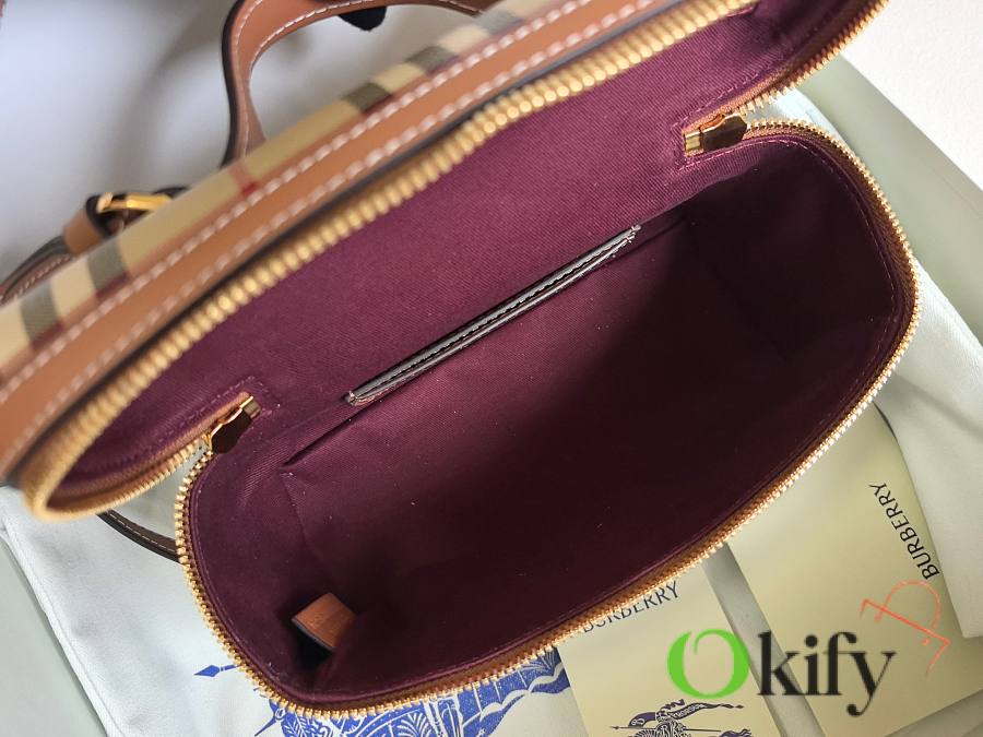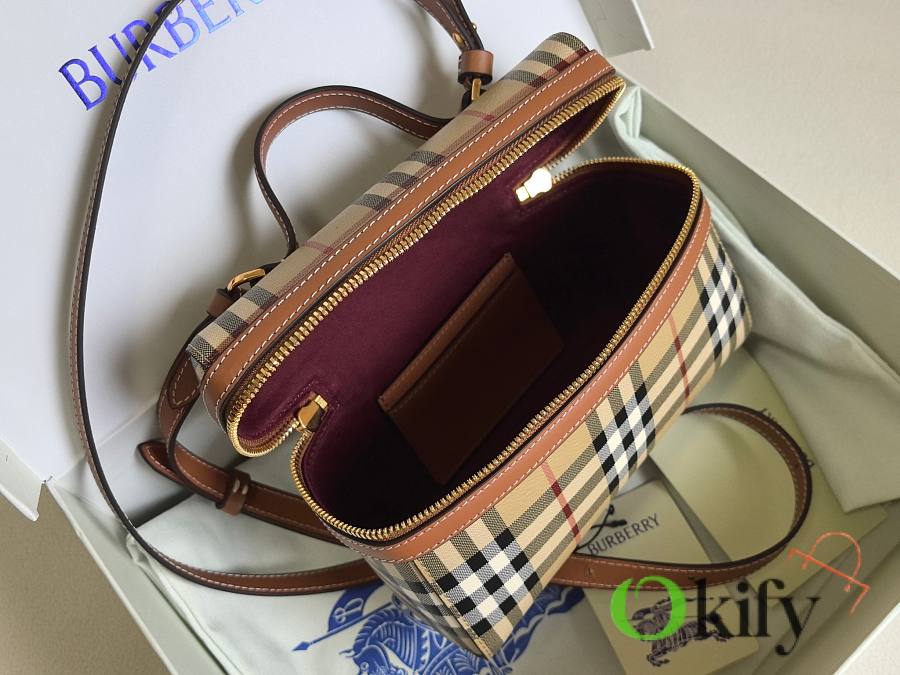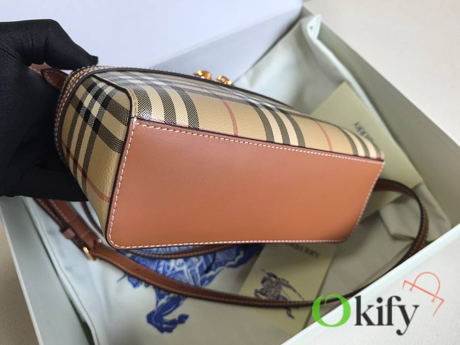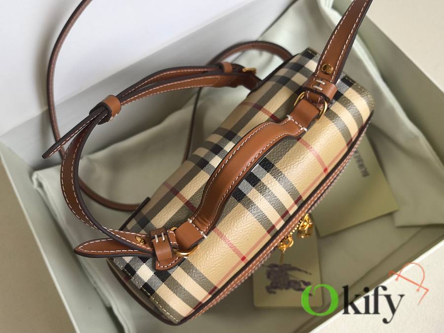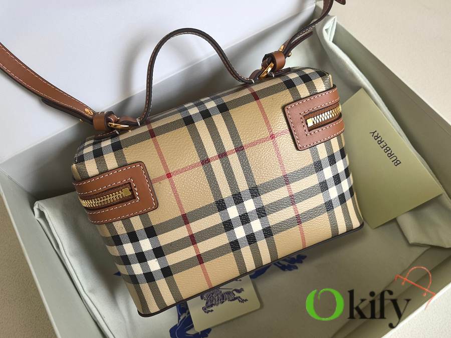 This new, exquisite bag is crafted from a cotton-blend fabric and handcrafted in Italian workshops. Adorned with a Burberry check print in a signature classic beige, it features topstitched calfskin trim. The structured shape, inspired by a vanity box, reveals a separate main compartment when opened. It can be carried by the top handle or worn crossbody or over the shoulder with the detachable shoulder strap.