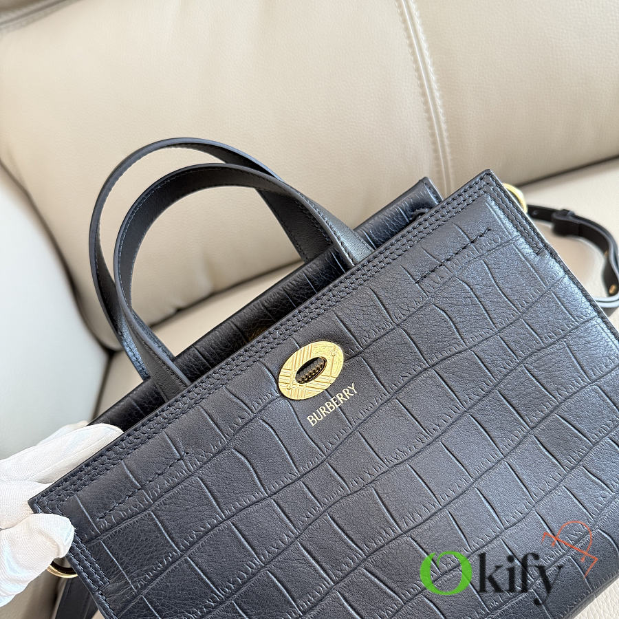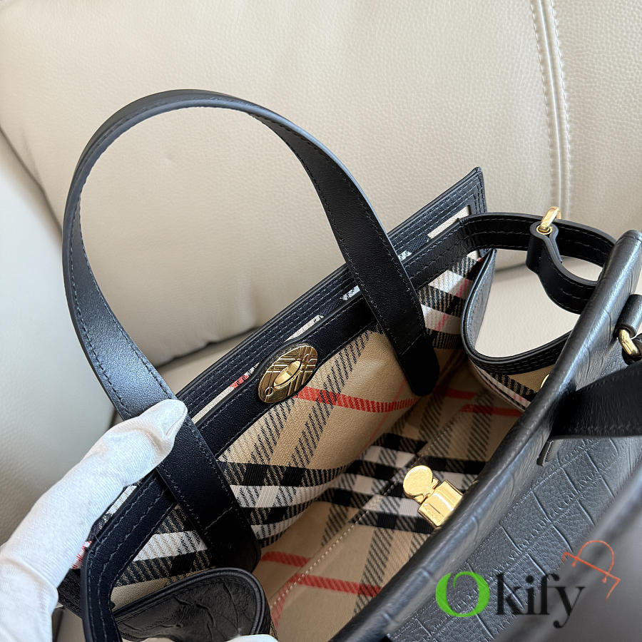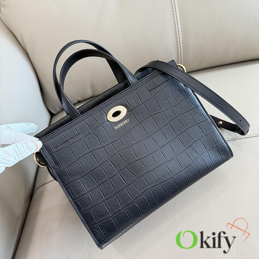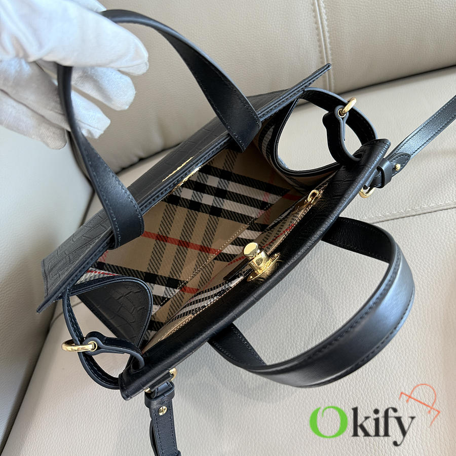 The latest timeless design from Burberry, the Cotswolds tote bag, is crafted from crocodile-embossed leather and handcrafted in Italian workshops. It features a cotton-blend lining, finely woven with the iconic beige Burberry check. The sophisticated design incorporates a check-patterned closure. Featuring D-ring hardware, inspired by the belt design of the brand's classic trench coat. Can be carried by hand or worn over the shoulder with the shoulder strap