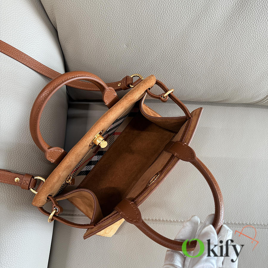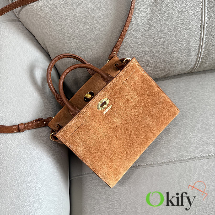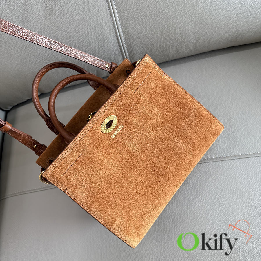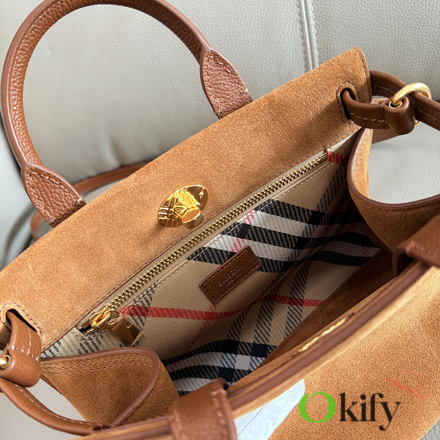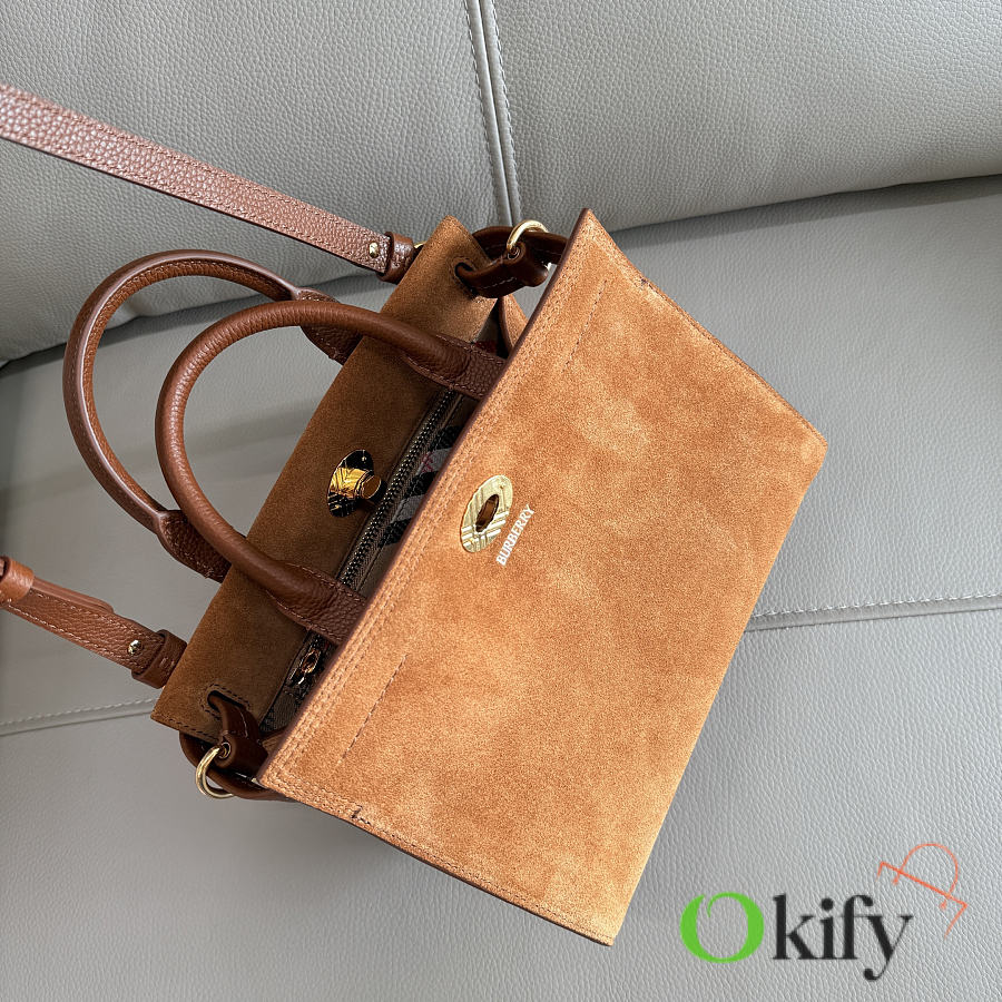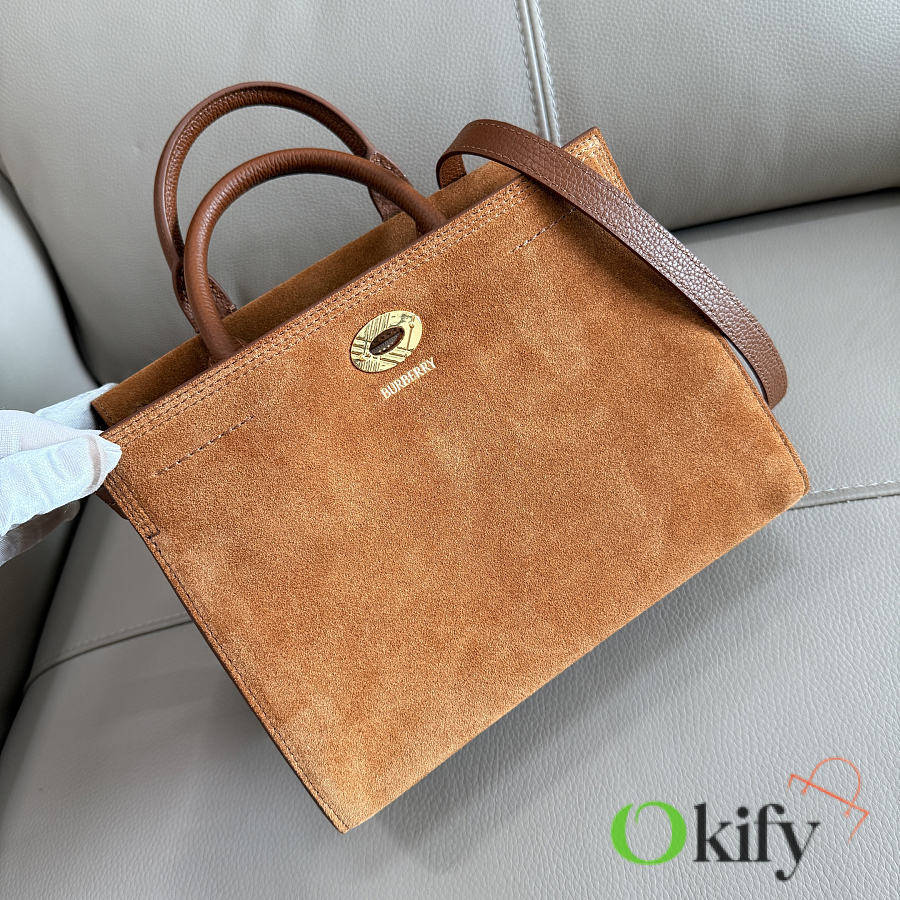 The timelessly designed Cotswolds tote bag is crafted from suede and handmade in Italian workshops. It undergoes a meticulous finishing process for a soft touch. The partially lined interior is made from a cotton blend, finely woven with the iconic beige Burberry check pattern. The sophisticated design incorporates a check-engraved closure and snap-on hardware, inspired by the belt design of the brand's iconic trench coat. It can be carried by hand or over the shoulder using the shoulder strap