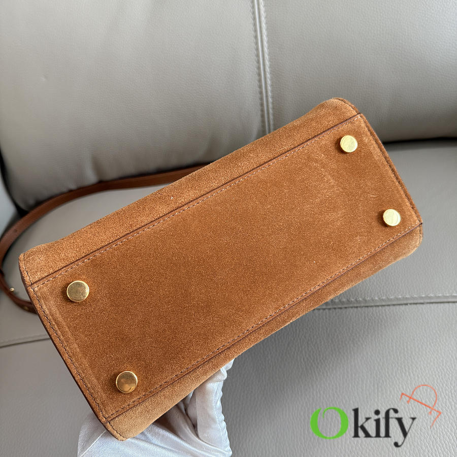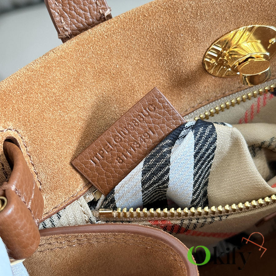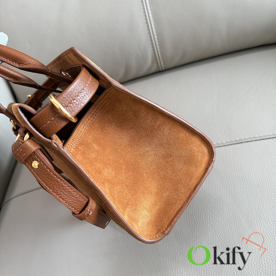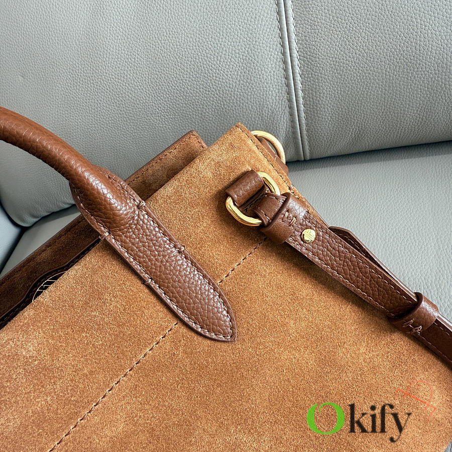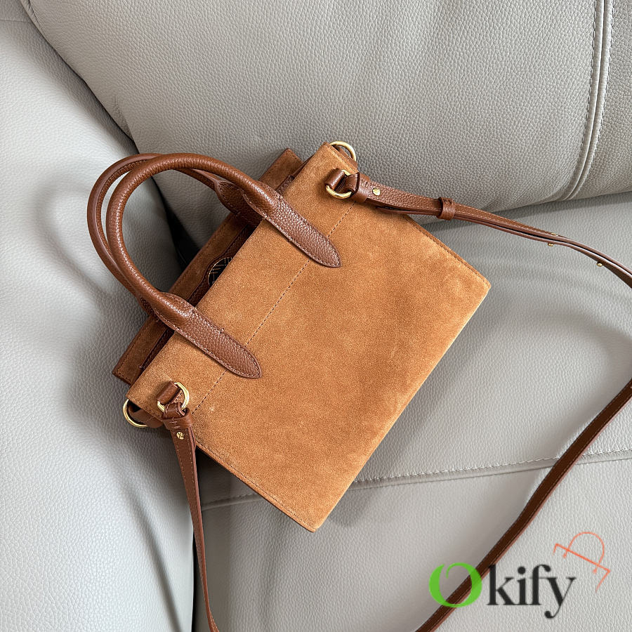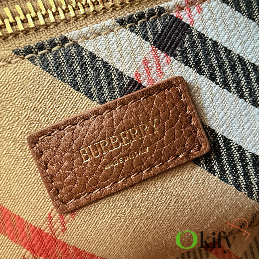 The timelessly designed Cotswolds tote bag is crafted from suede and handmade in Italian workshops. It undergoes a meticulous finishing process for a soft touch. The partially lined interior is made from a cotton blend, finely woven with the iconic beige Burberry check pattern. The sophisticated design incorporates a check-engraved closure and snap-on hardware, inspired by the belt design of the brand's iconic trench coat. It can be carried by hand or over the shoulder using the shoulder strap