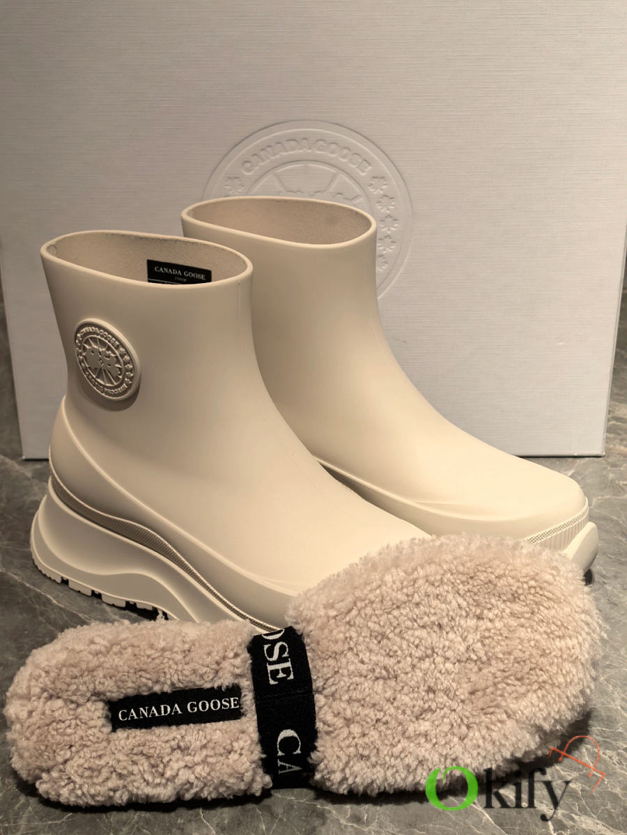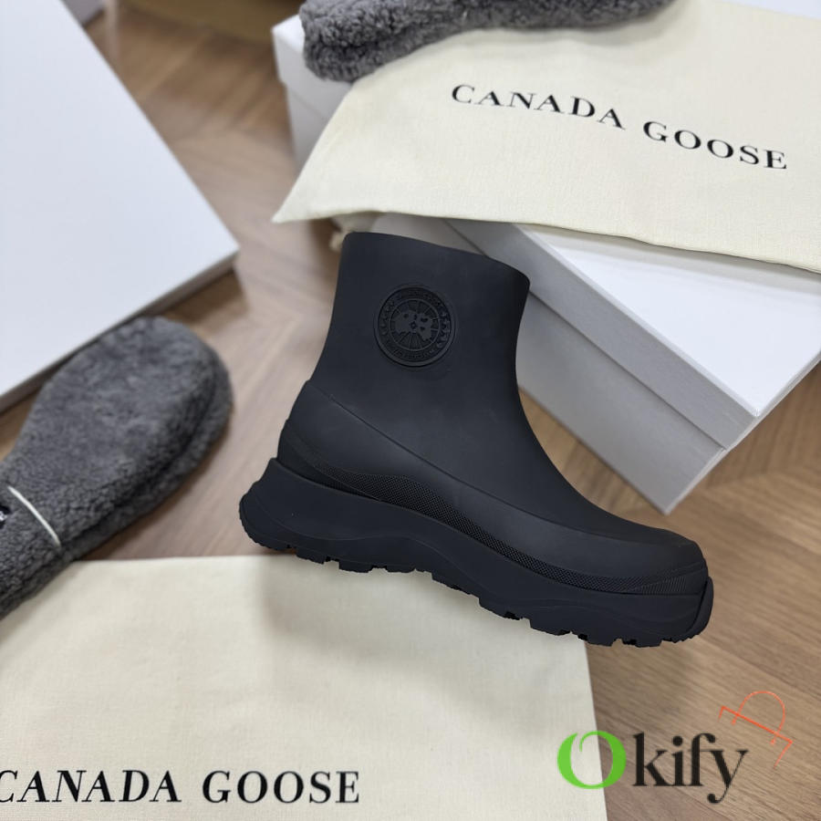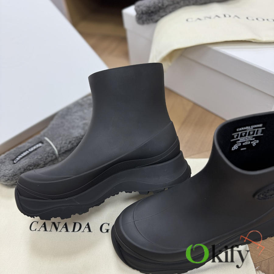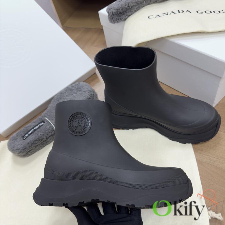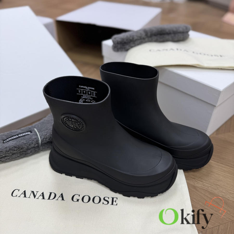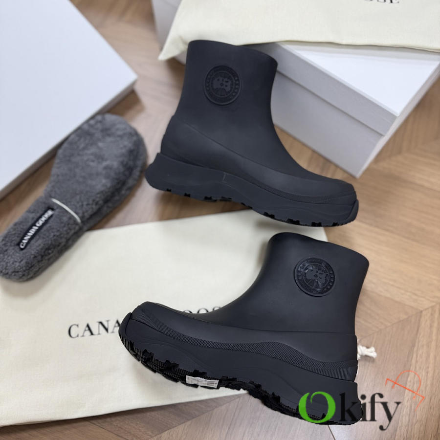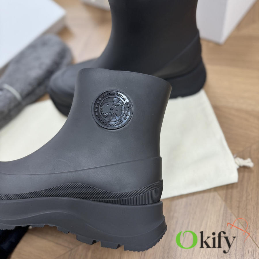 Canada Goose Vancouver Women's Rain Boots Made of 100% waterproof PU material, these shoes feature a simple upper with a classic badge for a premium feel. The thick rubber sole provides excellent grip, suitable for various terrains. They come with a removable winter insole, making them suitable for all seasons. The moderate boot height and pull tab design make them easy to put on and take off, combining style and practicality. Perfect for rainy days, outdoor activities, or daily commutes, they also pair well with casual wear, effortlessly enhancing your look. The molded upper lining is made of a wool blend fabric, providing both warmth and comfort. higher Comes with two pairs of insoles Insole 1 (inside the boot) - Features a shearling lining for enhanced warmth. Insole 2 (inside the box) - OrthoLite® insoles for added comfort Lightweight PU midsole with excellent durability and grip