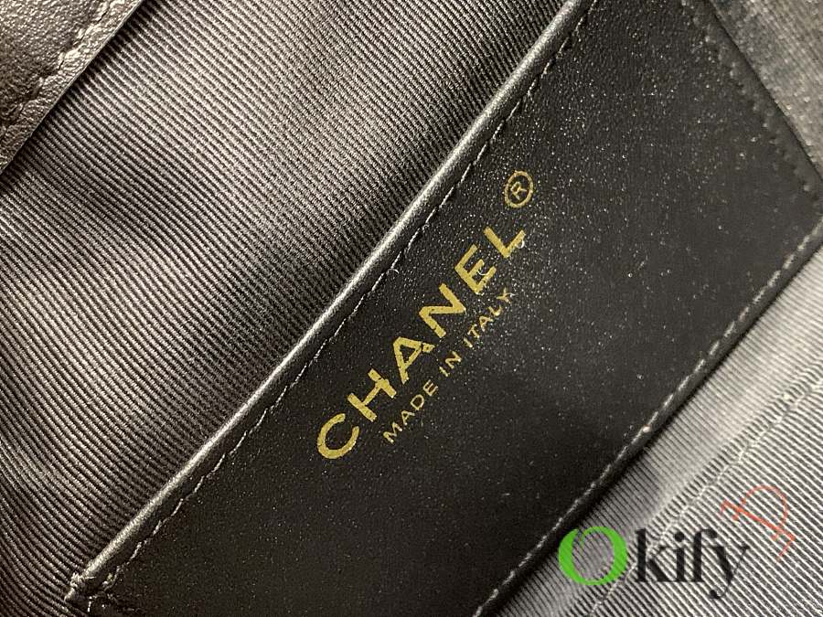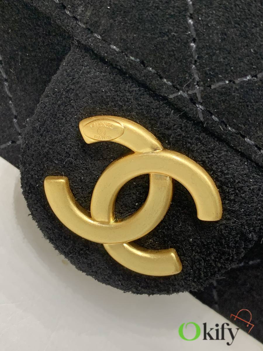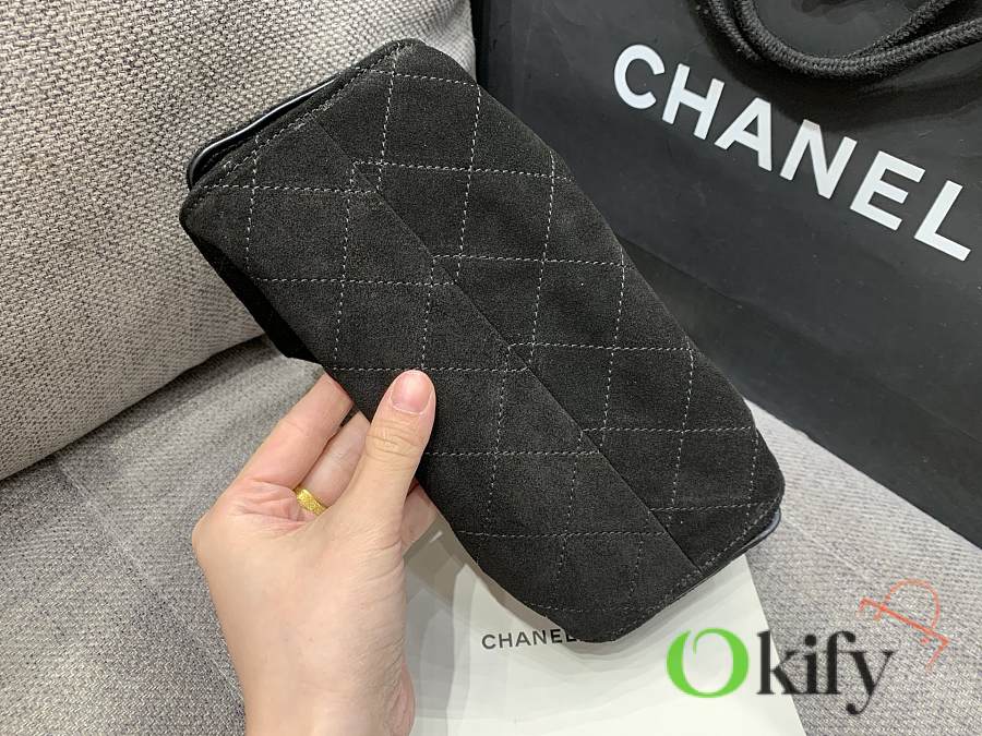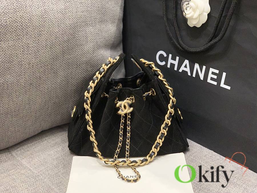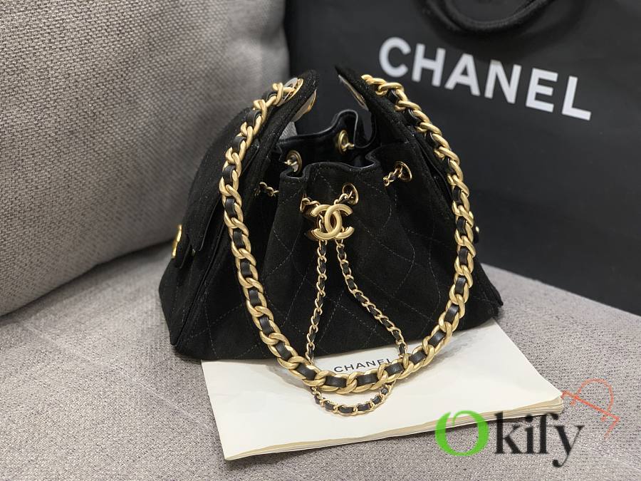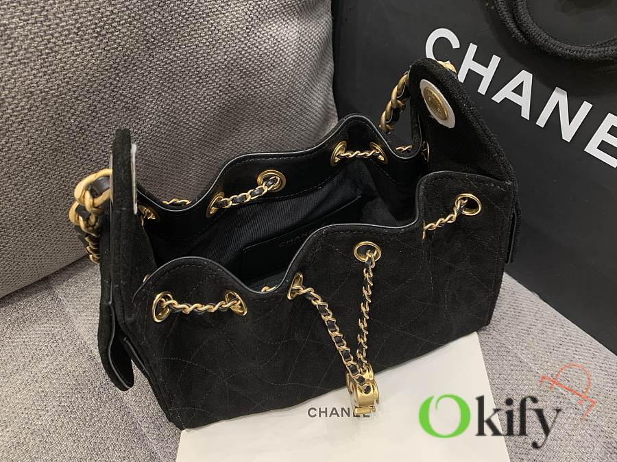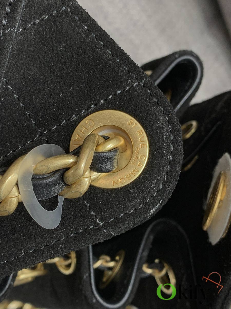 I fell in love at first sight with the 25cHOBO Bag. This mini upgraded version, made of suede, is a hot item this season. The adjustable chain transforms it into a bucket bag, a perfect size for practicality. Two small pockets on the inside are ideal for carrying your phone or passport, making it a versatile piece. It's spacious enough and looks quite cool.