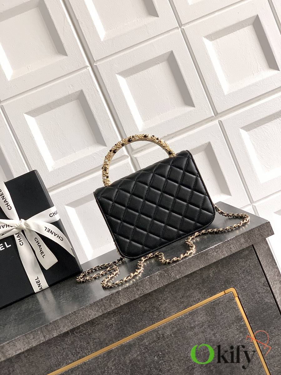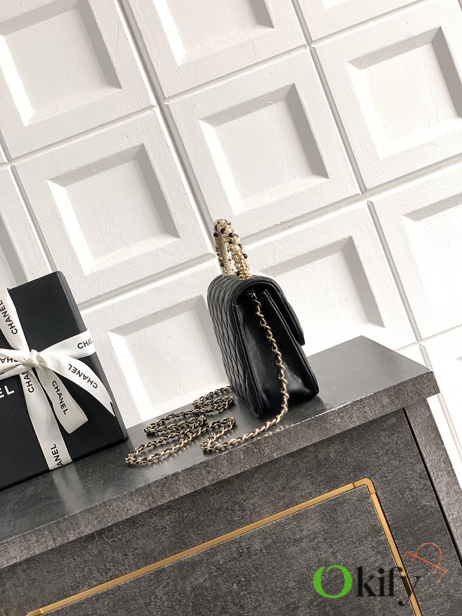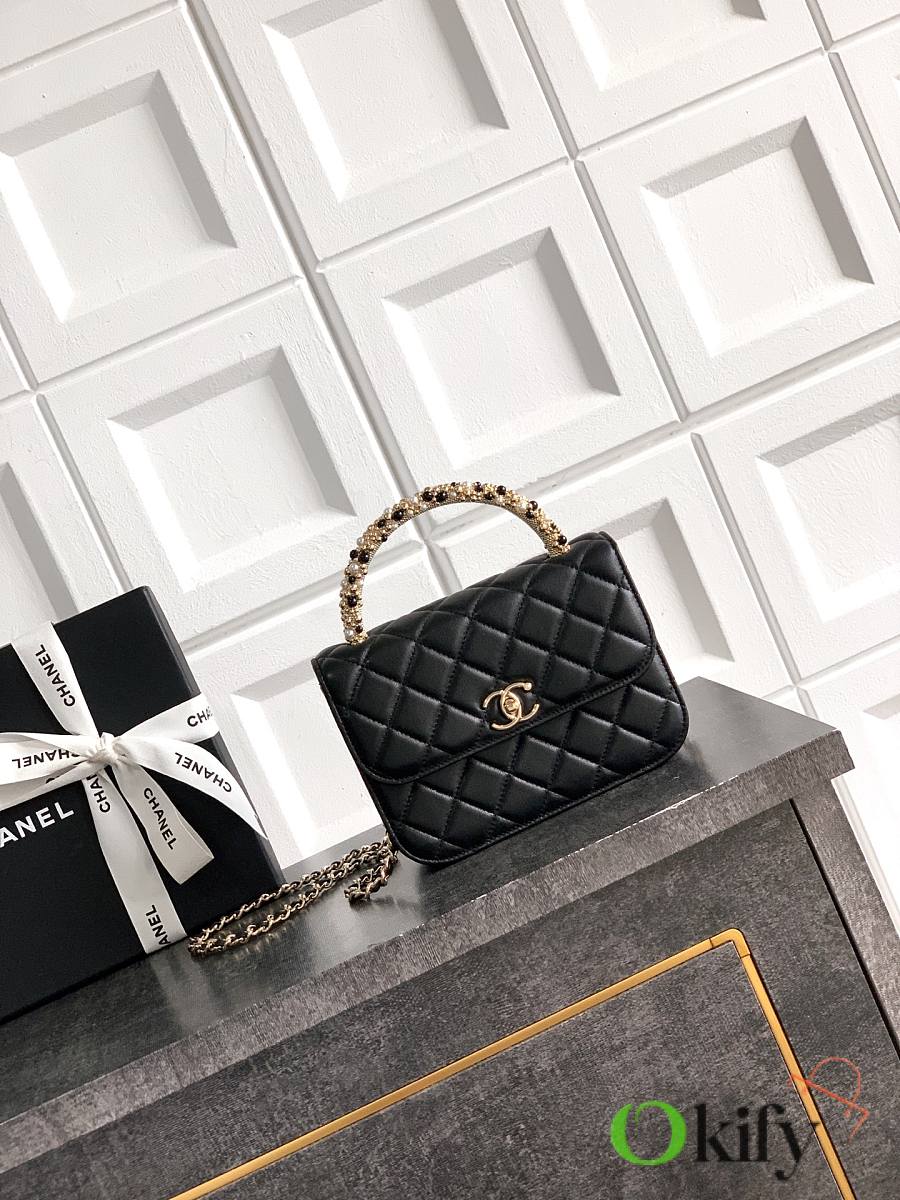 Champagne gold pebbled leather with classic quilted pattern and a highly recognizable double-C metal logo! The handle is adorned with pearls and black beads, exuding sophistication and elegance. Mini size, can be carried by hand or worn crossbody, perfect for everyday outings or parties. The interior, though small, is well-organized, easily holding a phone and lipstick. Practical and stylish, a super hot item!