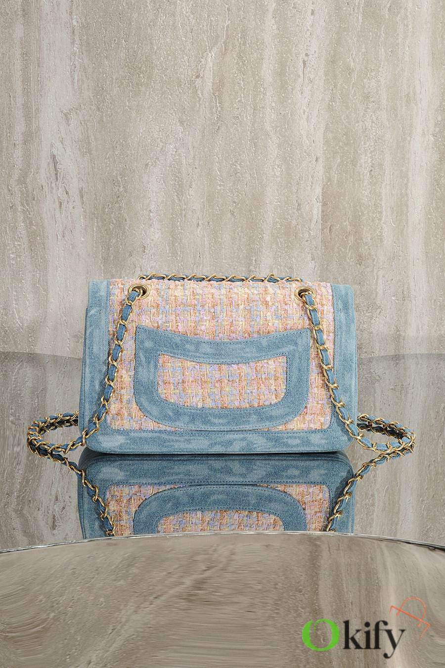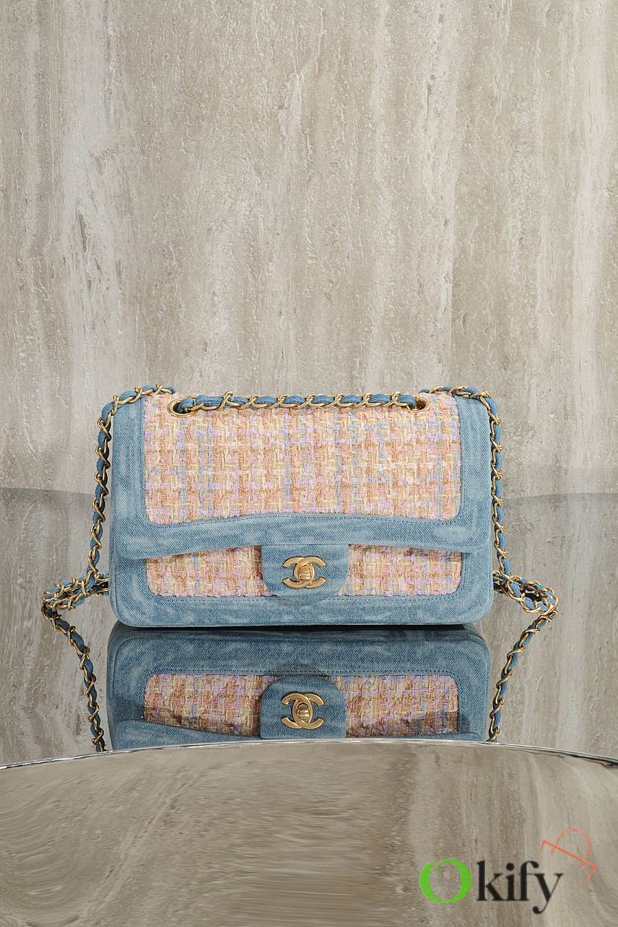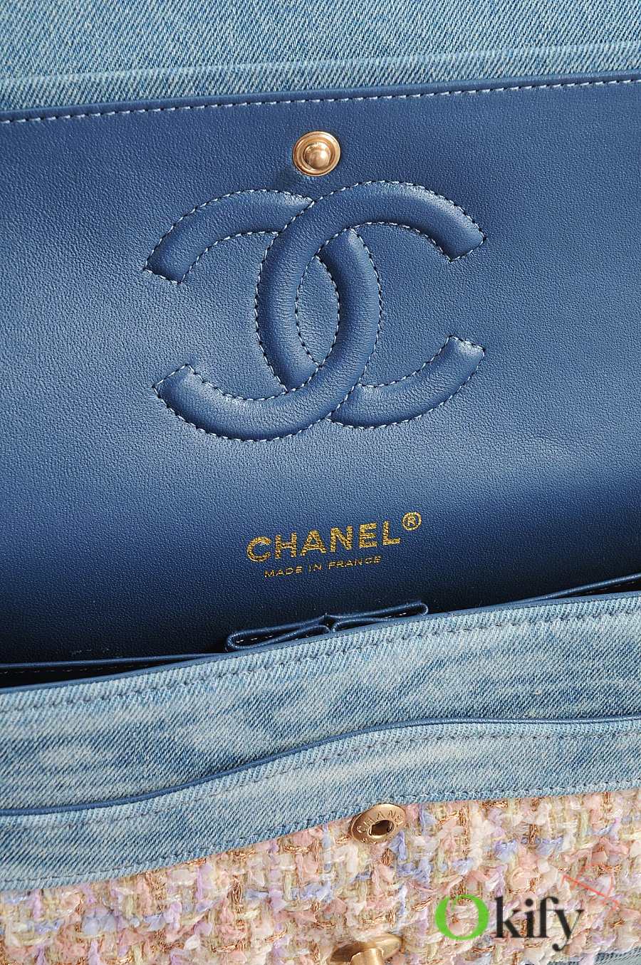 Fall/Winter runway style CF bag: elegant and chic in blue denim patchwork and pink tweed ✨ Metal chain and gold double C logo details make it a perfect choice.