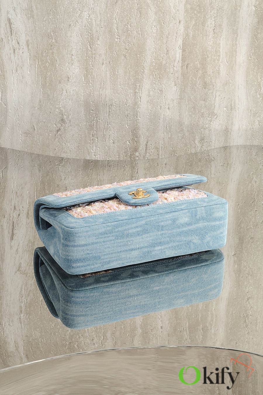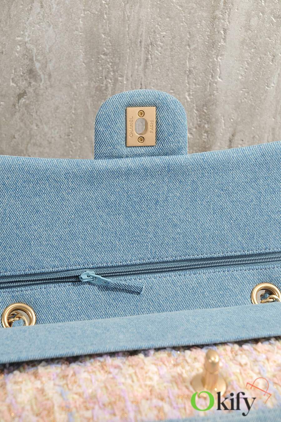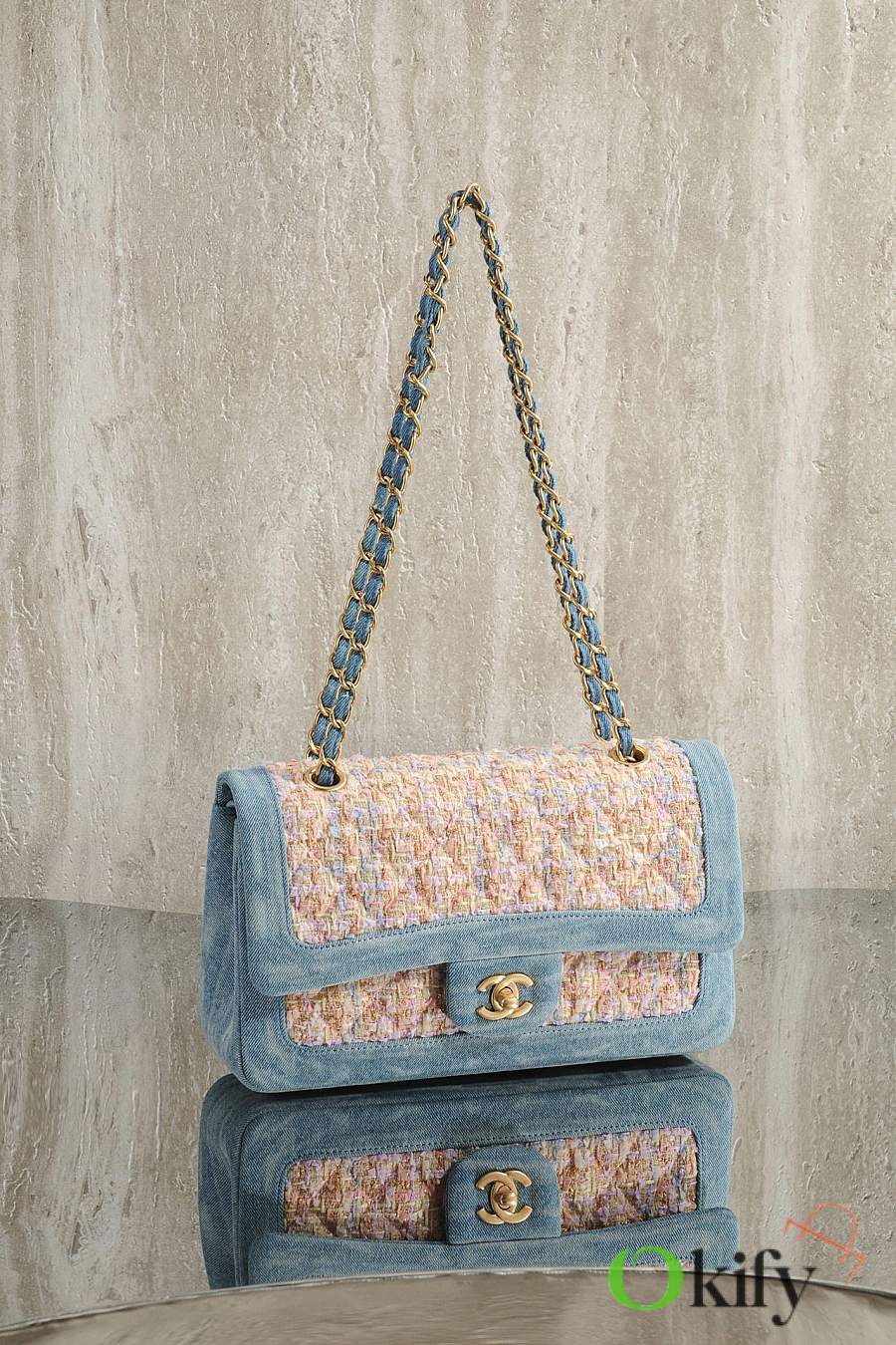 Fall/Winter runway style CF bag: elegant and chic in blue denim patchwork and pink tweed ✨ Metal chain and gold double C logo details make it a perfect choice.