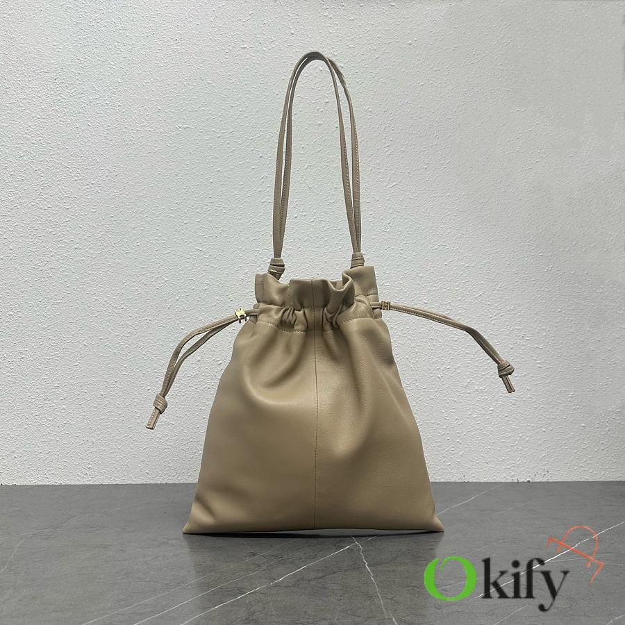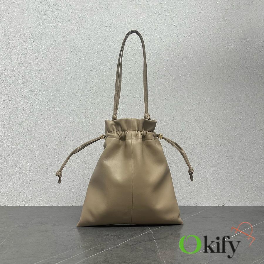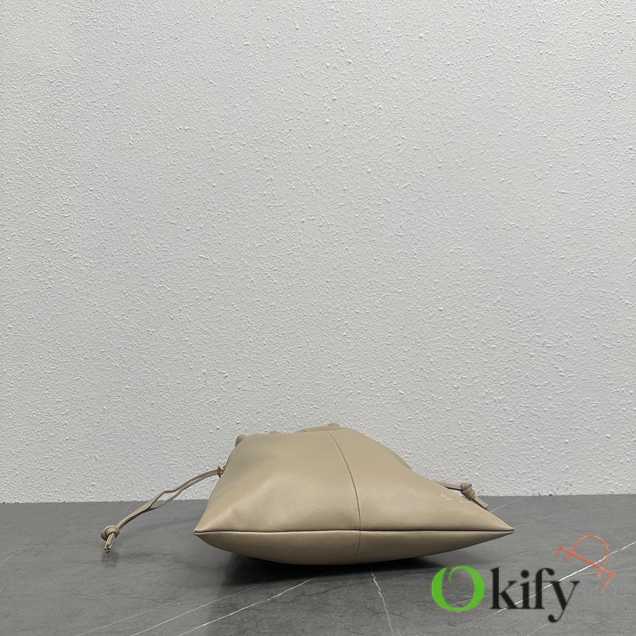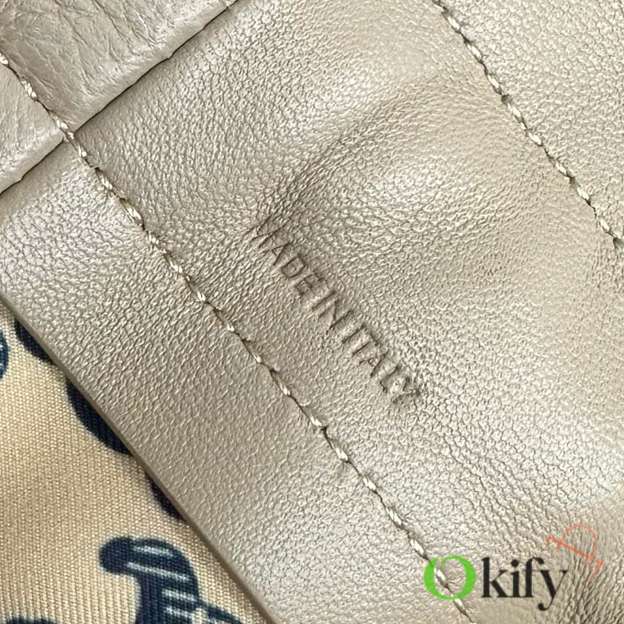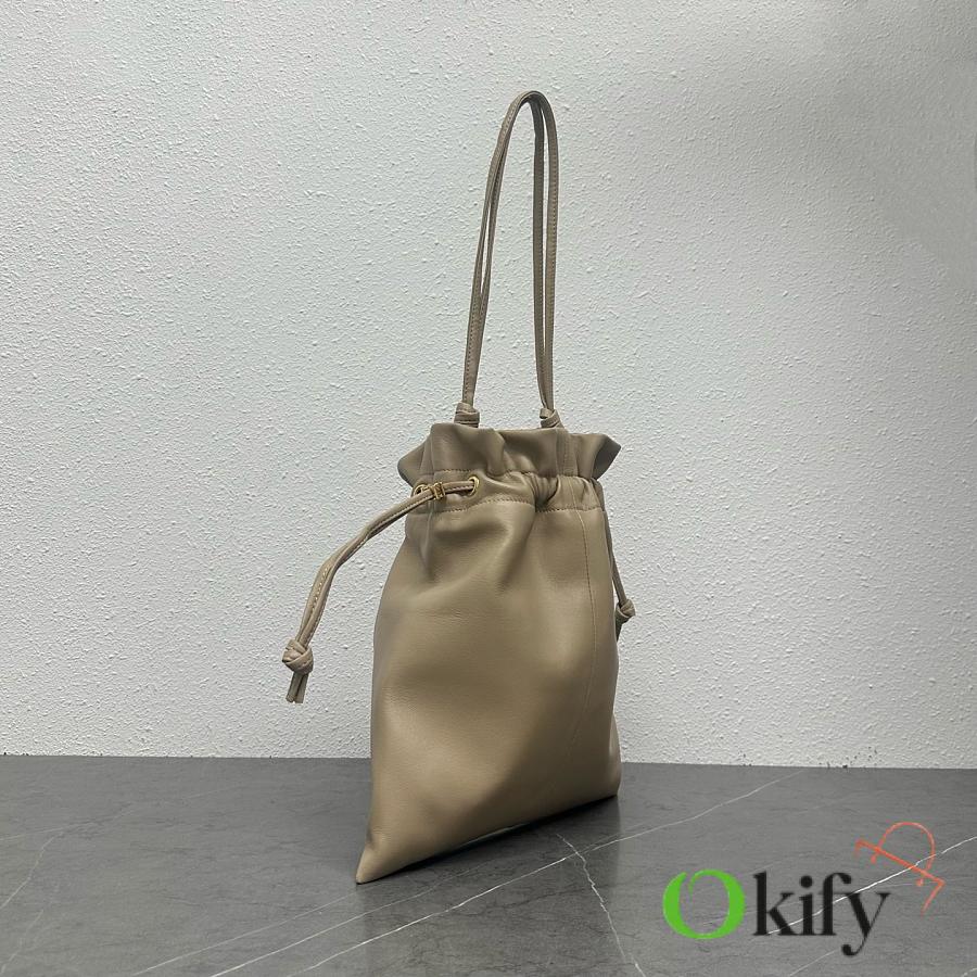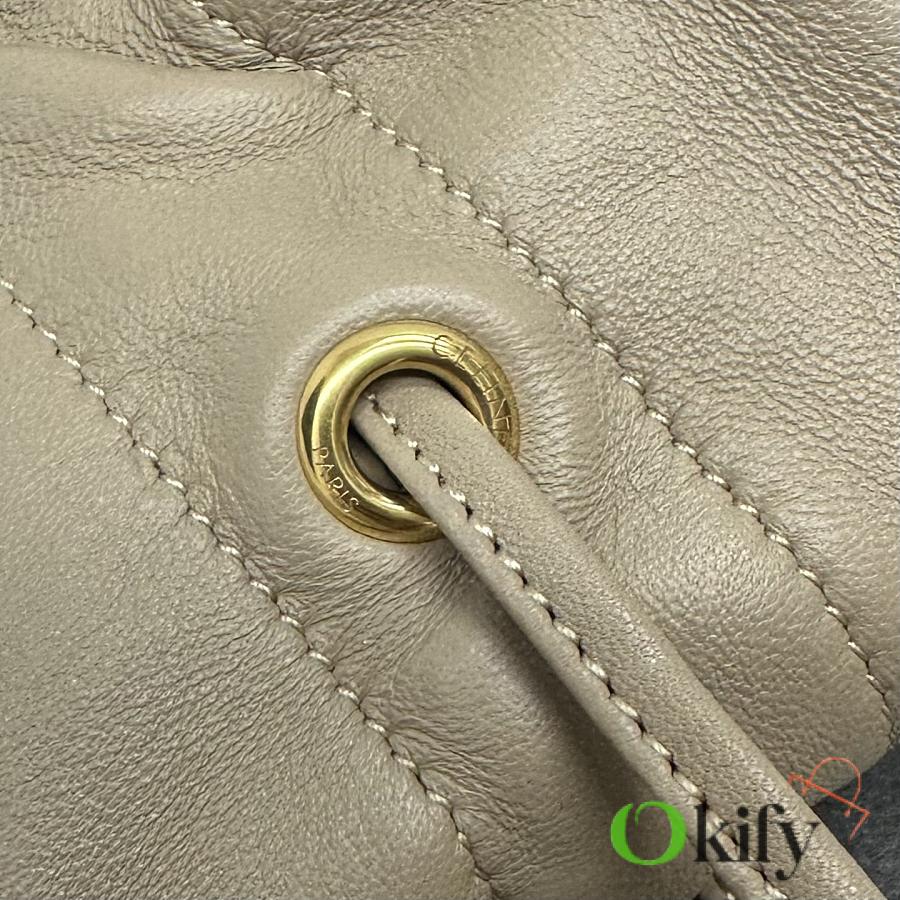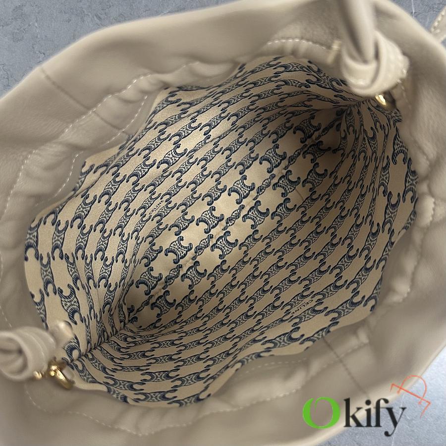 The drawstring design gives it a cloud-like feel. When loosened, the fabric drapes freely, allowing for two different visual moods in one bag. The embossed Arc de Triomphe logo on the bag, along with the metal drawstring closure, subtly incorporates the brand identity, maintaining its recognizability without appearing overtly ostenatious. The subtle Arc de Triomphe pattern on the lining is a hidden detail that reveals itself when the drawstring is pulled, ensuring a unified sense of quality from the inside out. The bag is made of soft, wrinkled lambskin, with a fluffy, cloud-like feel. The wrinkled texture gives it an effortless, casual feel Model Number: 123662