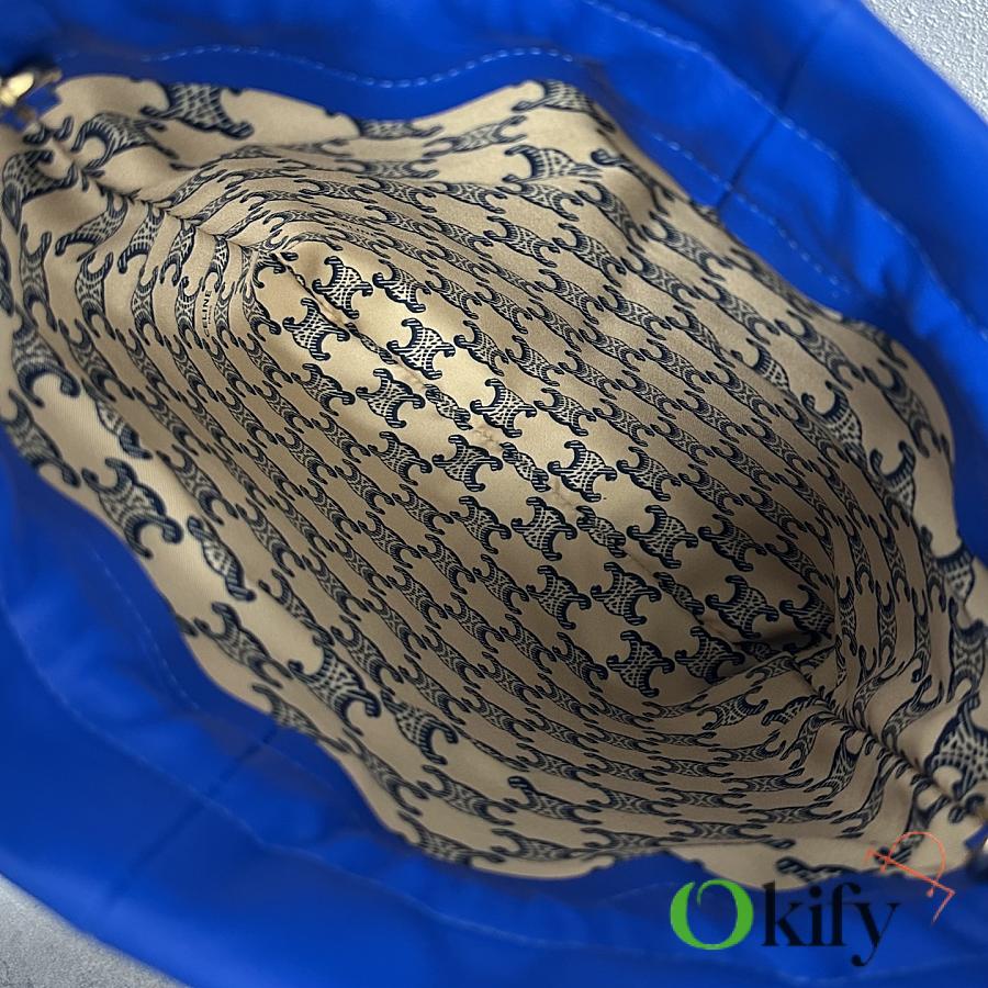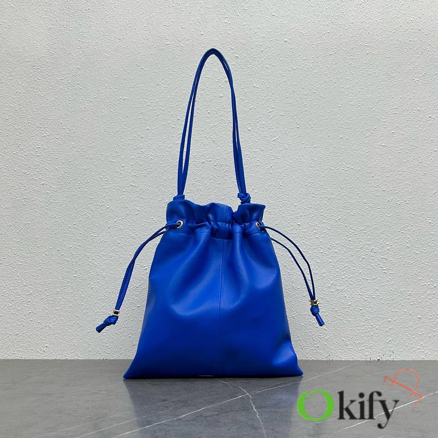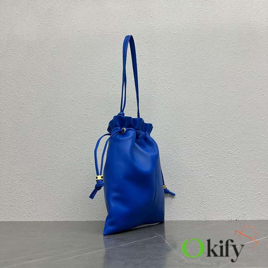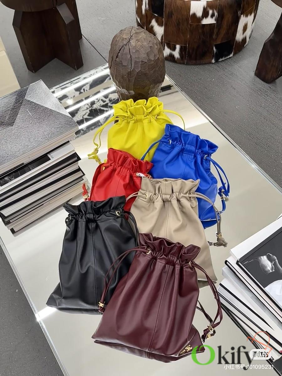 The drawstring design gives it a cloud-like feel. When loosened, the fabric drapes freely, allowing for two different visual moods in one bag. The embossed Arc de Triomphe logo on the bag, along with the metal drawstring closure, subtly incorporates the brand identity, maintaining its recognizability without appearing overtly ostenatious. The subtle Arc de Triomphe pattern on the lining is a hidden detail that reveals itself when the drawstring is pulled, ensuring a unified sense of quality from the inside out. The bag is made of soft, wrinkled lambskin, with a fluffy, cloud-like feel. The wrinkled texture gives it an effortless, casual feel Model Number: 123662