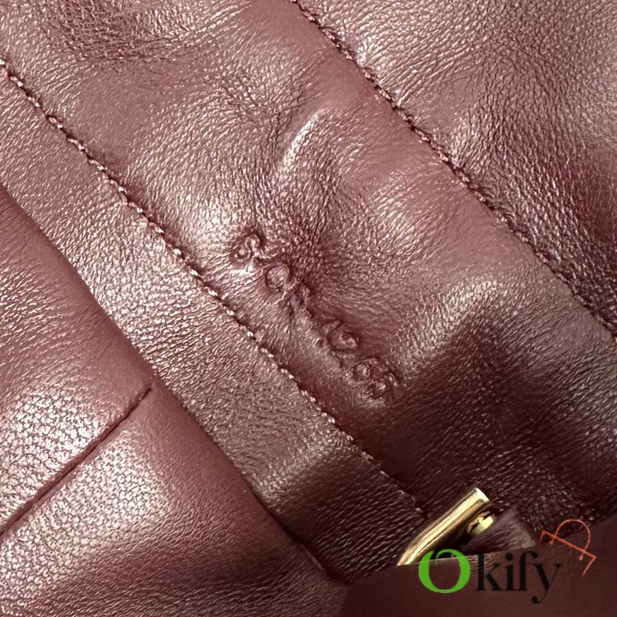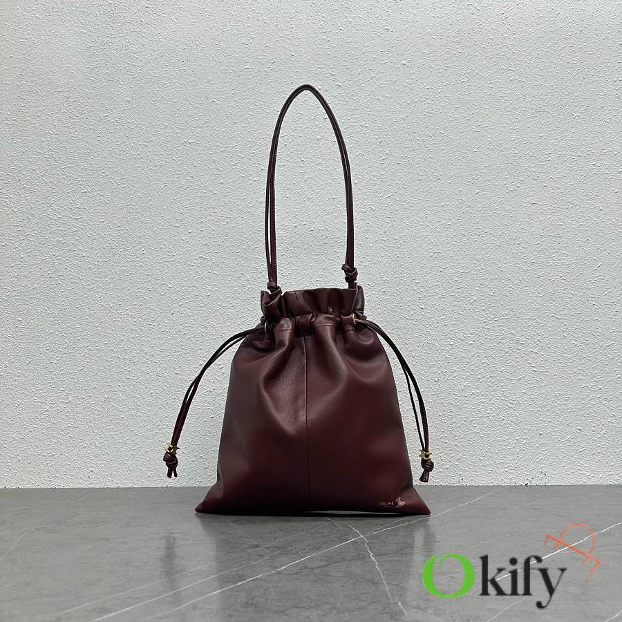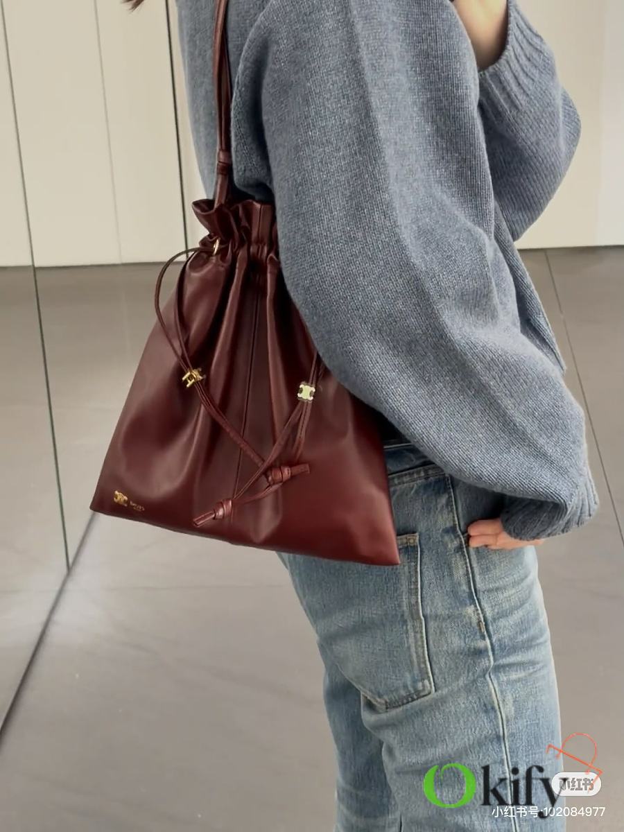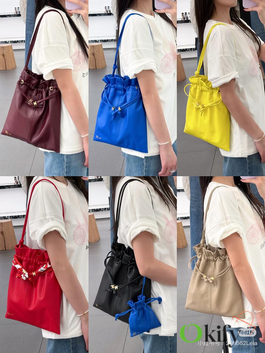 The drawstring design gives it a cloud-like feel. When loosened, the fabric drapes freely, allowing for two different visual moods in one bag. The embossed Arc de Triomphe logo on the bag, along with the metal drawstring closure, subtly incorporates the brand identity, maintaining its recognizability without appearing overtly ostenatious. The subtle Arc de Triomphe pattern on the lining is a hidden detail that reveals itself when the drawstring is pulled, ensuring a unified sense of quality from the inside out. The bag is made of soft, wrinkled lambskin, with a fluffy, cloud-like feel. The wrinkled texture gives it an effortless, casual feel Model Number: 123662