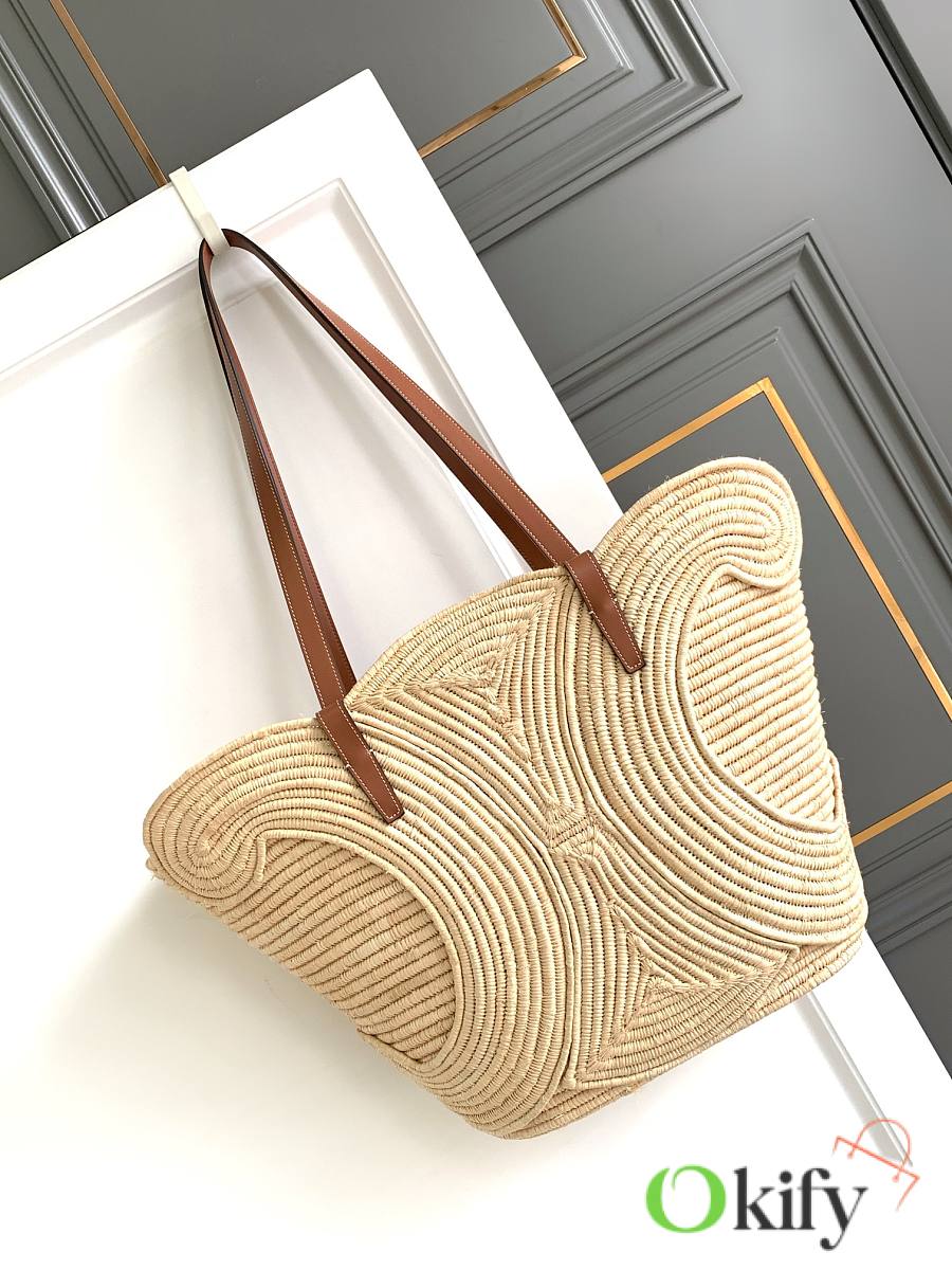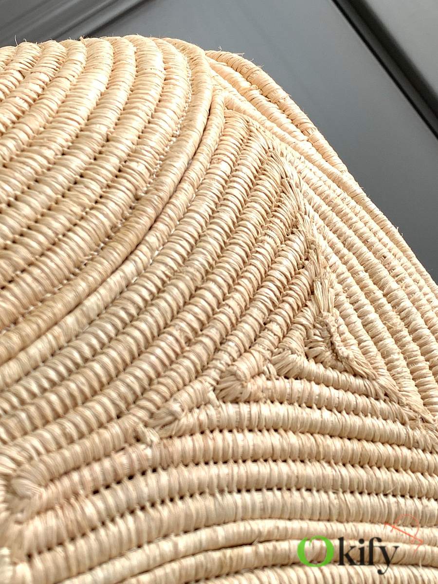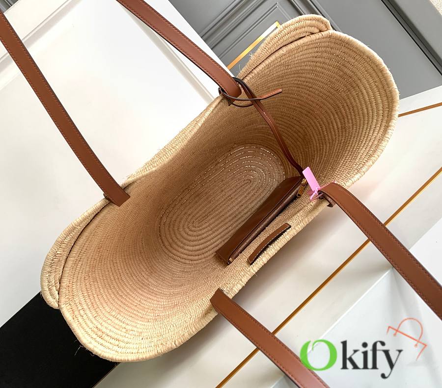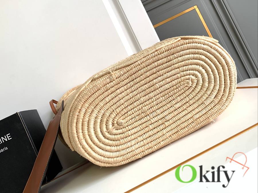 Made from natural plant materials, with cowhide leather trim, unlined, gold-tone finish, shoulder carry, one main compartment, one interior detachable leather zip pocket, and a 35cm shoulder strap.