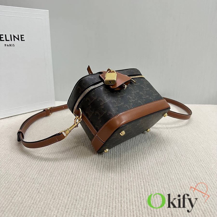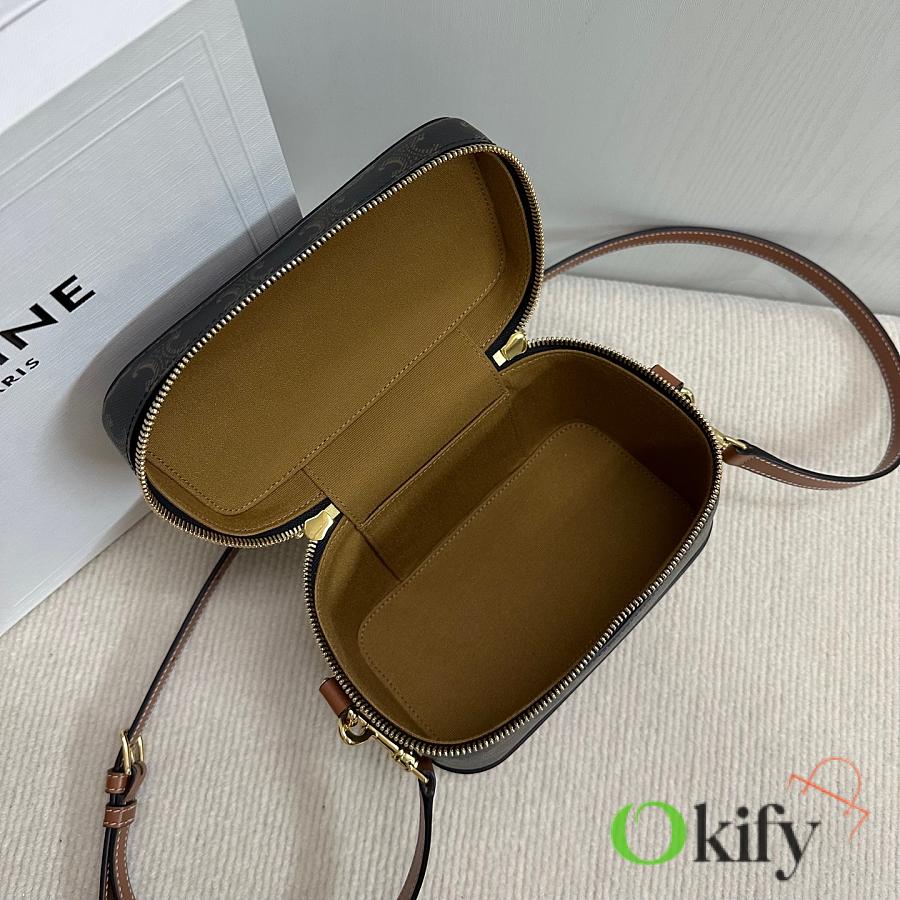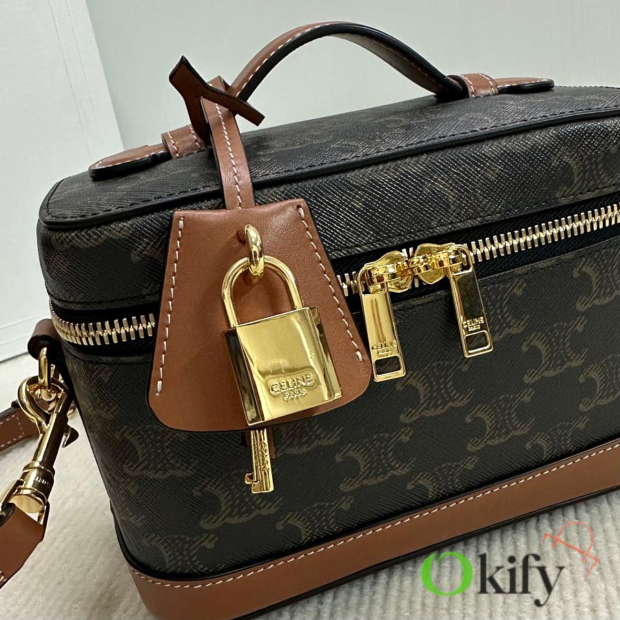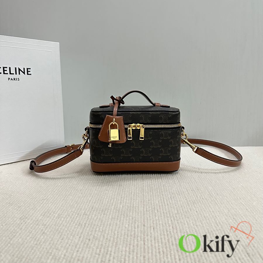 This classic cosmetic bag is inspired by the cosmetic bag of MAISON CE. This season, the handbag series is innovative and the size is very good. This practical, versatile and sophisticated cosmetic bag takes its name from its CE shape. CE VANITY's first season features natural calfskin, CE's most prestigious leather, boasting a sturdy texture and the ability to create delicate, distinctive structures. The chain design is inspired by the Arc de Triomphe. The tan leather trim is a signature of the CE TRIOMPHE CANVAS.