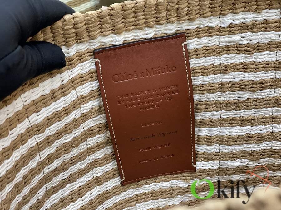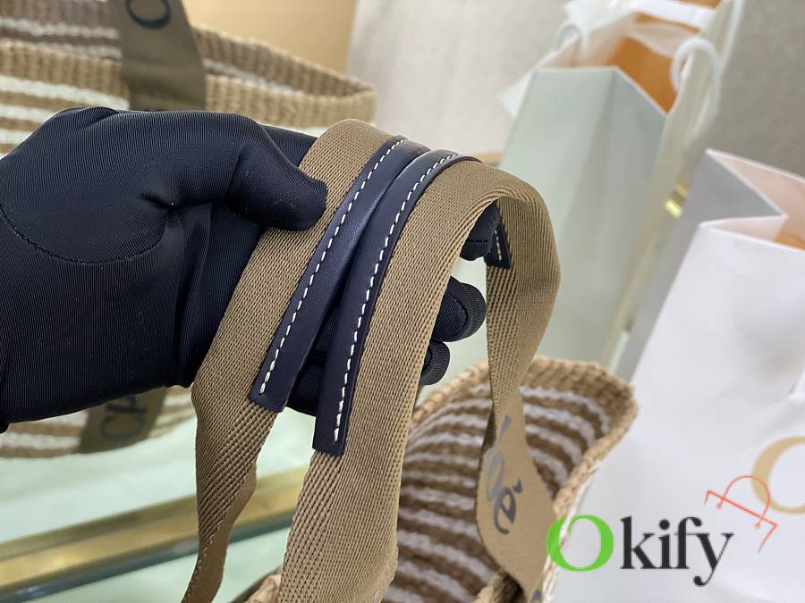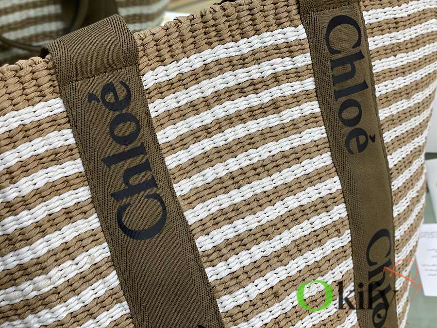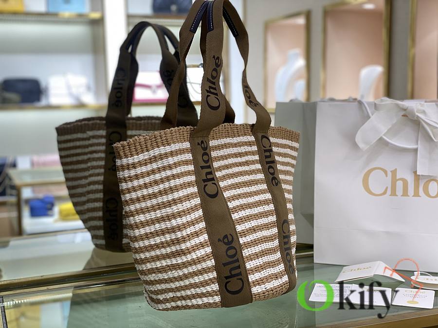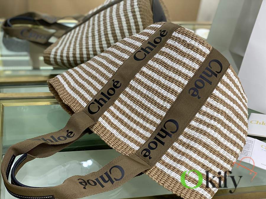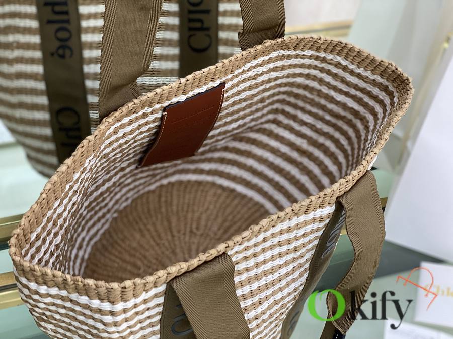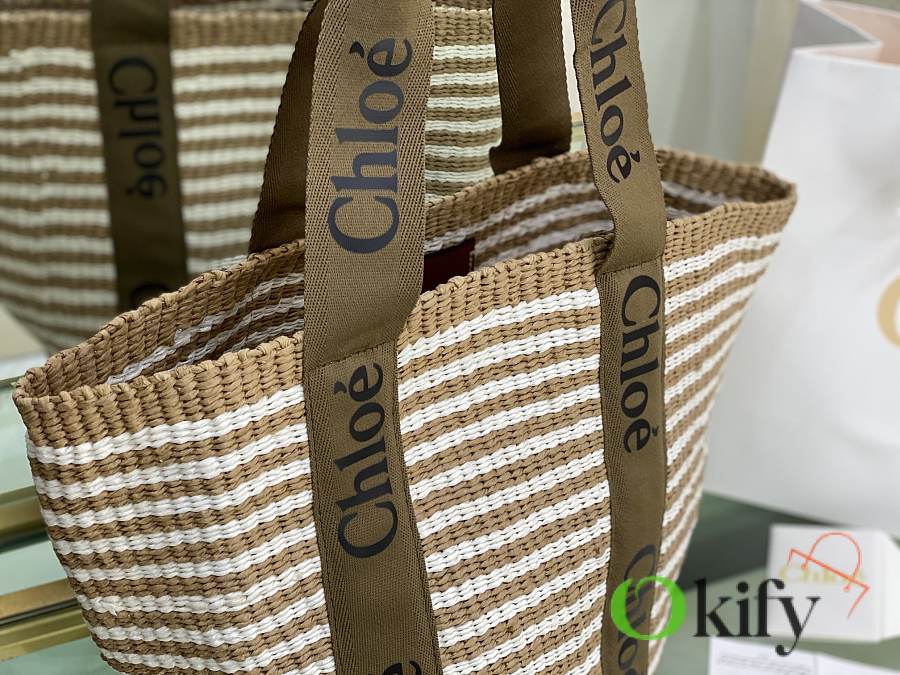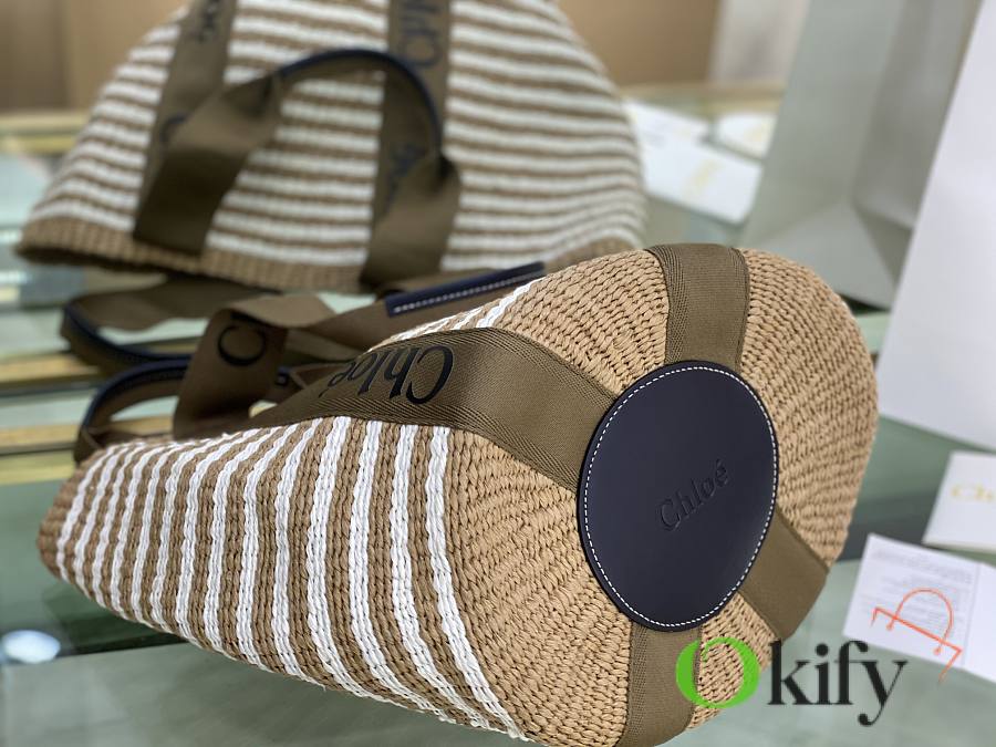 The large Woody basket bag features a Woody ribbon and a classic basket shape for a relaxed summer vibe. It can be carried by hand or over the shoulder, and the bottom is protected by a Chloe embossed circular leather patch for added durability.