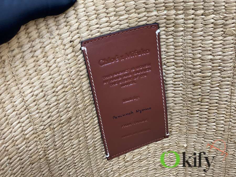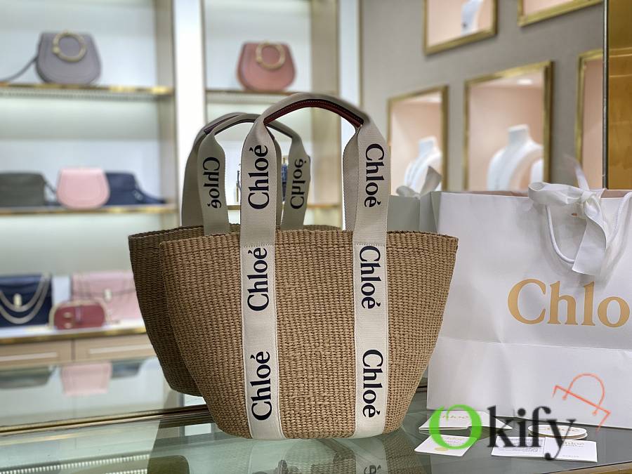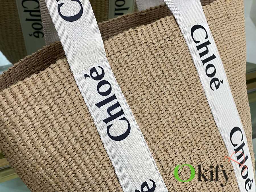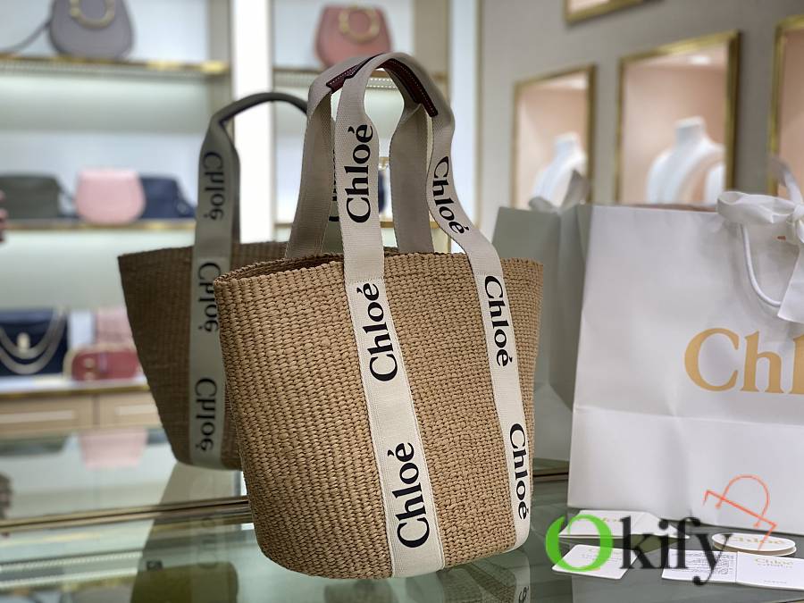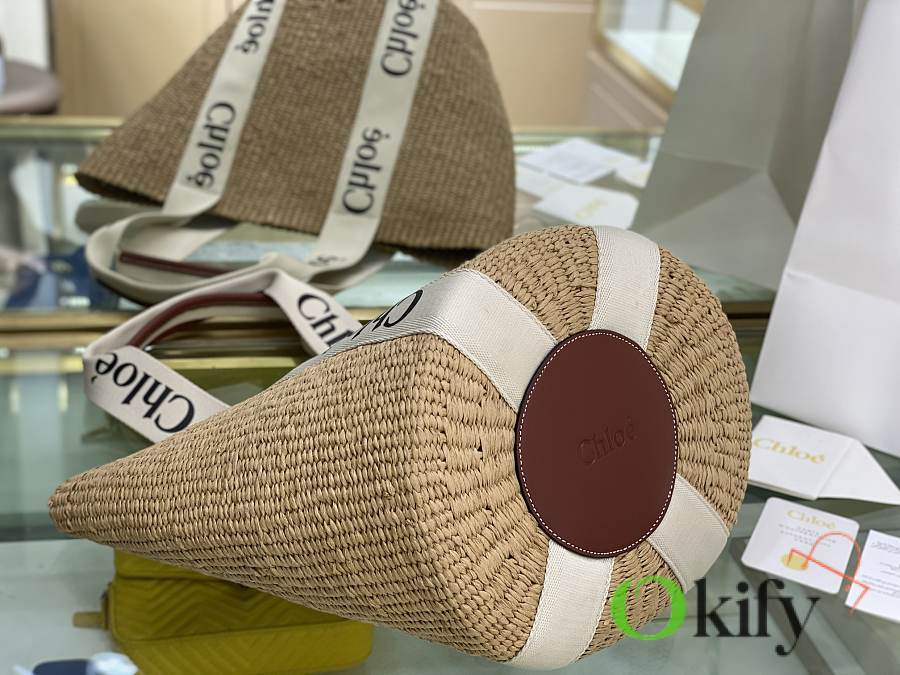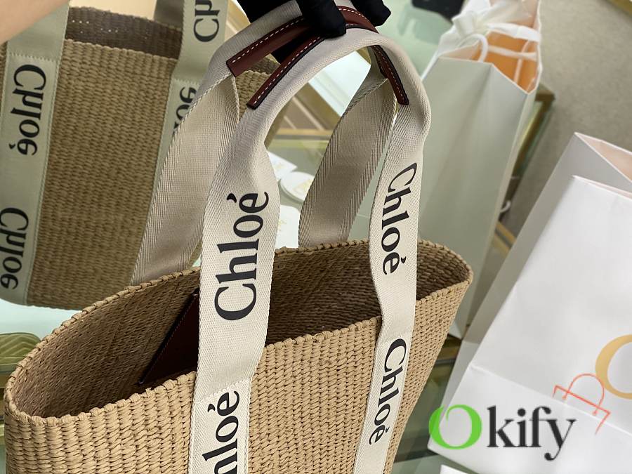 The large Woody basket bag features a Woody ribbon and a classic basket shape for a relaxed summer vibe. It can be carried by hand or over the shoulder, and the bottom is protected by a Chloe embossed circular leather patch for added durability.