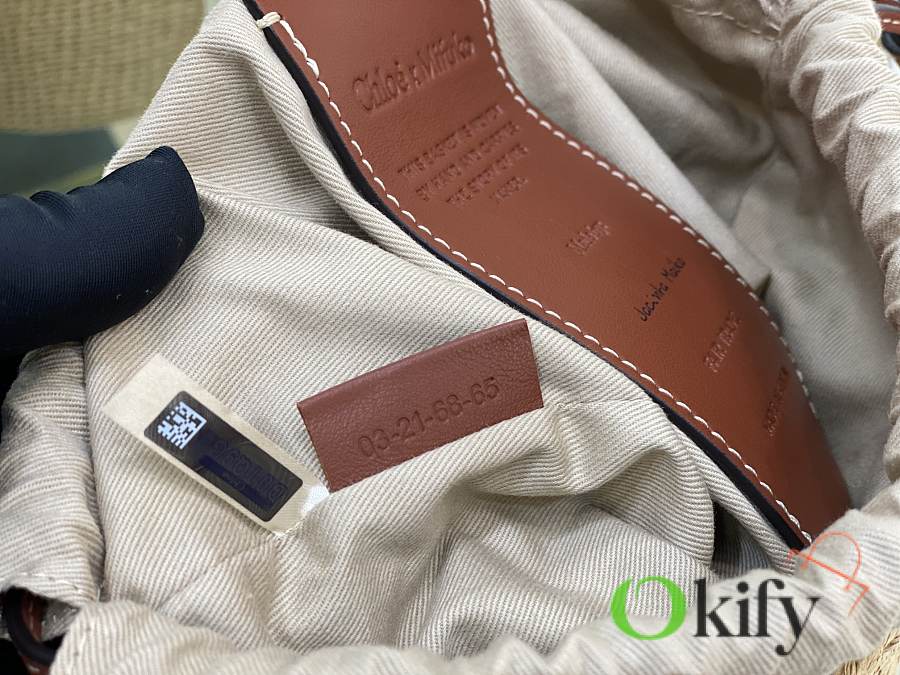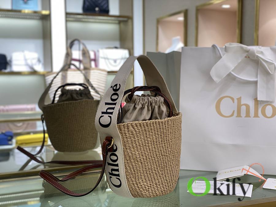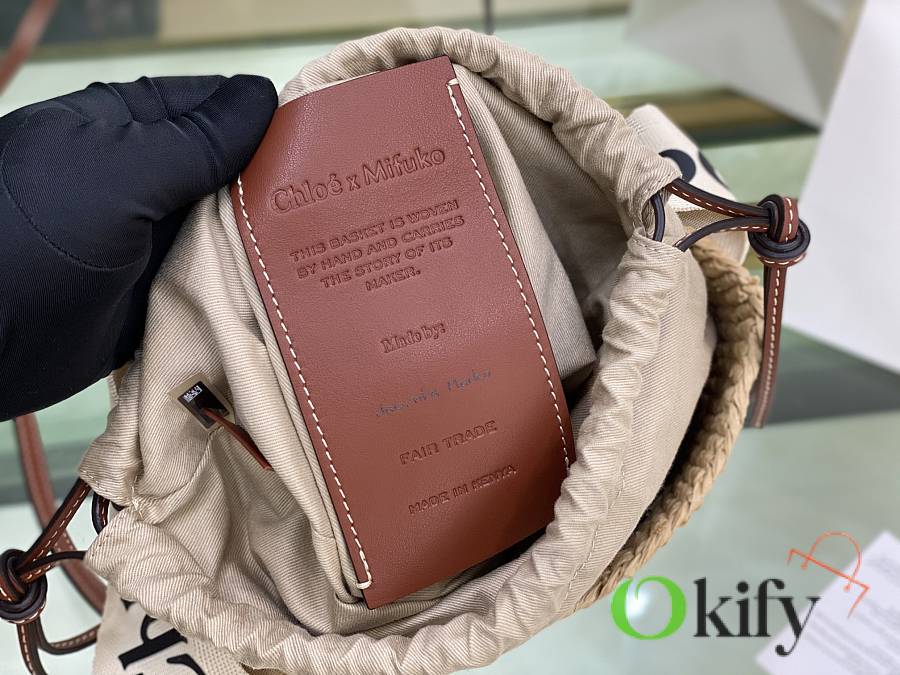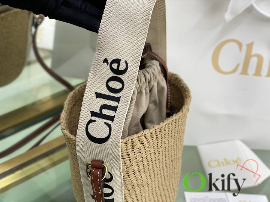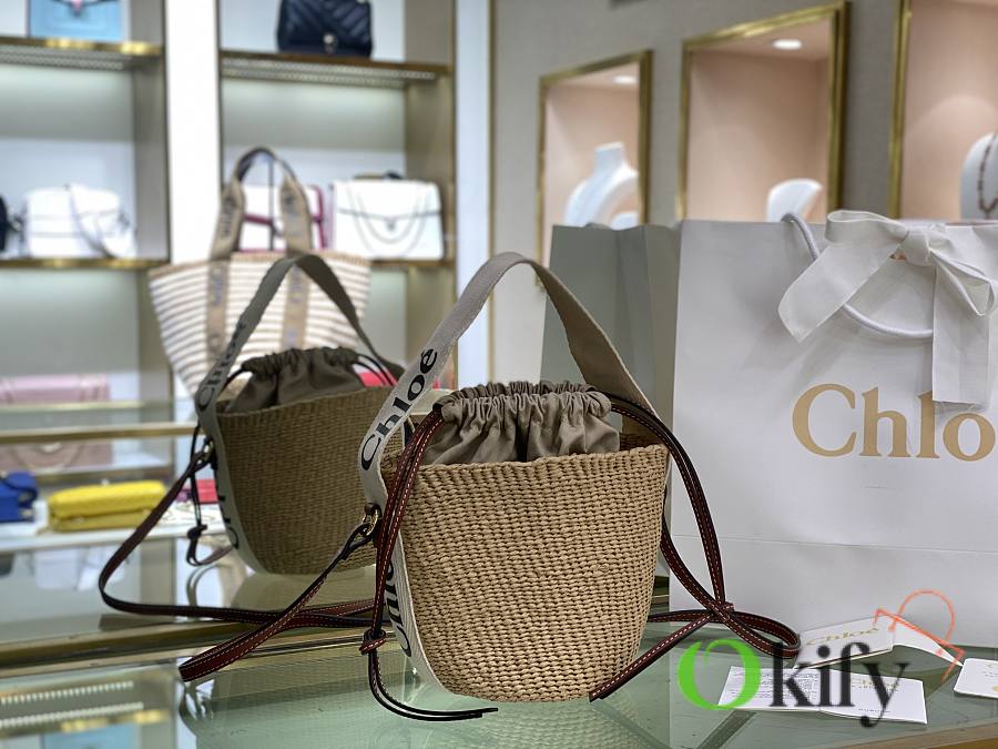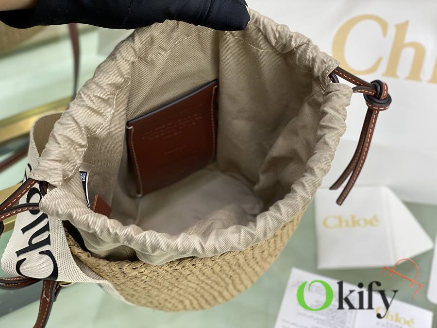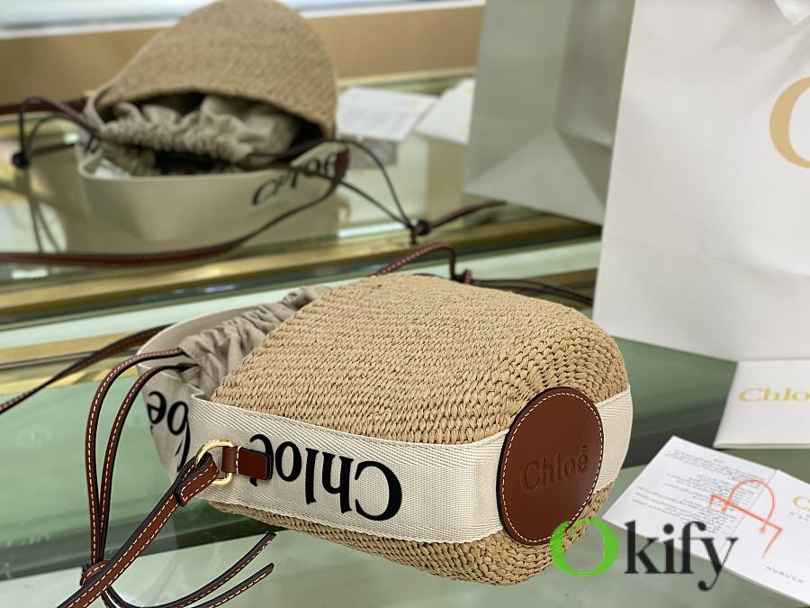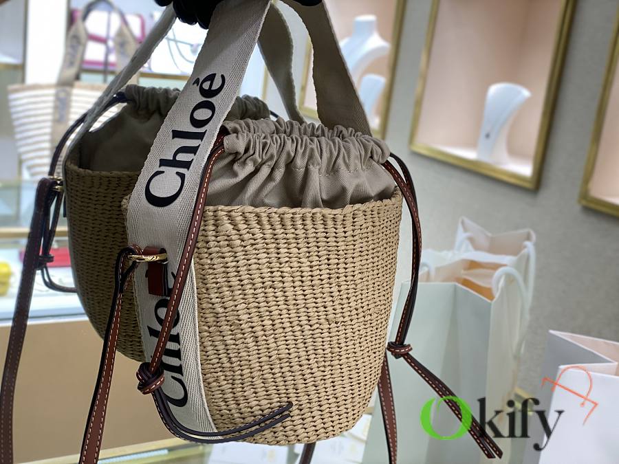 The small Woody basket bag is adorned with a Woody ribbon, offering more versatility in how it can be carried (hand-carry, shoulder-carry, or crossbody). The small Woody features a petite, rounded basket shape, secured with a drawstring, and a long leather strap allows for shoulder or crossbody wear, adding a touch of casualness