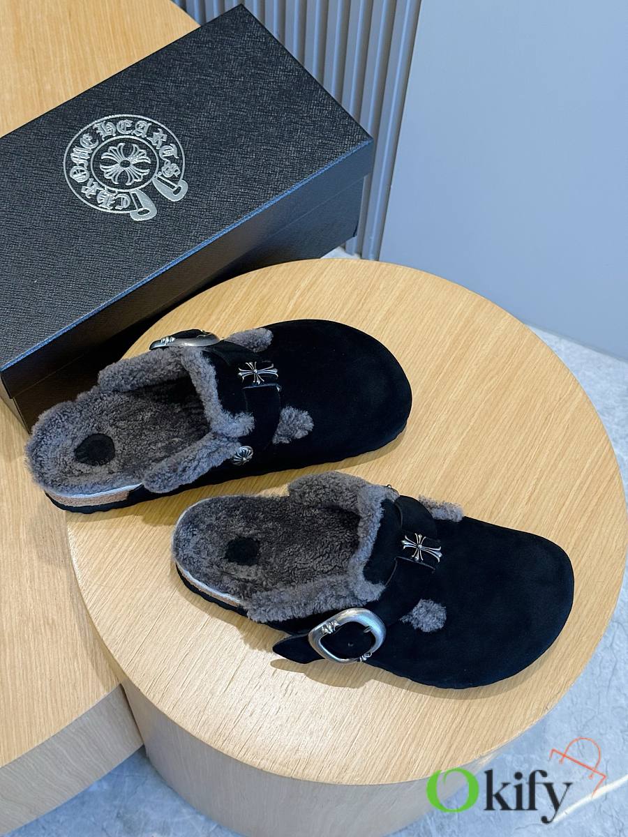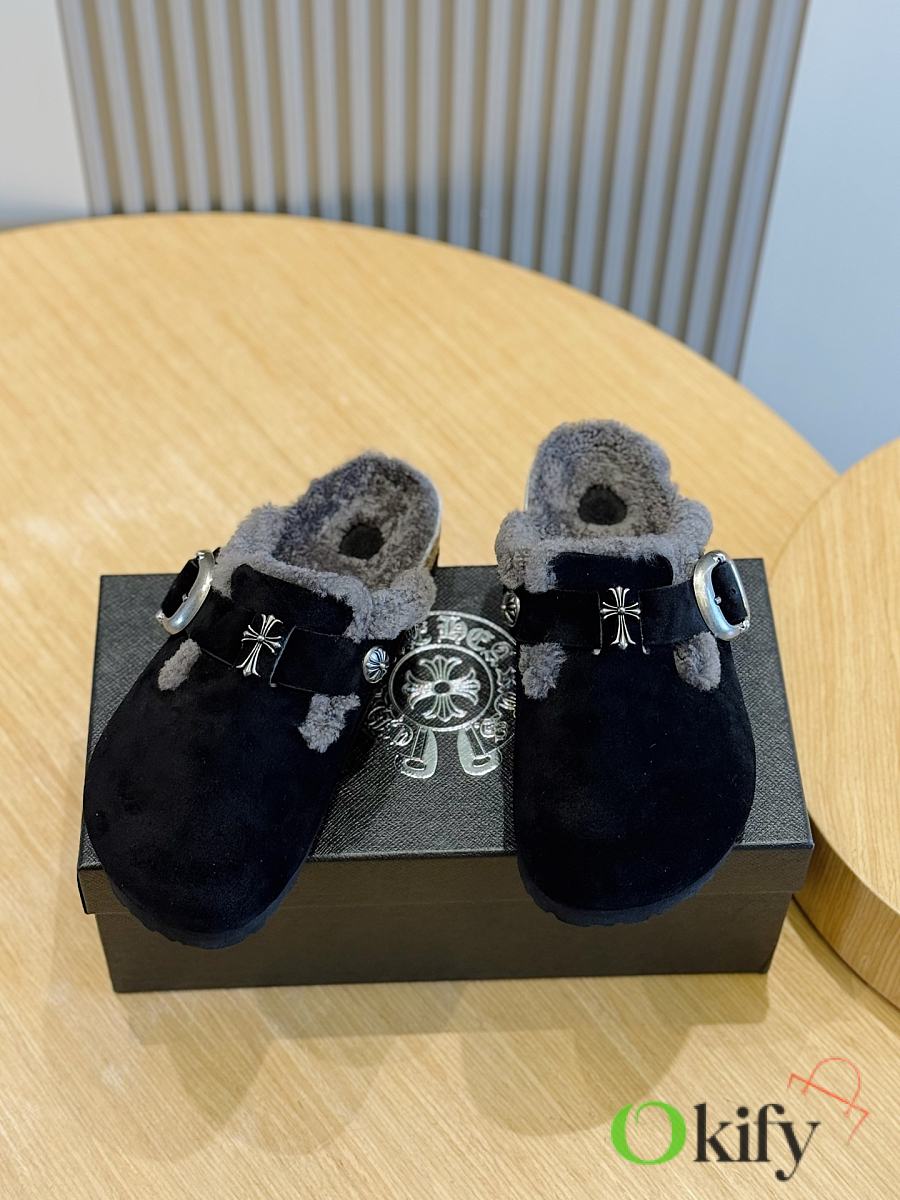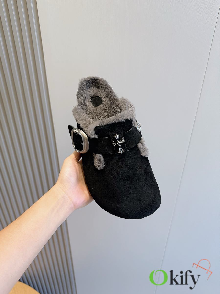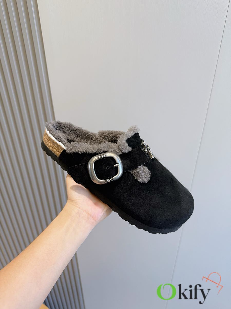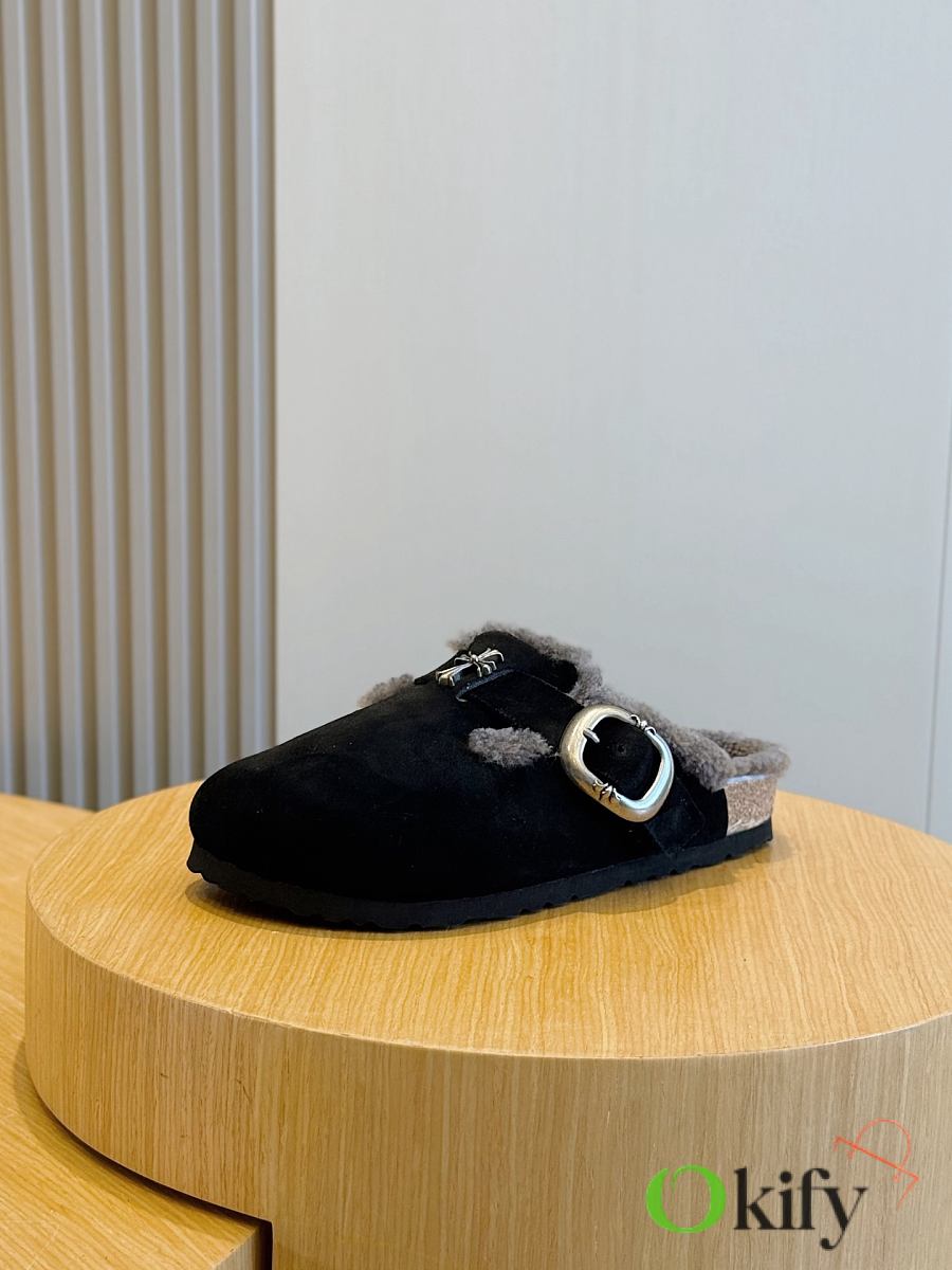 black cowhide leather flat mules with cross logo embossing on the upper and ergonomic sole. The sole is covered with a cork black outsole