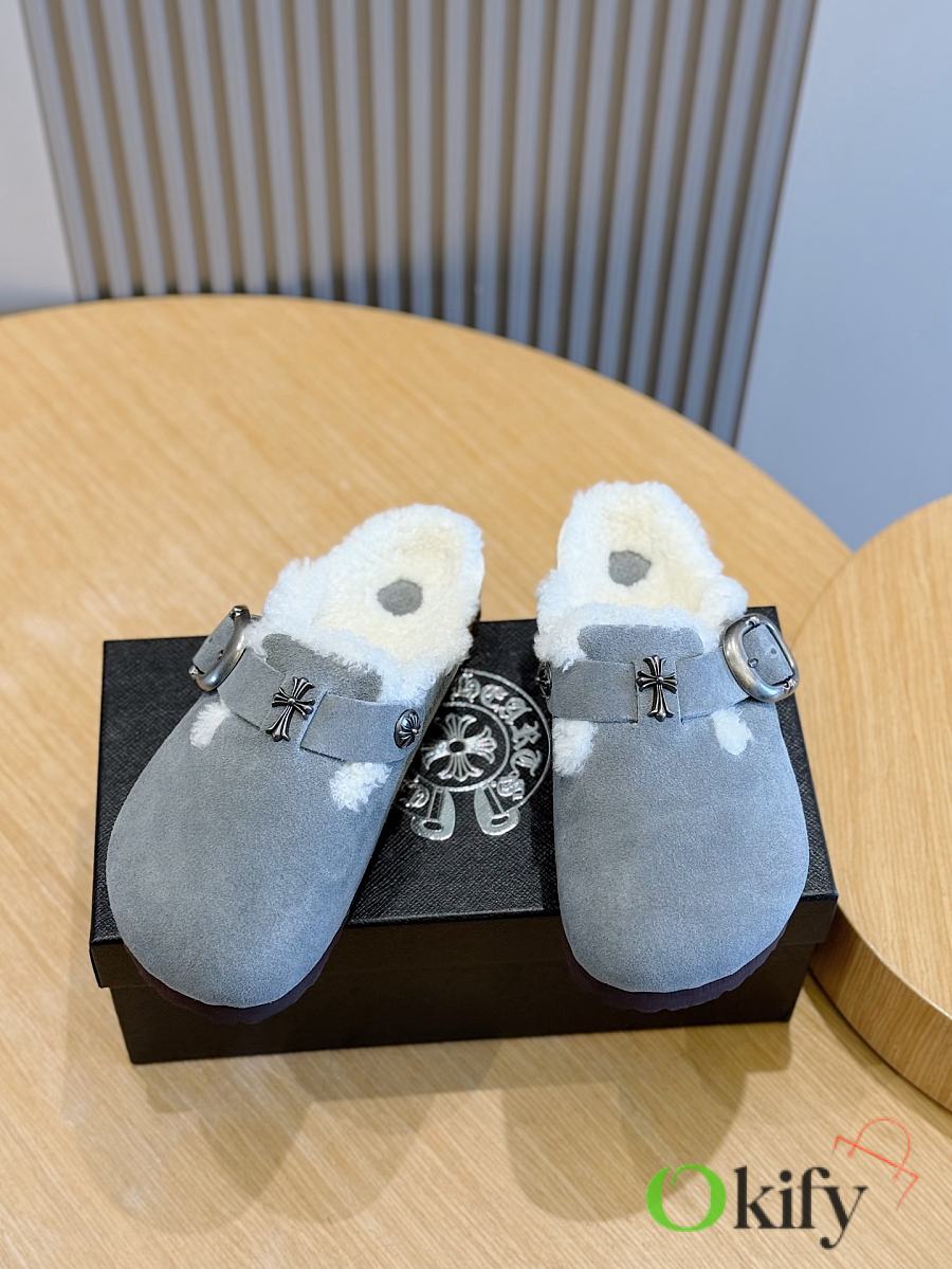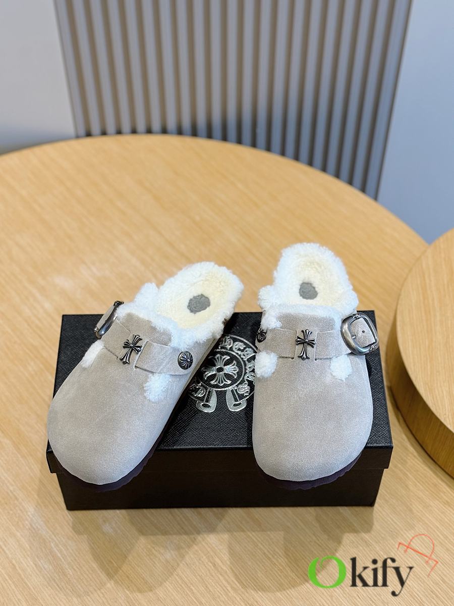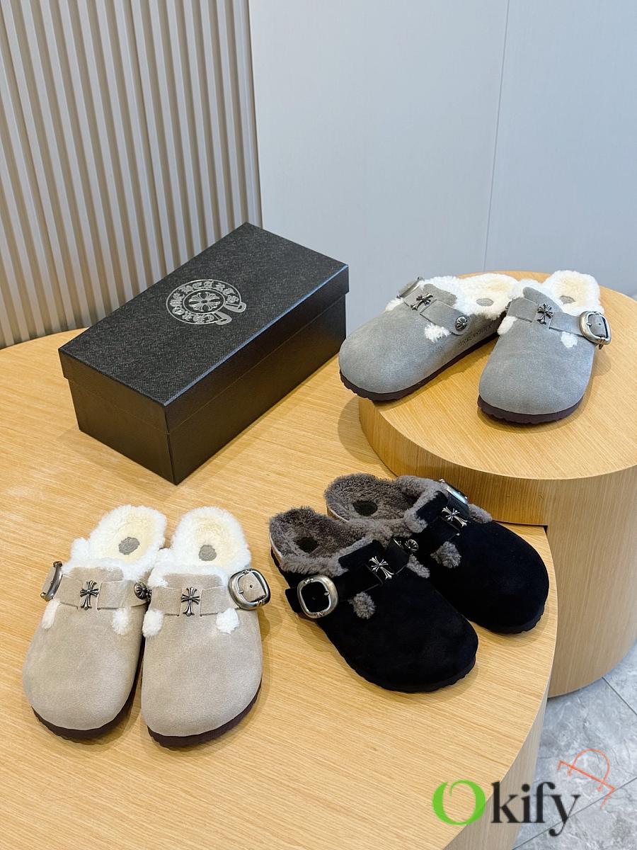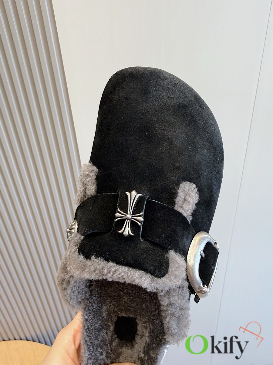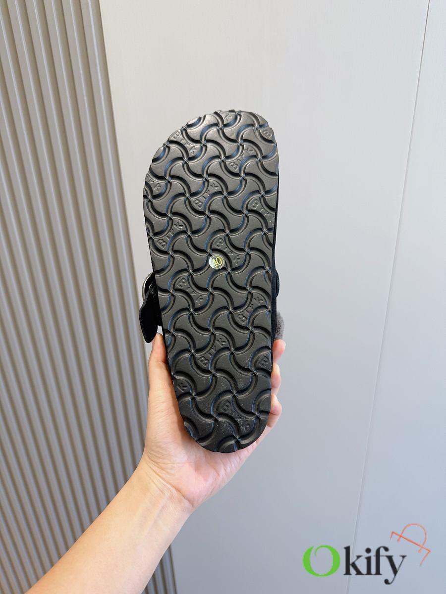 black cowhide leather flat mules with cross logo embossing on the upper and ergonomic sole. The sole is covered with a cork black outsole