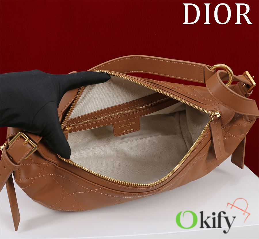 New this season, the D-Journey bag, unveiled at the Dior Spring/Summer 2025 ready-to-wear show, features a soft, modern take on the scalloped silhouette. Crafted from white calfskin leather, it's embellished with a flat, oversized cannage topstitching, a fresh take on the iconic Dior motif. A zippered pocket within the main compartment adds a touch of sophistication, while two decorative side pockets feature large leather zipper pulls embellished with the Christian Dior Paris signature. The medium size features an adjustable leather top handle and a leather shoulder strap, allowing it to be carried by hand, on the shoulder, or across the body, making it the perfect everyday companion. Except for ornaments and decorative lines Zipper closure Leather shoulder strap and adjustable top handle with gold-finish metal CD hook Decorative side pocket with leather zipper pull and Christian Dior Paris signature in antique gold-finish metal Internal zip pocket Fits a phone, a wallet, two cardholders, sunglasses and lipstick