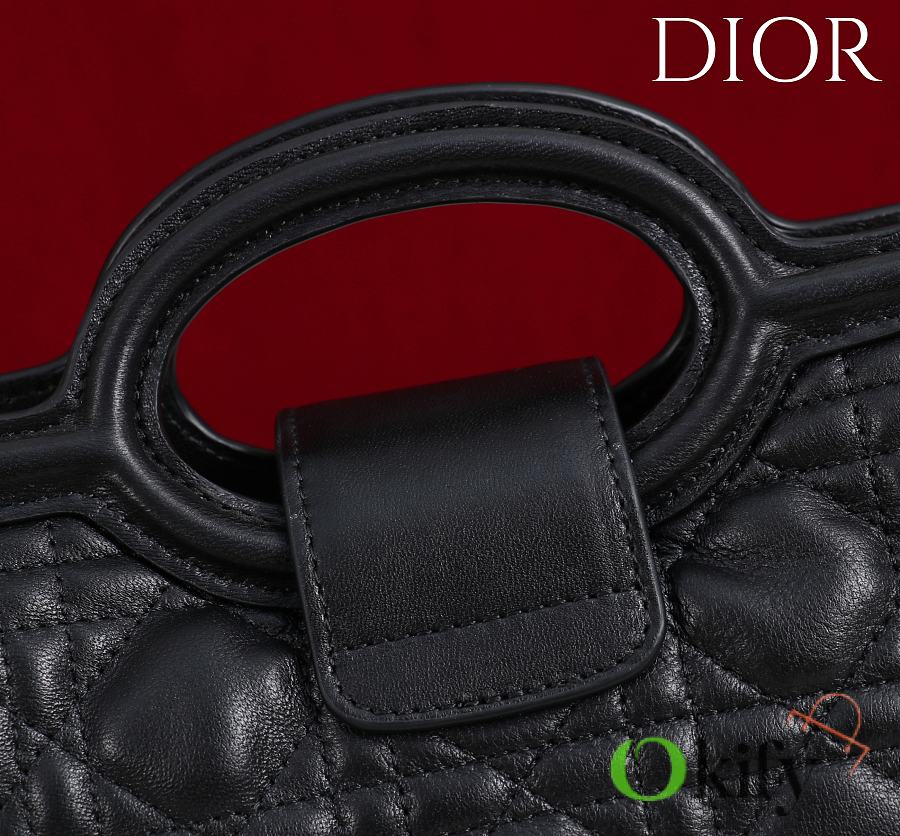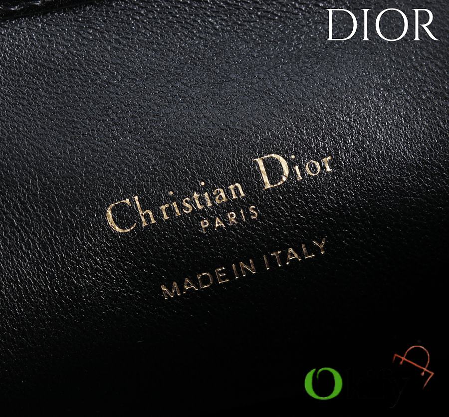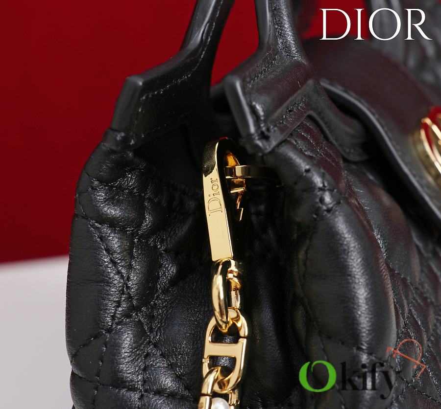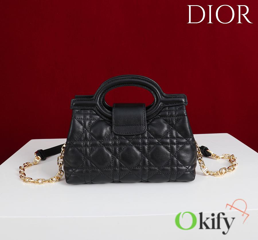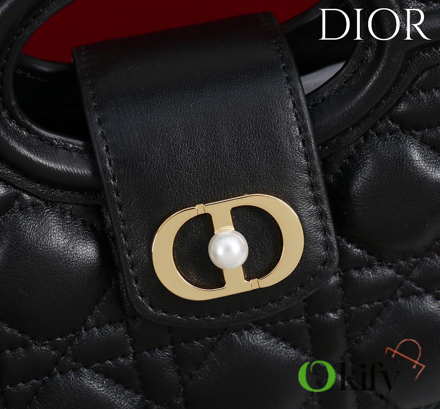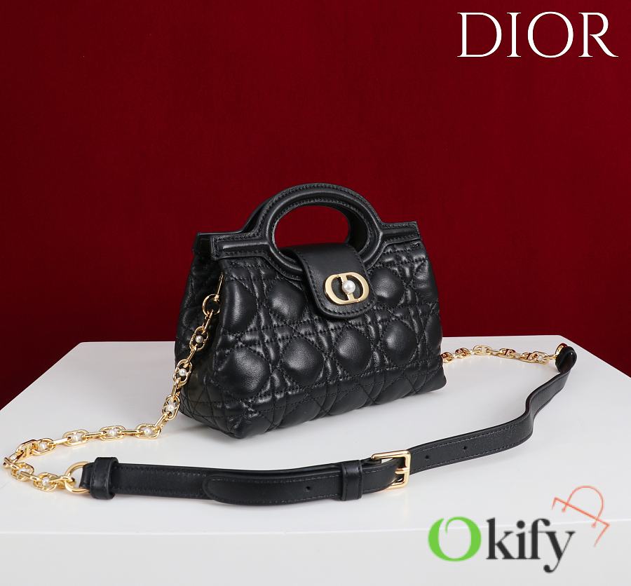 The Dior Jolie Top Handle Mini Chain Bag, a new addition to the Cruise 2026 Ready-to-Wear collection, showcases an elegant and practical design. Crafted from black lambskin leather with a cannage pattern, the flap is embellished with a gold-finish metal CD logo and white resin beads. It features a single interior compartment for everyday essentials. Featuring double top handles and an adjustable and removable CD chain shoulder strap comprised of leather straps and CD links embellished with white resin beads, it can be comfortably carried by hand, on the shoulder, or across the body, perfect for both daytime and evening looks. Body: Sheepskin leather Lining: Sheepskin leather Magnetic flap closure with CD buckle and white resin beads on the front 1 compartment Double leather top handles Adjustable and detachable chain with resin beads and leather strap Fits a cell phone, a card holder, sunglasses and lipstick