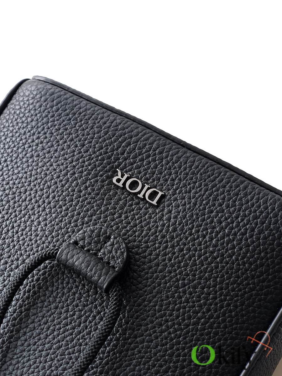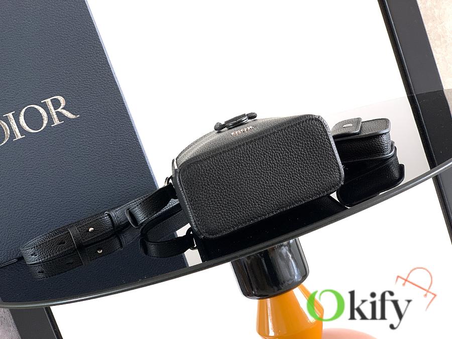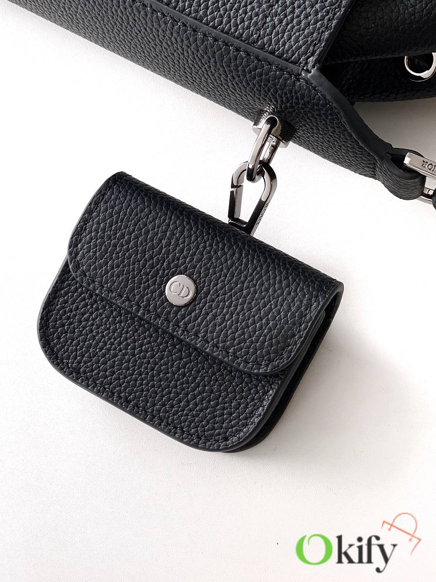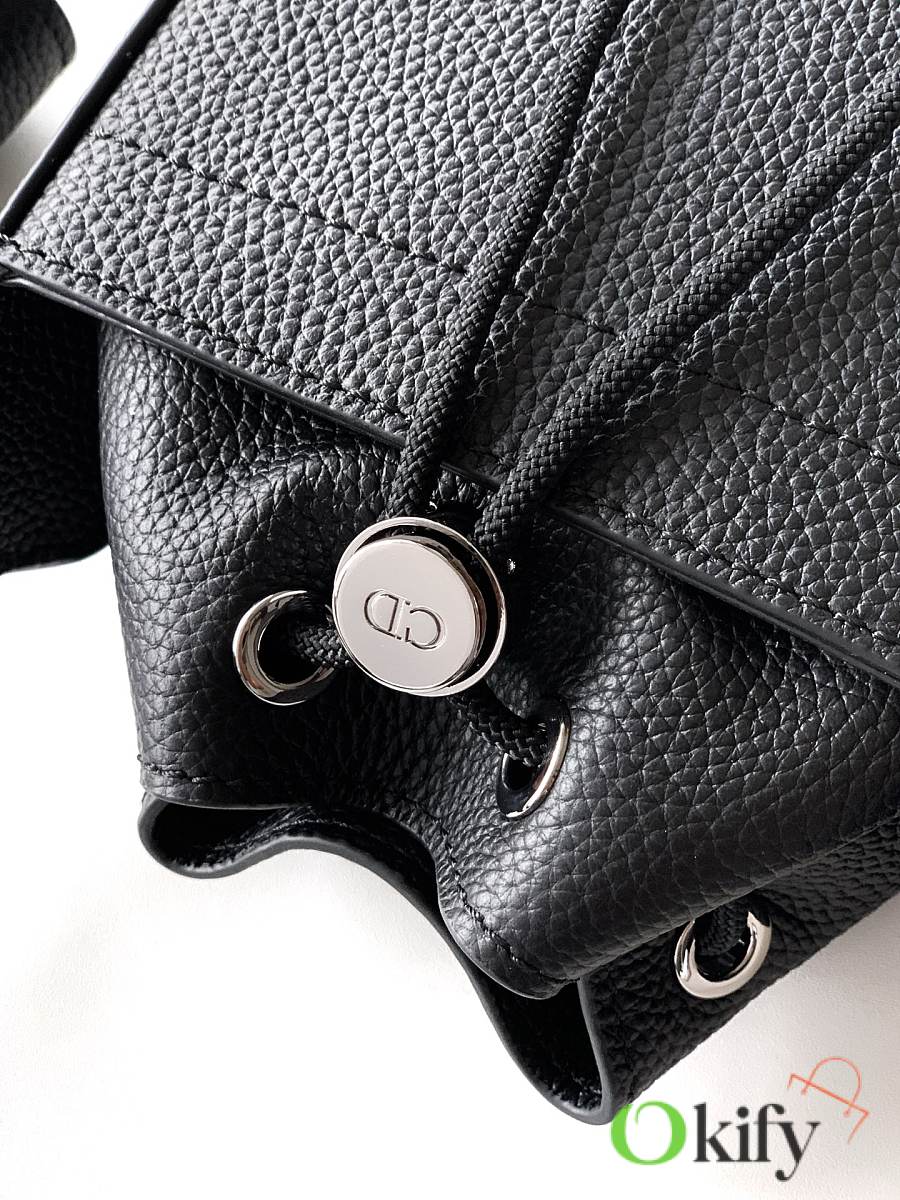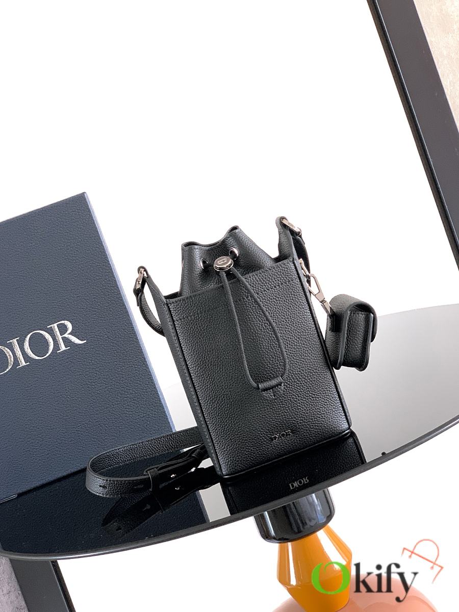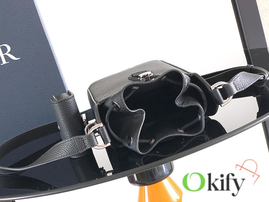 This bucket bag, a new addition to the 2025 Winter Men's Collection, exudes style. Its structured design is crafted from black grained calfskin and other premium materials, adorned with the Dior logo on the front. It features an interior drawstring pouch and two slip pockets for everyday essentials, while a detachable hanging pouch on one side provides easy access to earphones, keys, or coins. The mini version comes with an adjustable leather shoulder strap for shoulder or crossbody wear. Main body: cowhide leather, technical fabric Lining: Technical fabric, cotton, cowhide leather The main compartment features a drawstring and a clasp engraved with the CD logo. Internal pockets Back pocket Detachable pouch with flap and CD snap Adjustable leather shoulder strap The front is decorated with a Dior logo made of copper-plated metal. The interior is decorated with the Dior embossed logo. Includes dust bag