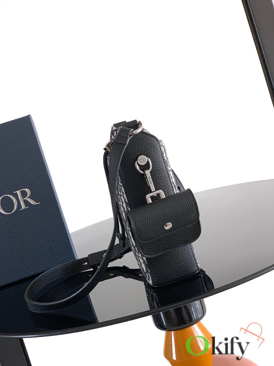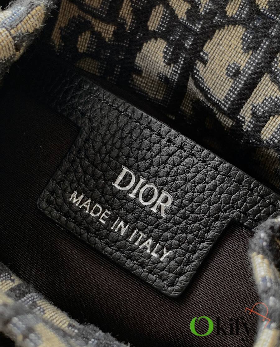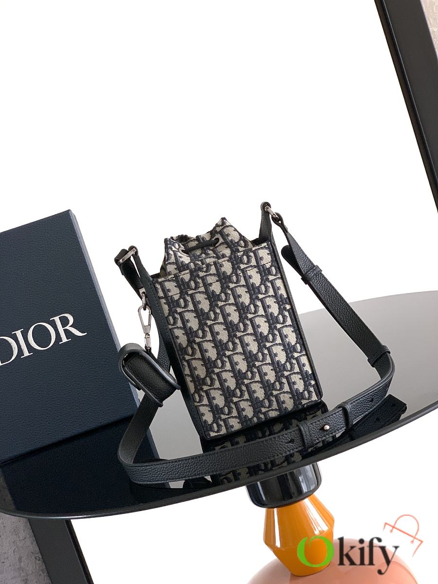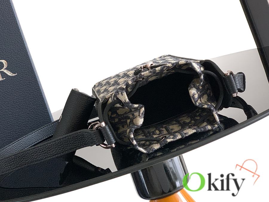 This bucket bag, a new addition to the 2025 Winter Men's Collection, exudes style. Its structured design is crafted from beige and black Oblique printed fabric, enhanced with black grained calfskin details for a sophisticated look, and adorned with the Dior logo on the front. It features an interior drawstring pouch and two slip pockets for everyday essentials, while a detachable black grained calfskin hanging pouch on one side provides easy access to earphones, keys, or coins. The mini version comes with an adjustable leather shoulder strap for shoulder or crossbody wear. Main body: cowhide leather, cotton, technical fabric Lining: Technical fabric, cotton, cowhide leather The main compartment features a drawstring and a clasp engraved with the CD logo. Internal pockets Back pocket Detachable pouch with flap and CD snap Adjustable leather shoulder strap The front is decorated with a Dior logo made of copper-plated metal. The interior is decorated with the Dior embossed logo. Includes dust bag