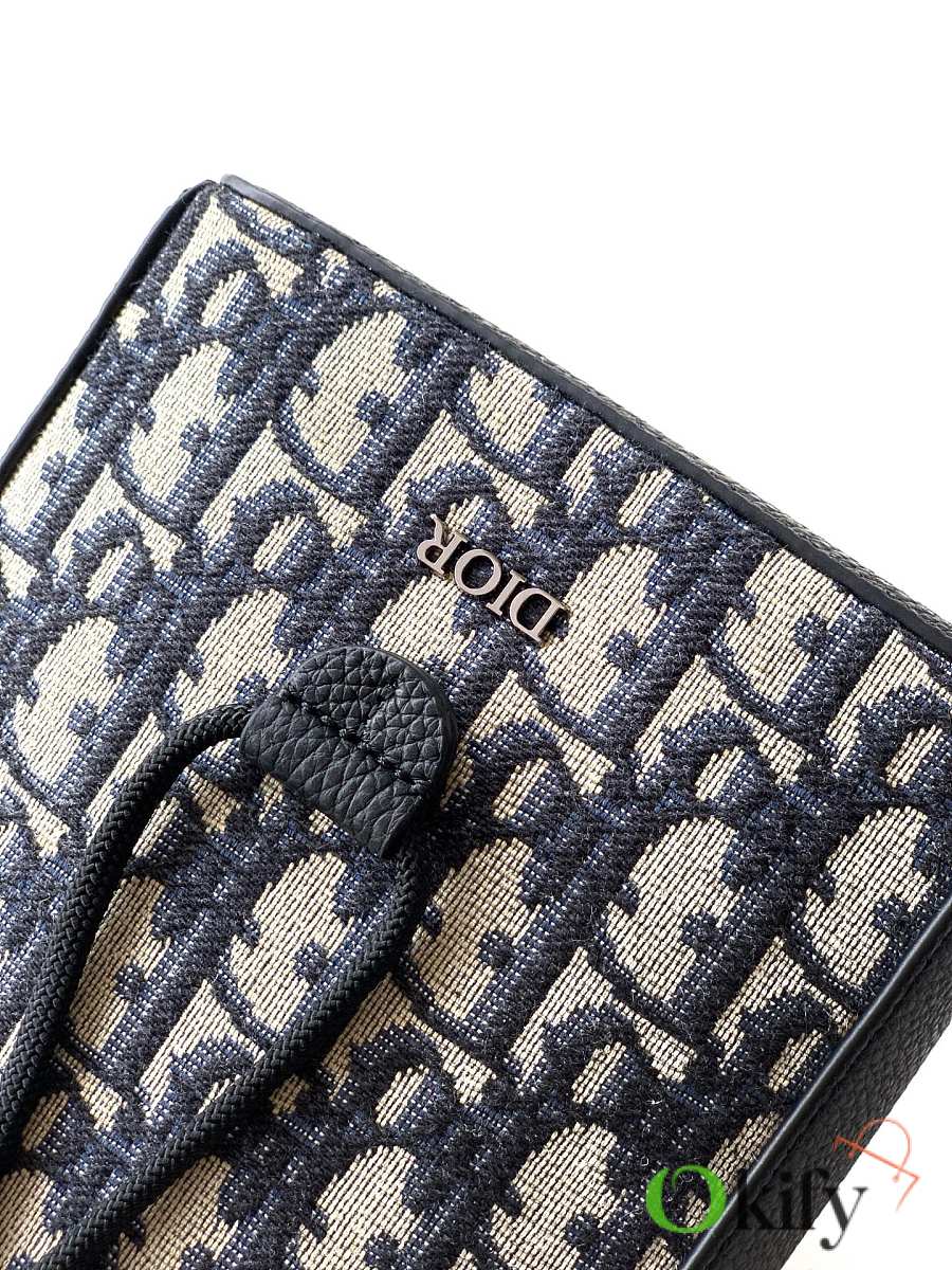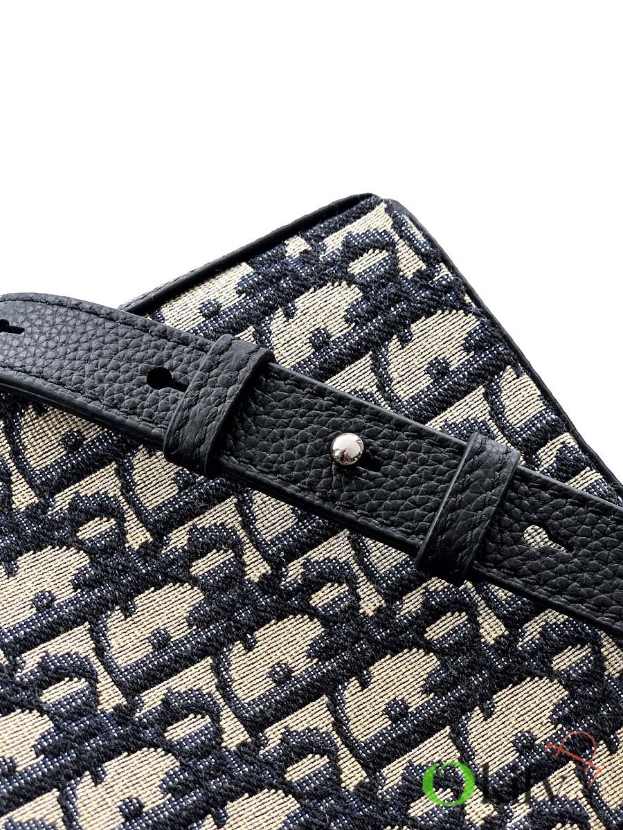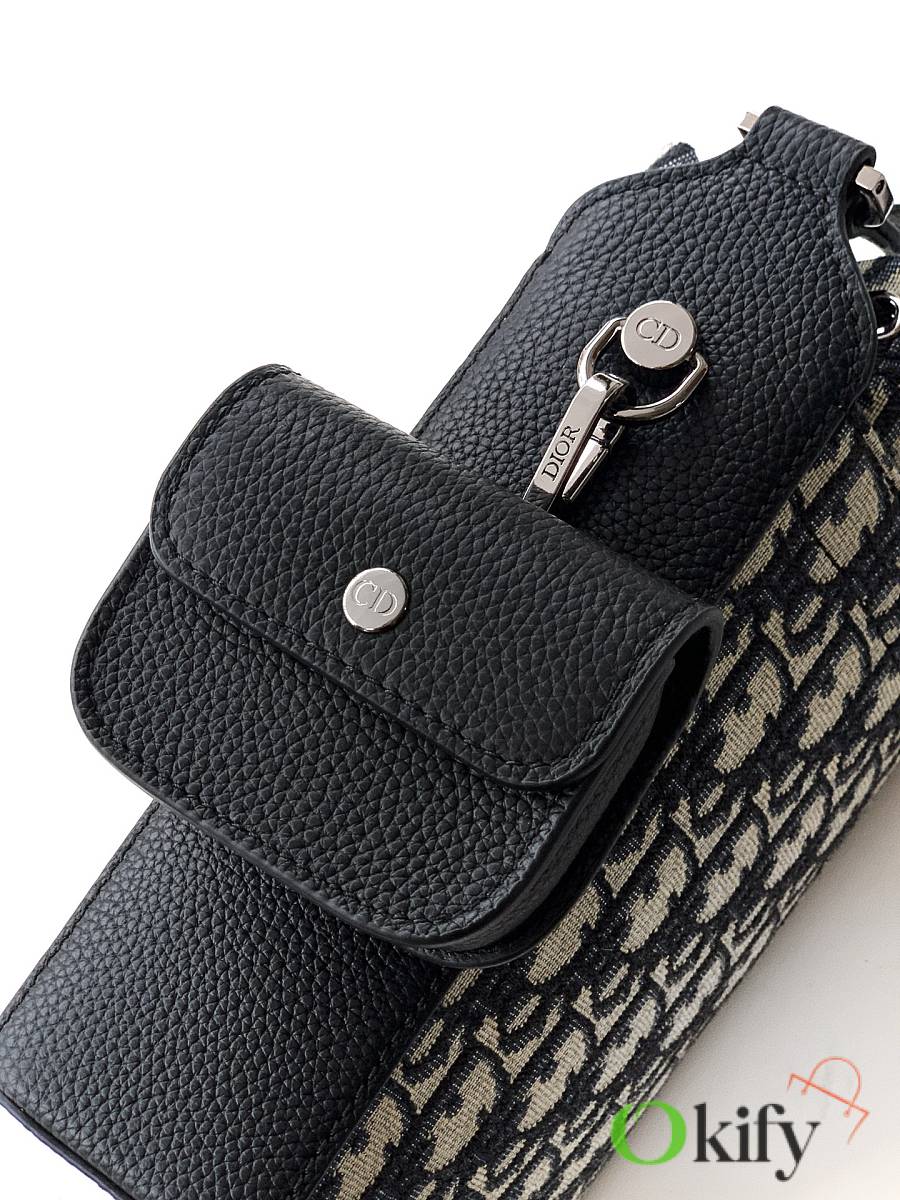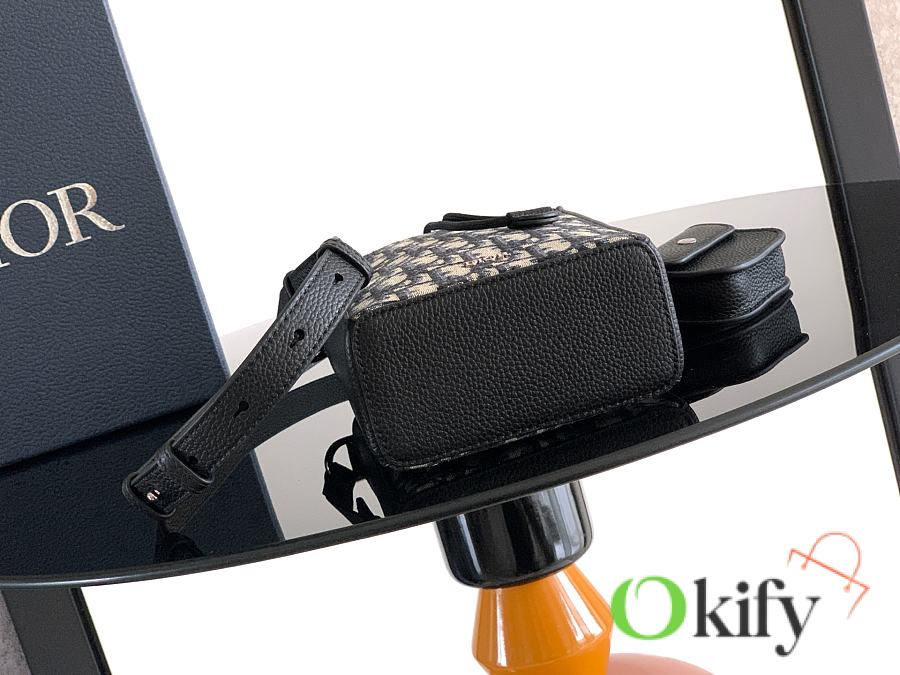 This bucket bag, a new addition to the 2025 Winter Men's Collection, exudes style. Its structured design is crafted from beige and black Oblique printed fabric, enhanced with black grained calfskin details for a sophisticated look, and adorned with the Dior logo on the front. It features an interior drawstring pouch and two slip pockets for everyday essentials, while a detachable black grained calfskin hanging pouch on one side provides easy access to earphones, keys, or coins. The mini version comes with an adjustable leather shoulder strap for shoulder or crossbody wear. Main body: cowhide leather, cotton, technical fabric Lining: Technical fabric, cotton, cowhide leather The main compartment features a drawstring and a clasp engraved with the CD logo. Internal pockets Back pocket Detachable pouch with flap and CD snap Adjustable leather shoulder strap The front is decorated with a Dior logo made of copper-plated metal. The interior is decorated with the Dior embossed logo. Includes dust bag