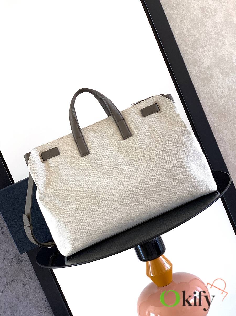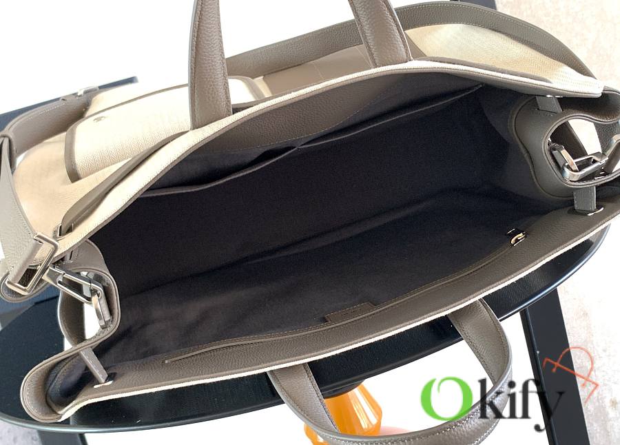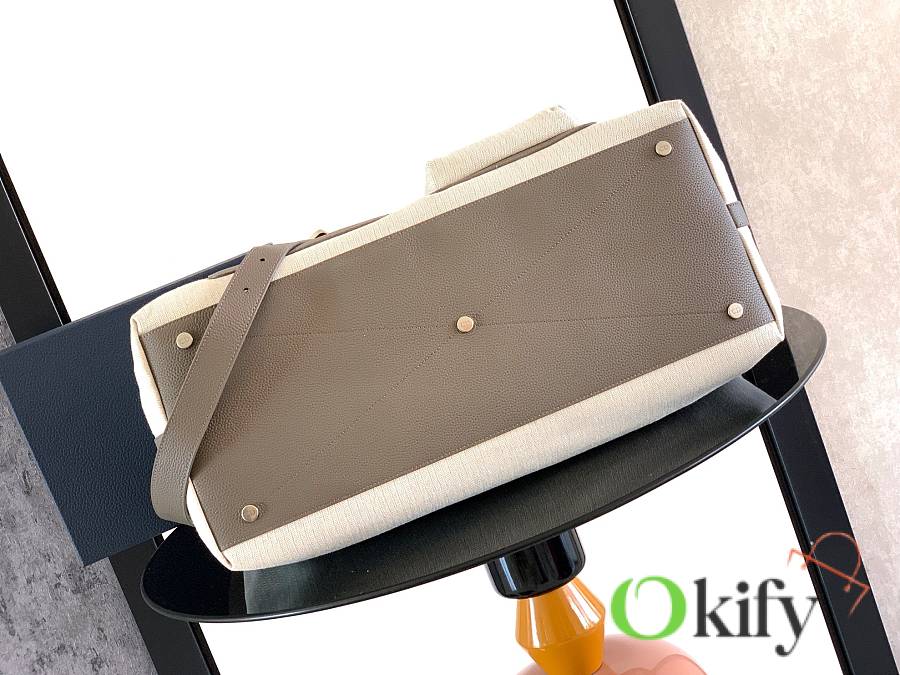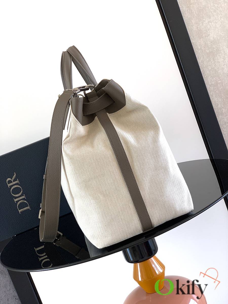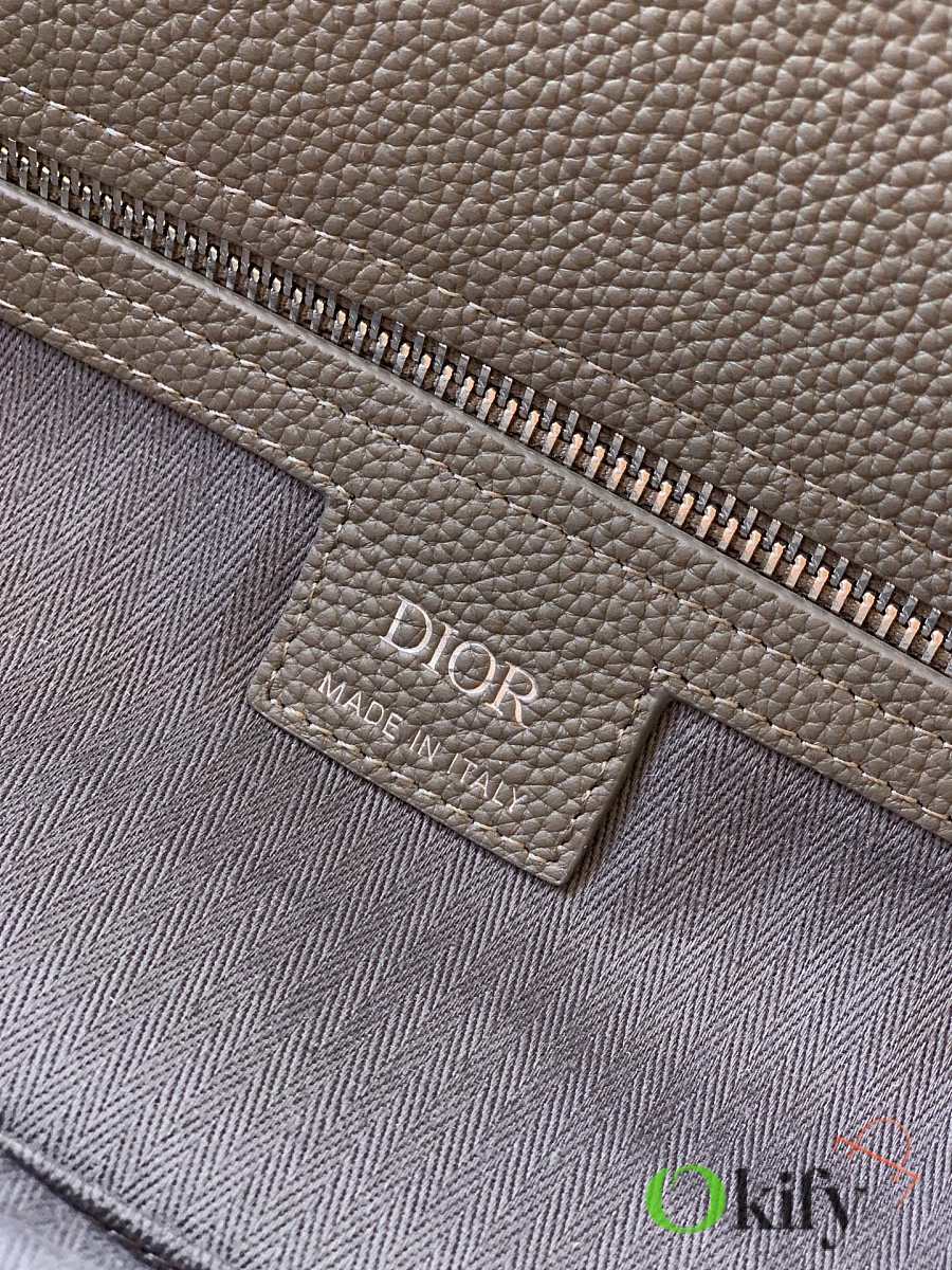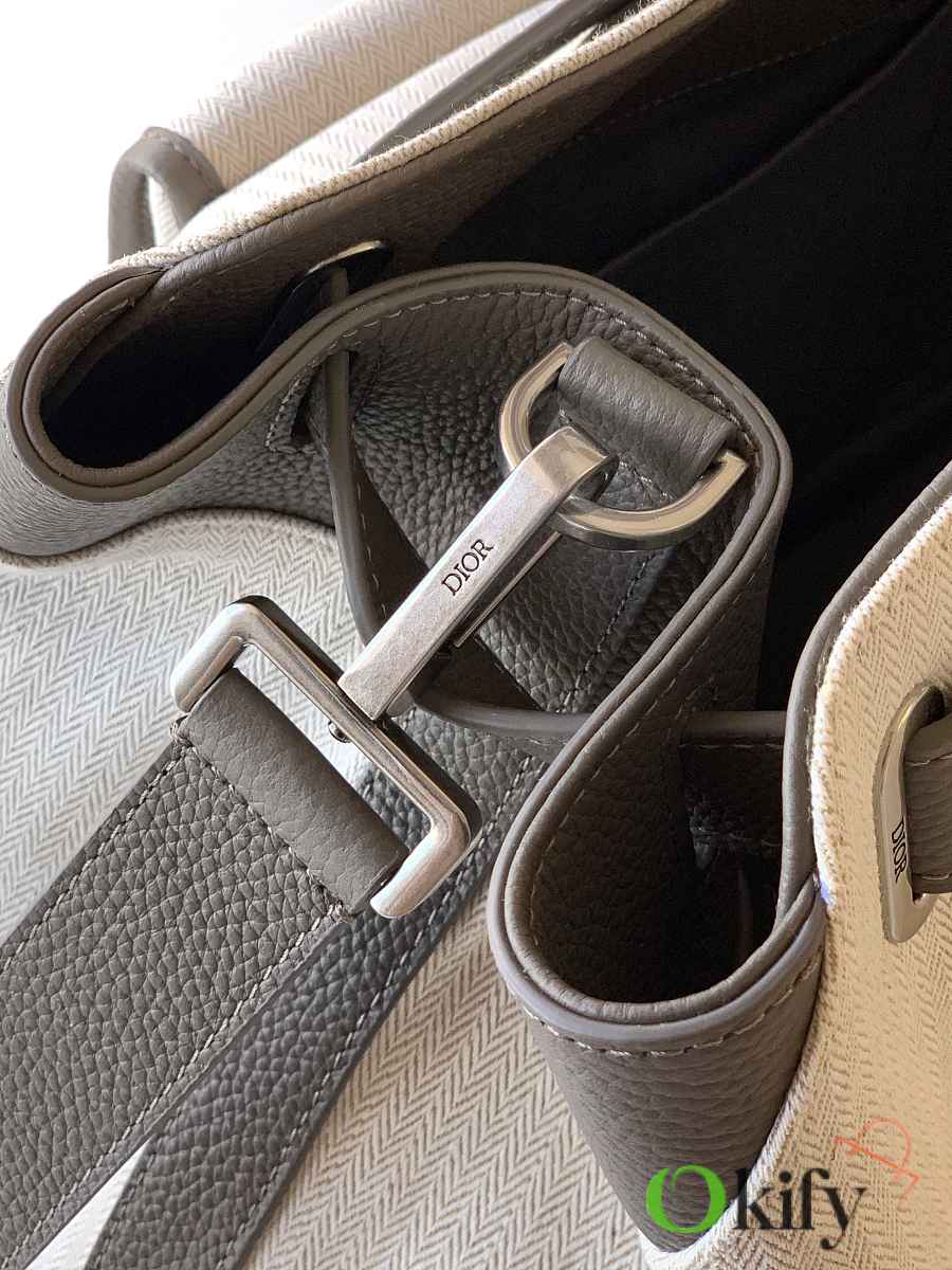 The signature Dior Normandie eyelets enhance its elegance, while the adjustable Dior leather strap allows it to be folded or opened for a relaxed look. The sides showcase a distinctive structural design with Dior logo feet and a padded top handle, highlighting its refined charm. The spacious interior, lined with herringbone fabric, includes two slip pockets and one zip pocket. Leather slip pockets and a front flap pocket add a touch of sophistication. The large size comes with an adjustable, detachable leather shoulder strap for carrying by hand or over the shoulder.