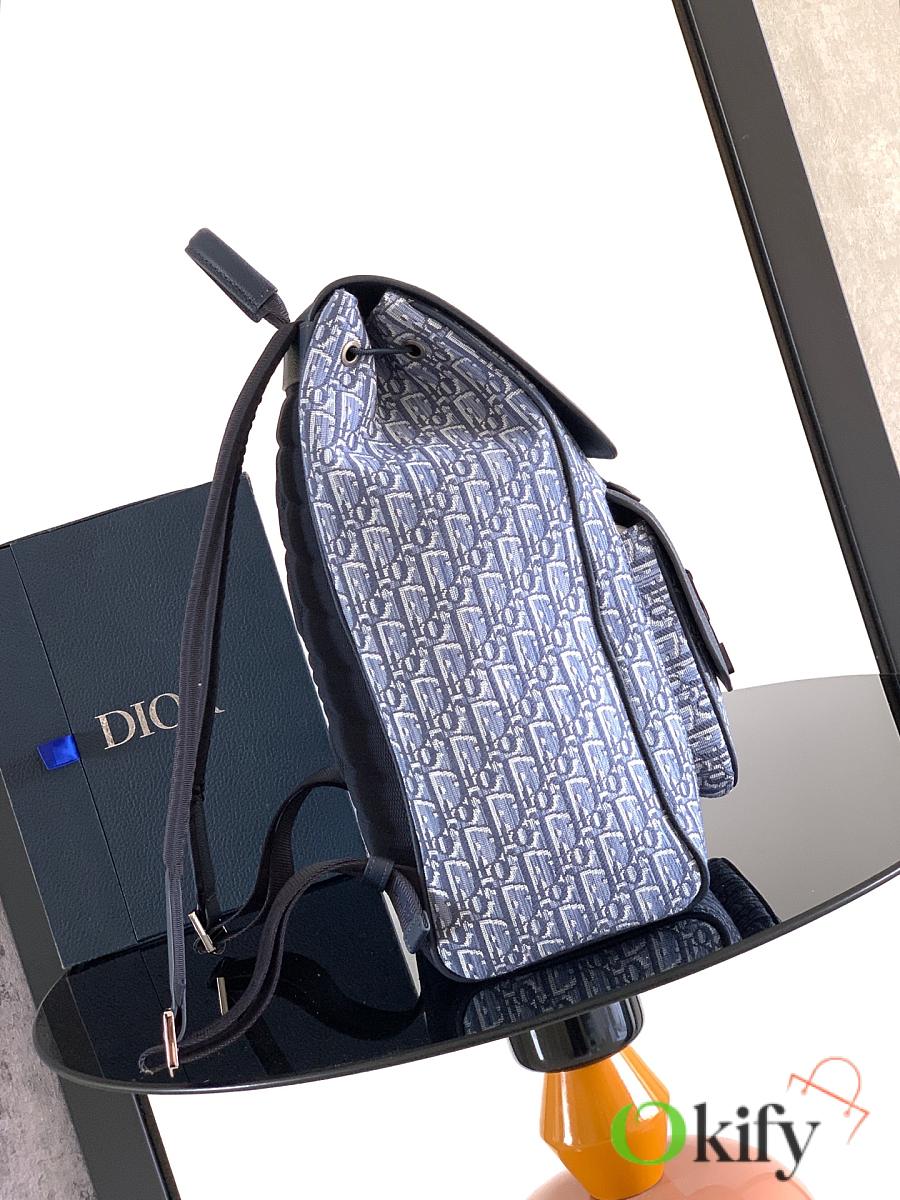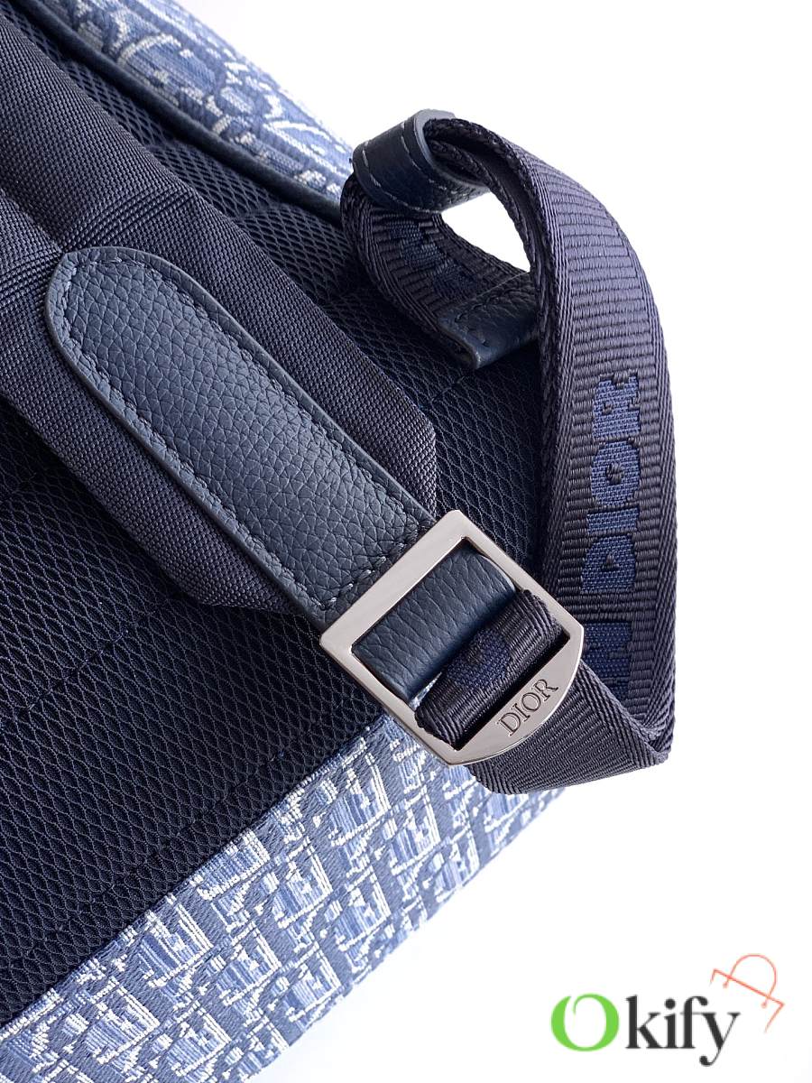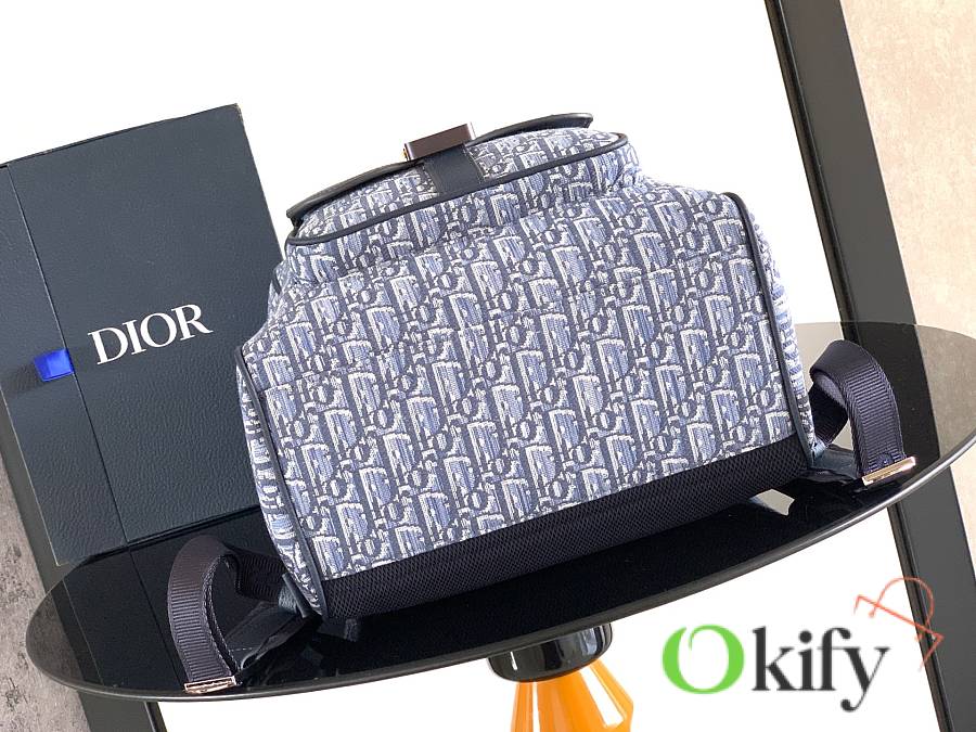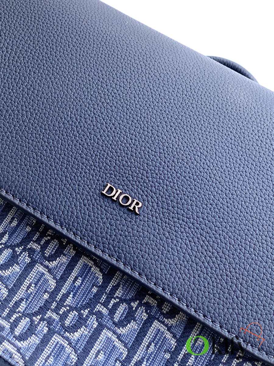 This saddle-style flap backpack features a stylish, original design that highlights the saddle silhouette. Crafted from materials including blue Oblique printed fabric, it's adorned with tonal grained calfskin leather details and the Dior logo on the front. Spacious and well-designed, it includes a compartment for everyday essentials, while the front flap pocket with an aluminum buckle provides easy access to a wallet, keys, earphones, or phone. Practical and versatile, it's the perfect finishing touch to any outfit. Main body: technical fabric, cotton, cowhide leather Lining: Technical fabric, cotton, cowhide leather The main compartment features a flip-top and drawstring. Internal flat computer compartment Front flap pocket with CD logo buckle Top leather handle Adjustable padded shoulder straps The back is made of padded mesh fabric and decorated with the Dior logo. The front is decorated with a Dior logo made of copper-plated metal. The interior is decorated with the Dior embossed logo. Includes dust bag