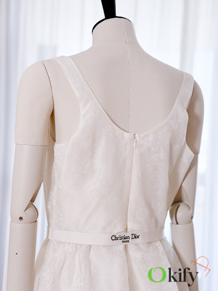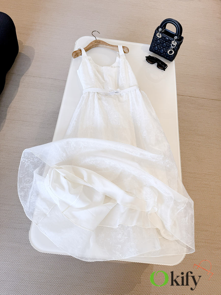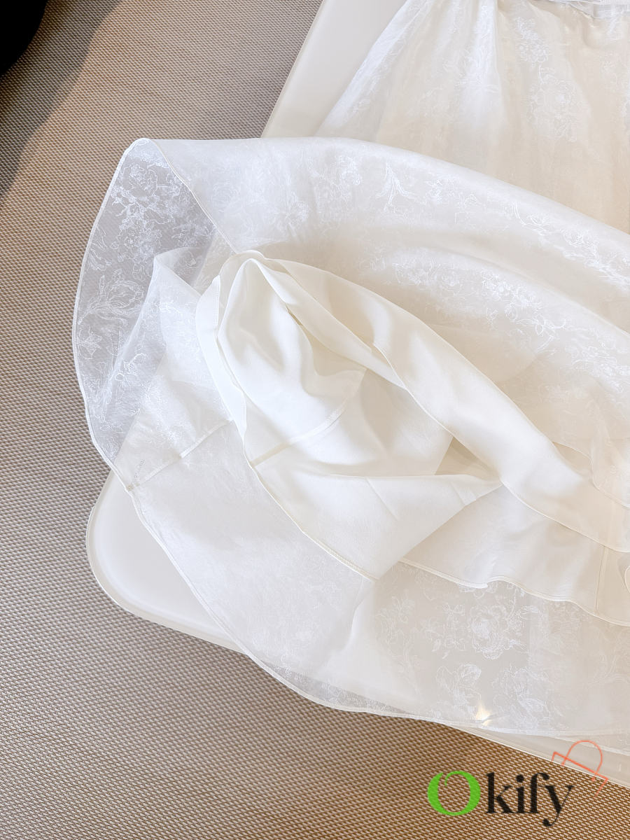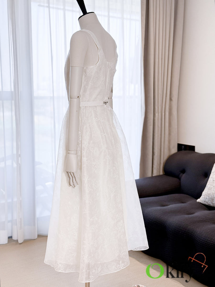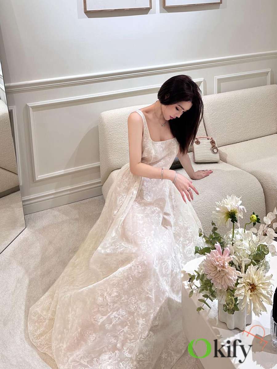 The silk organza fabric is adorned with delicate lace and floral embellishments, creating a subtle and refined effect. The square neckline and halter design are elegant and accentuate the collarbone. The CD embroidered butterfly closure at the waist highlights a slender figure, and the flowing skirt exudes a sense of luxury.