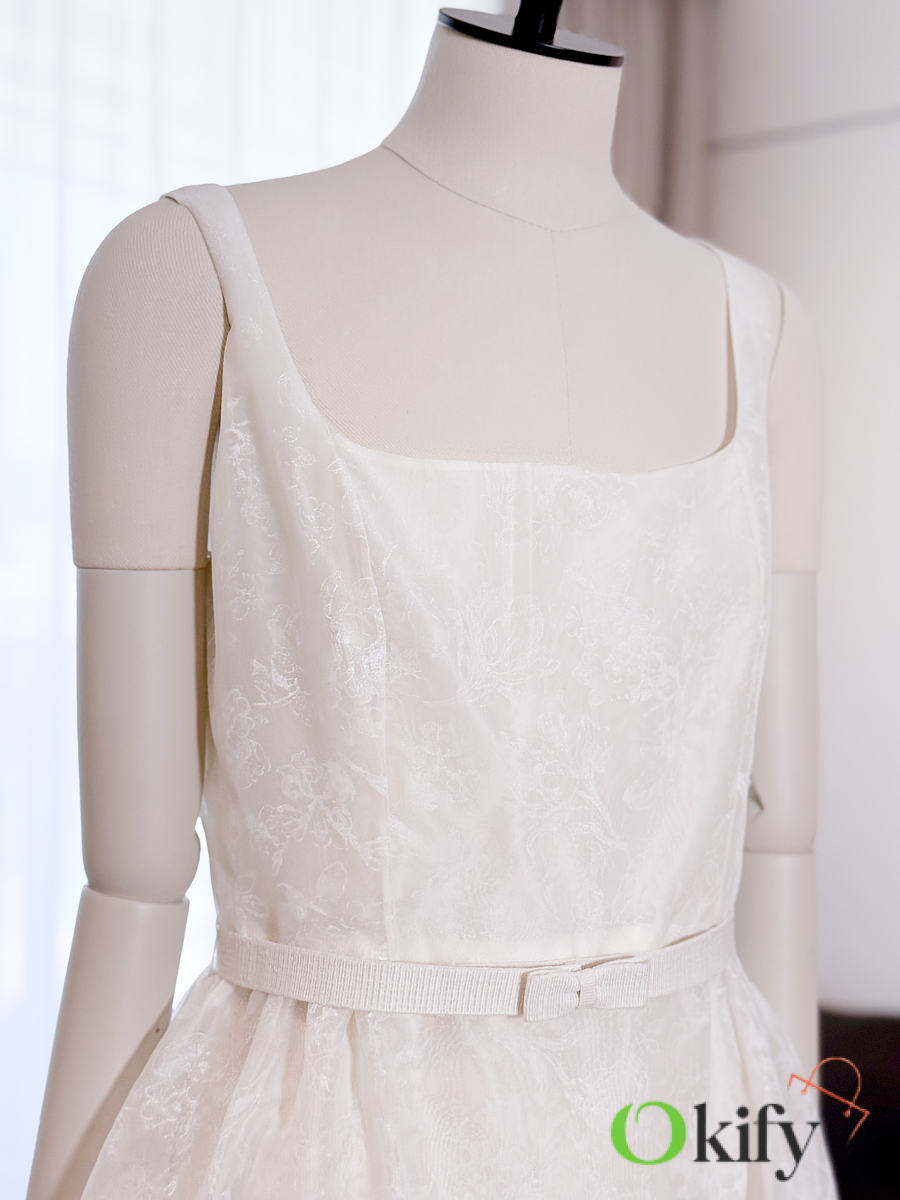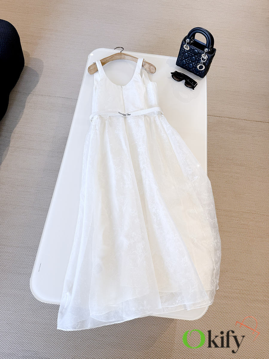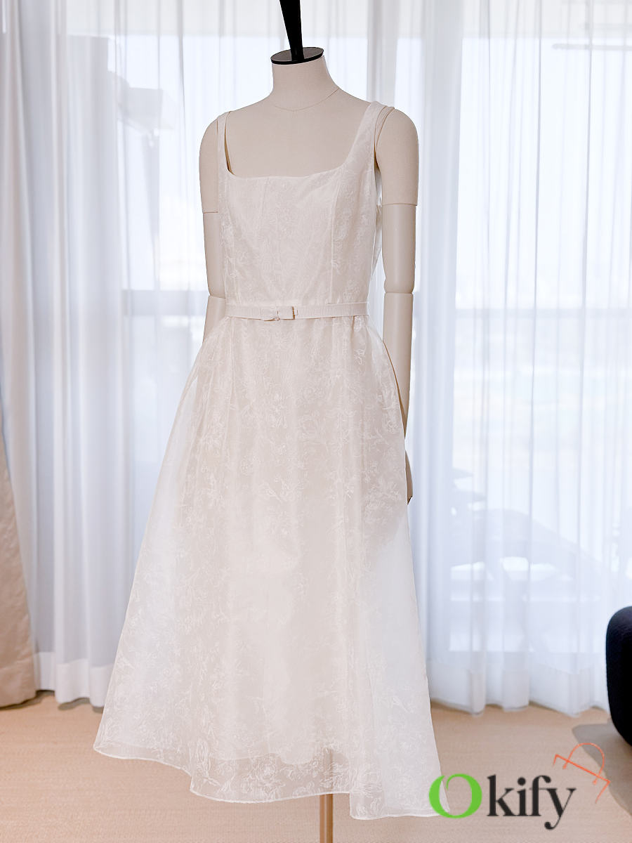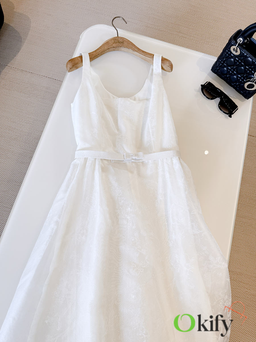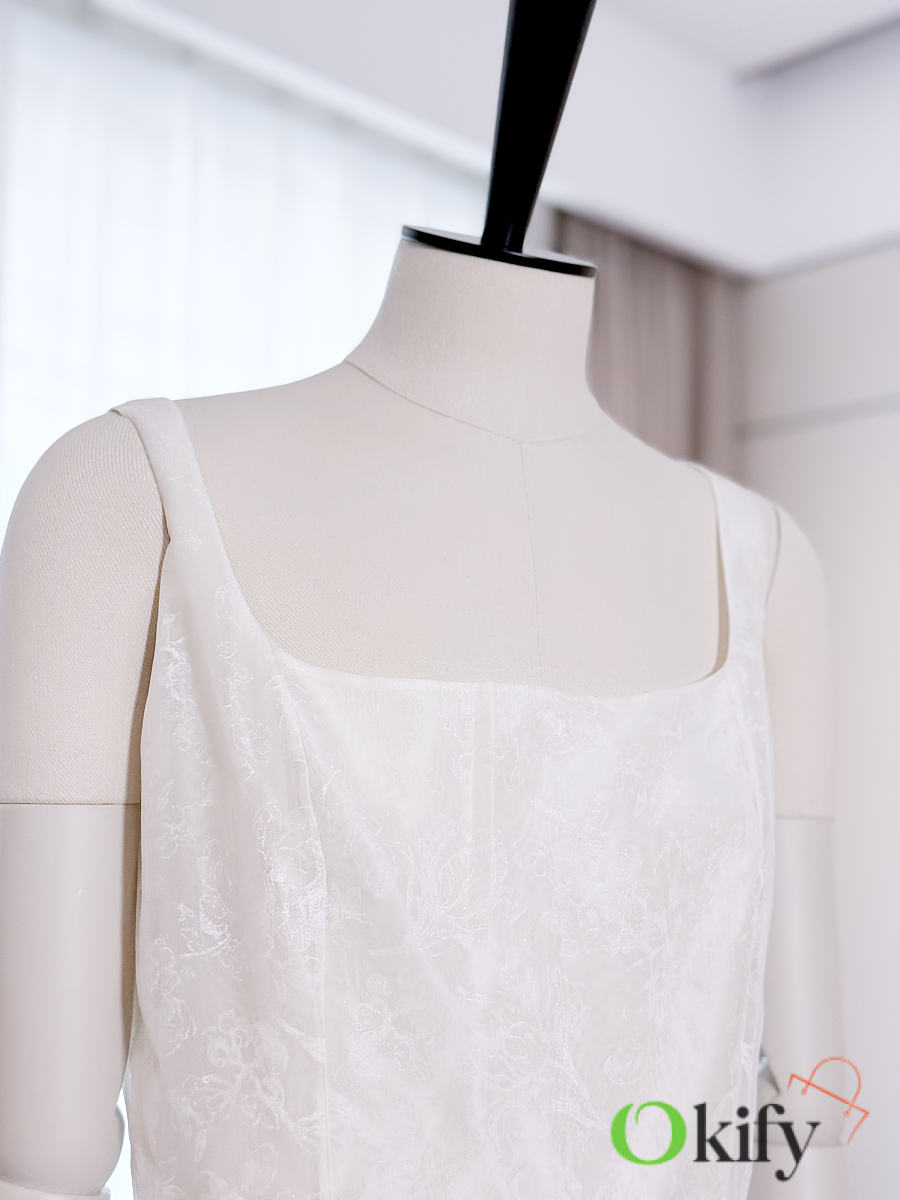 The silk organza fabric is adorned with delicate lace and floral embellishments, creating a subtle and refined effect. The square neckline and halter design are elegant and accentuate the collarbone. The CD embroidered butterfly closure at the waist highlights a slender figure, and the flowing skirt exudes a sense of luxury.