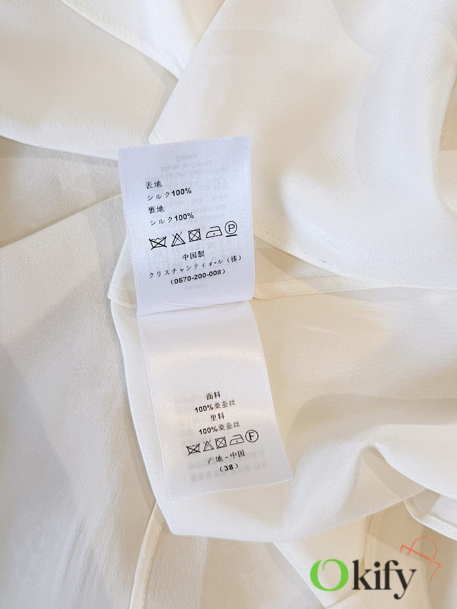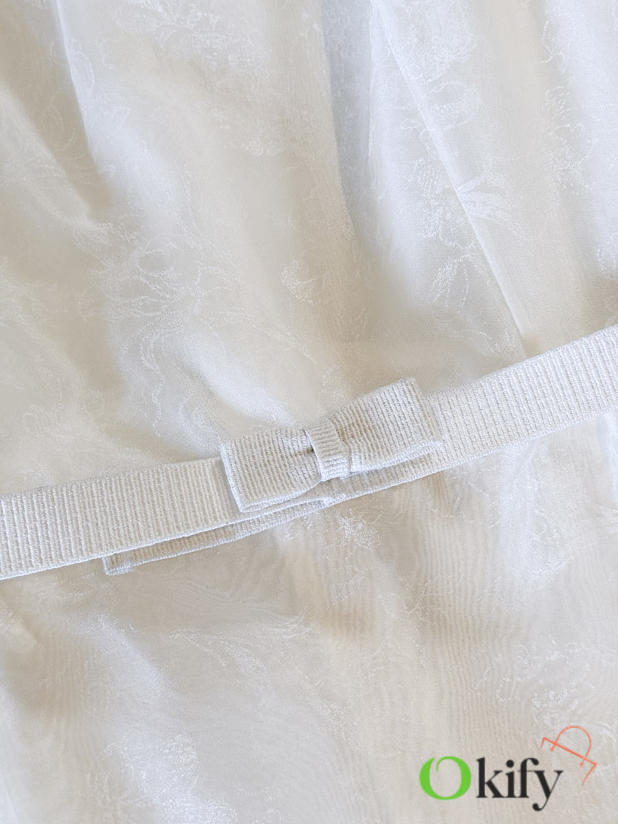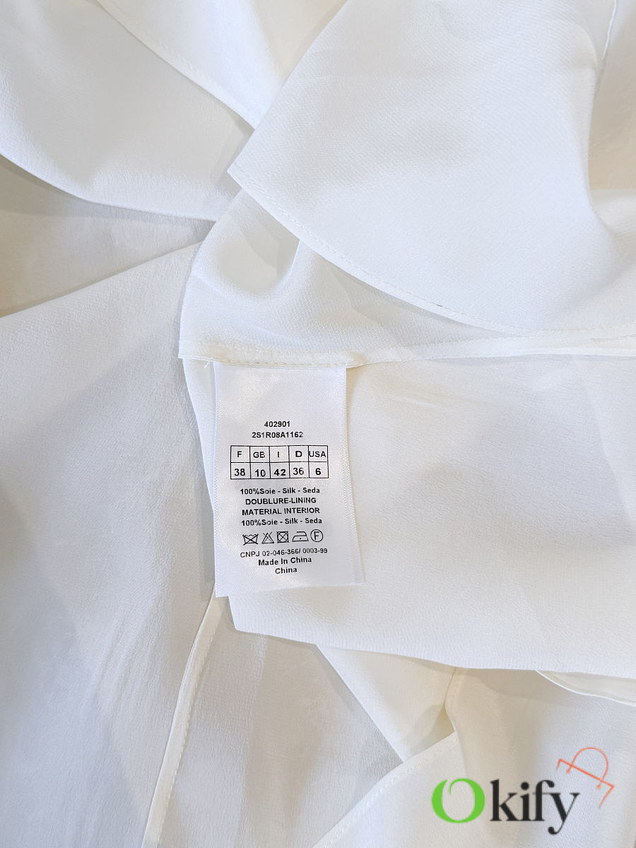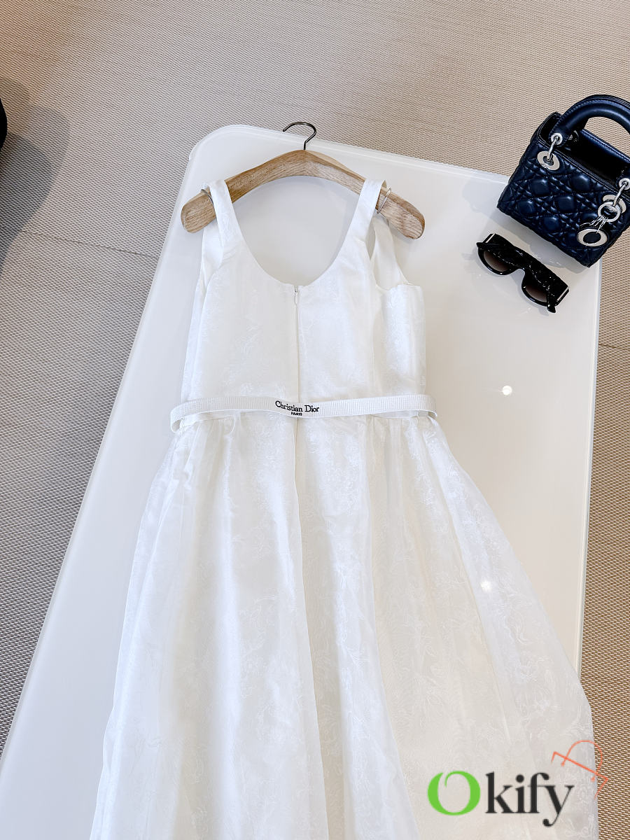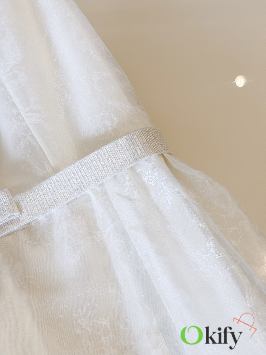 The silk organza fabric is adorned with delicate lace and floral embellishments, creating a subtle and refined effect. The square neckline and halter design are elegant and accentuate the collarbone. The CD embroidered butterfly closure at the waist highlights a slender figure, and the flowing skirt exudes a sense of luxury.