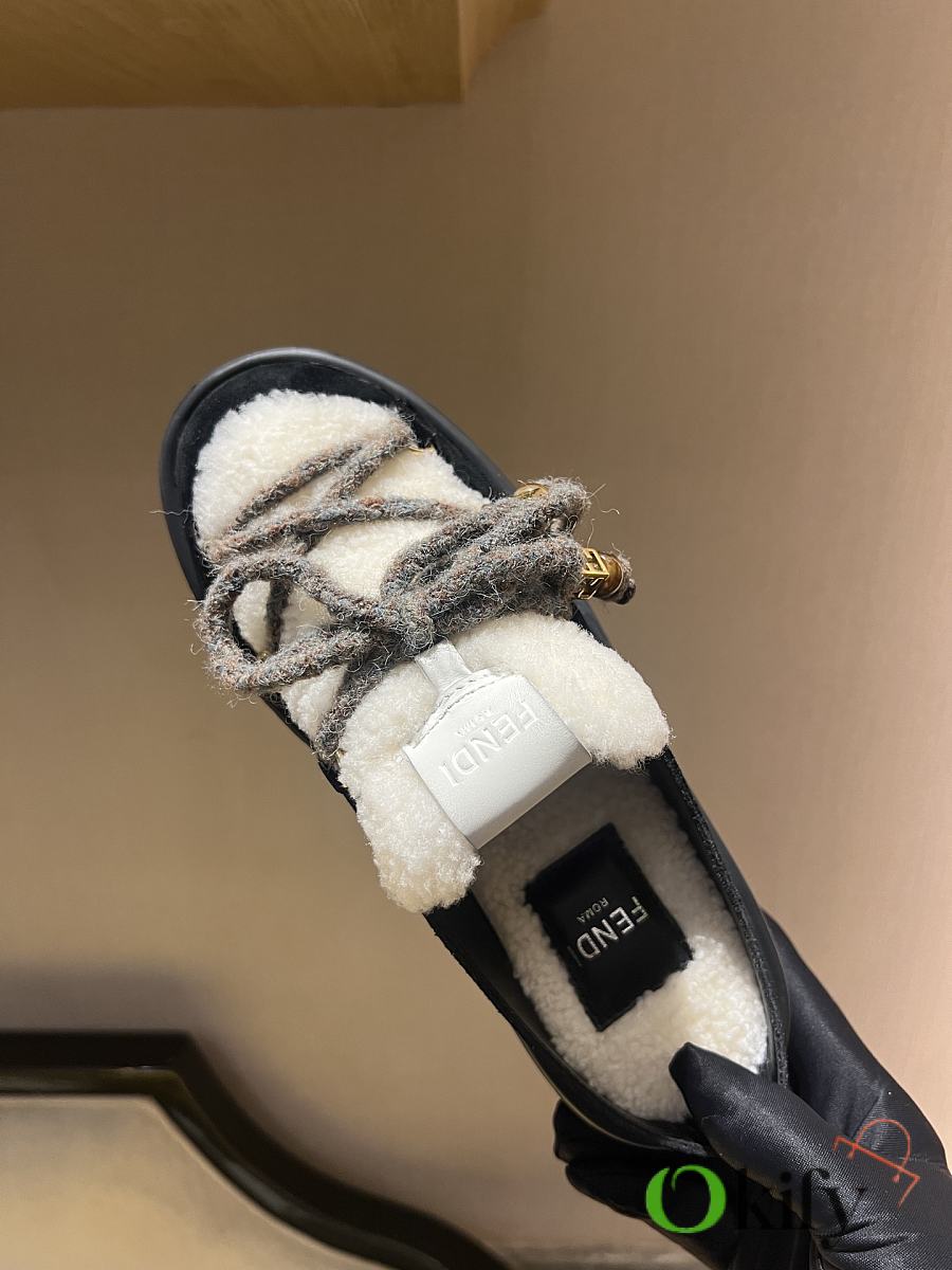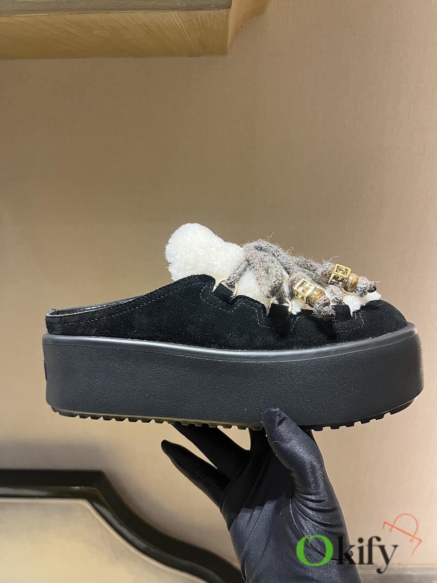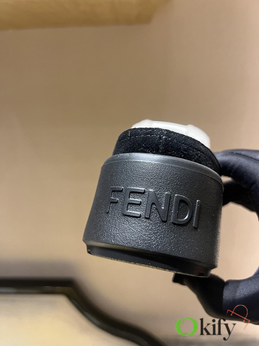 The shoes are crafted from light brown waterproof suede leather with a tonal embossed FF pattern on the upper. The tongue features a metal ring charm; the right shoe has a braided cord with a mink pom-pom and gold-tone FF bead; the left shoe features a two-tone cord with gold-tone FF beads and an embossed tag with the Pequin logo and pattern. A thick, tonal rubber sole completes the look, with the FEND1 logo on the heel.