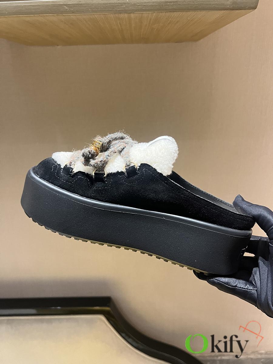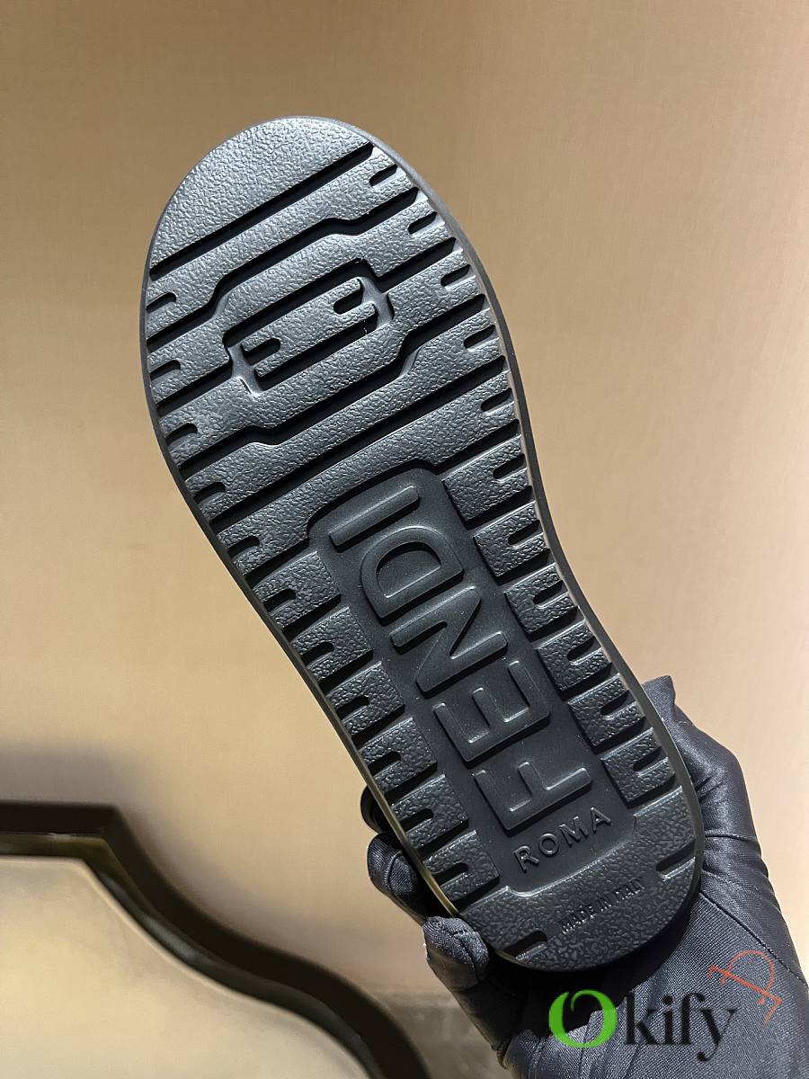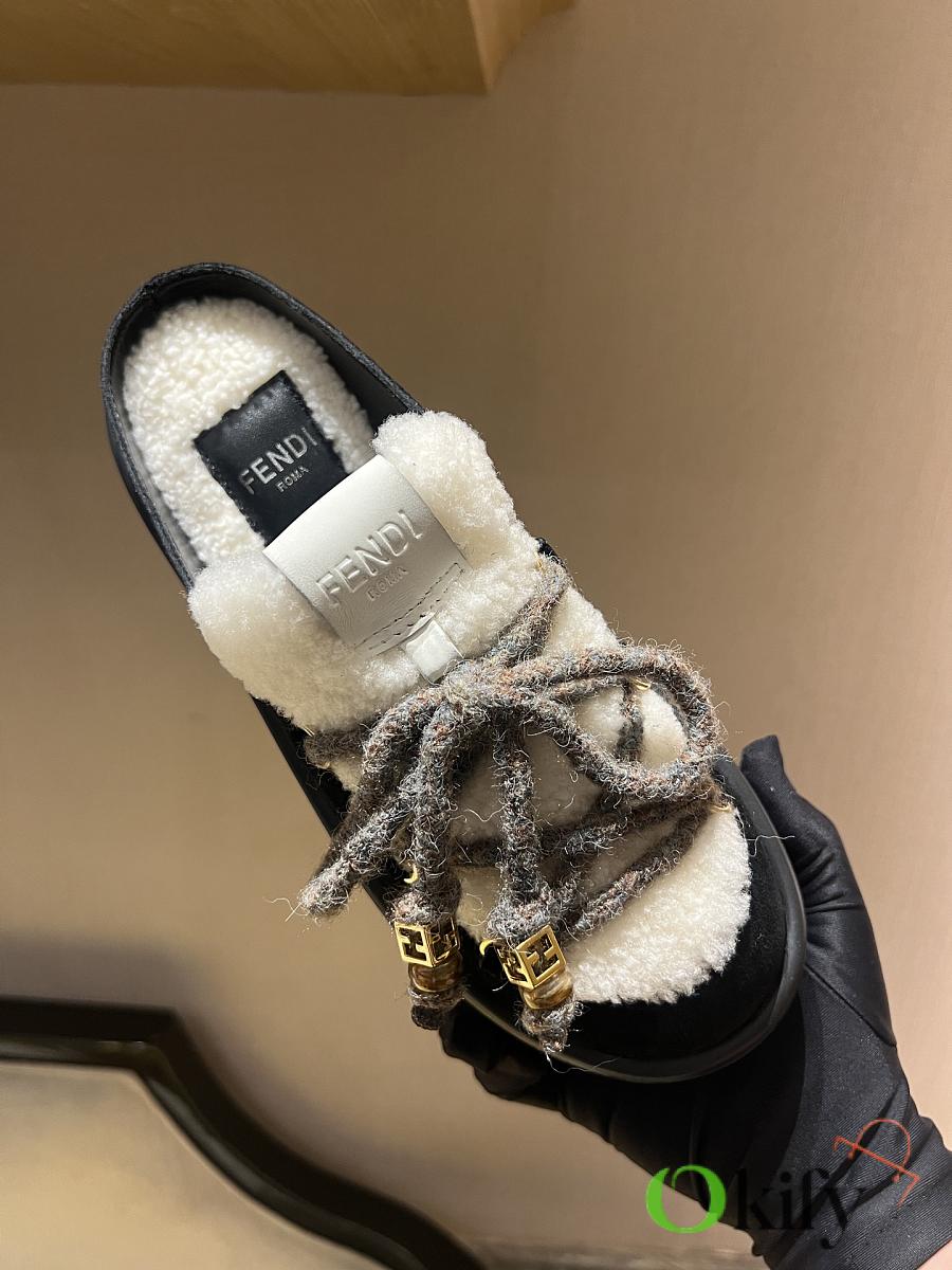 The shoes are crafted from light brown waterproof suede leather with a tonal embossed FF pattern on the upper. The tongue features a metal ring charm; the right shoe has a braided cord with a mink pom-pom and gold-tone FF bead; the left shoe features a two-tone cord with gold-tone FF beads and an embossed tag with the Pequin logo and pattern. A thick, tonal rubber sole completes the look, with the FEND1 logo on the heel.