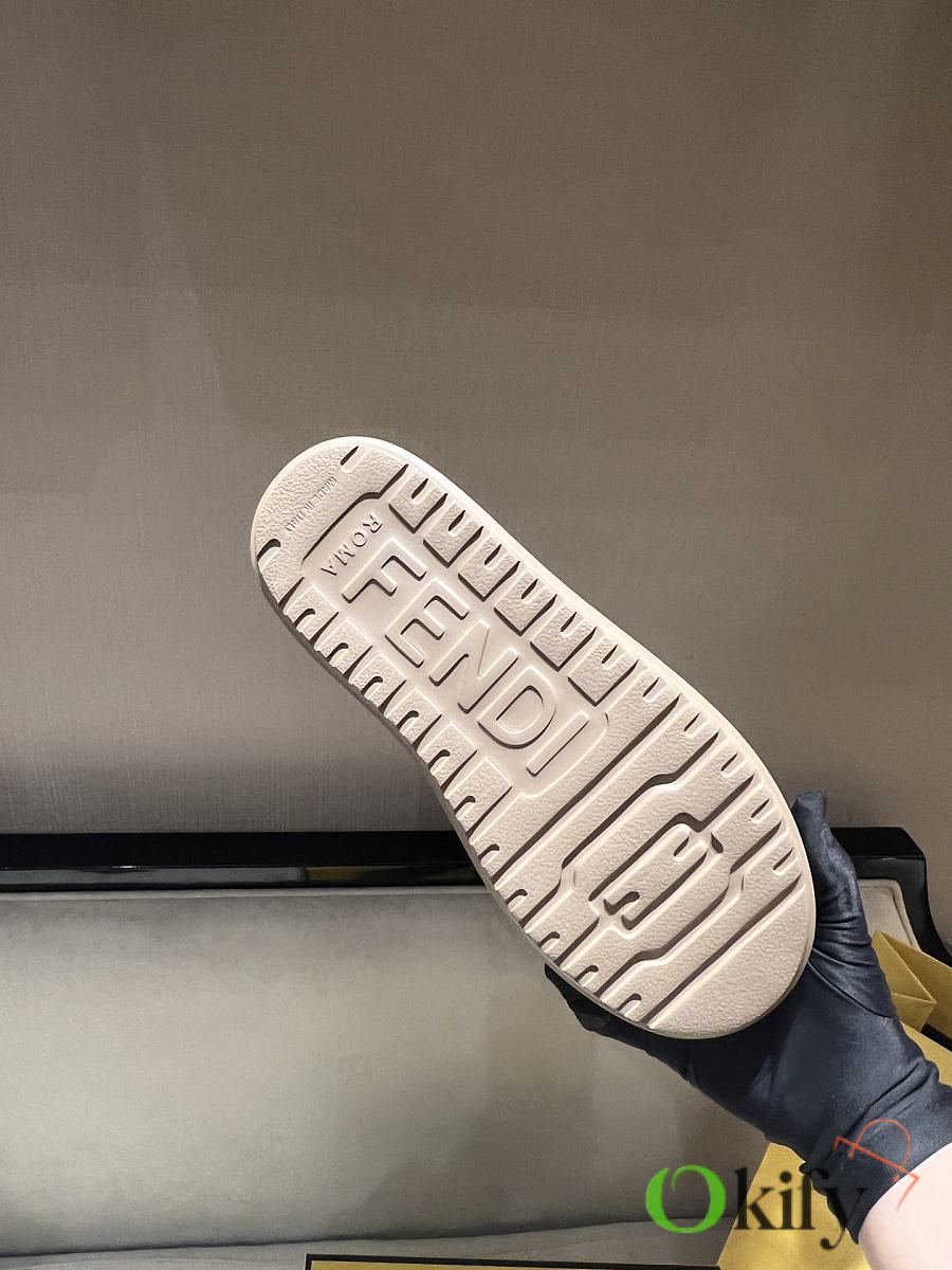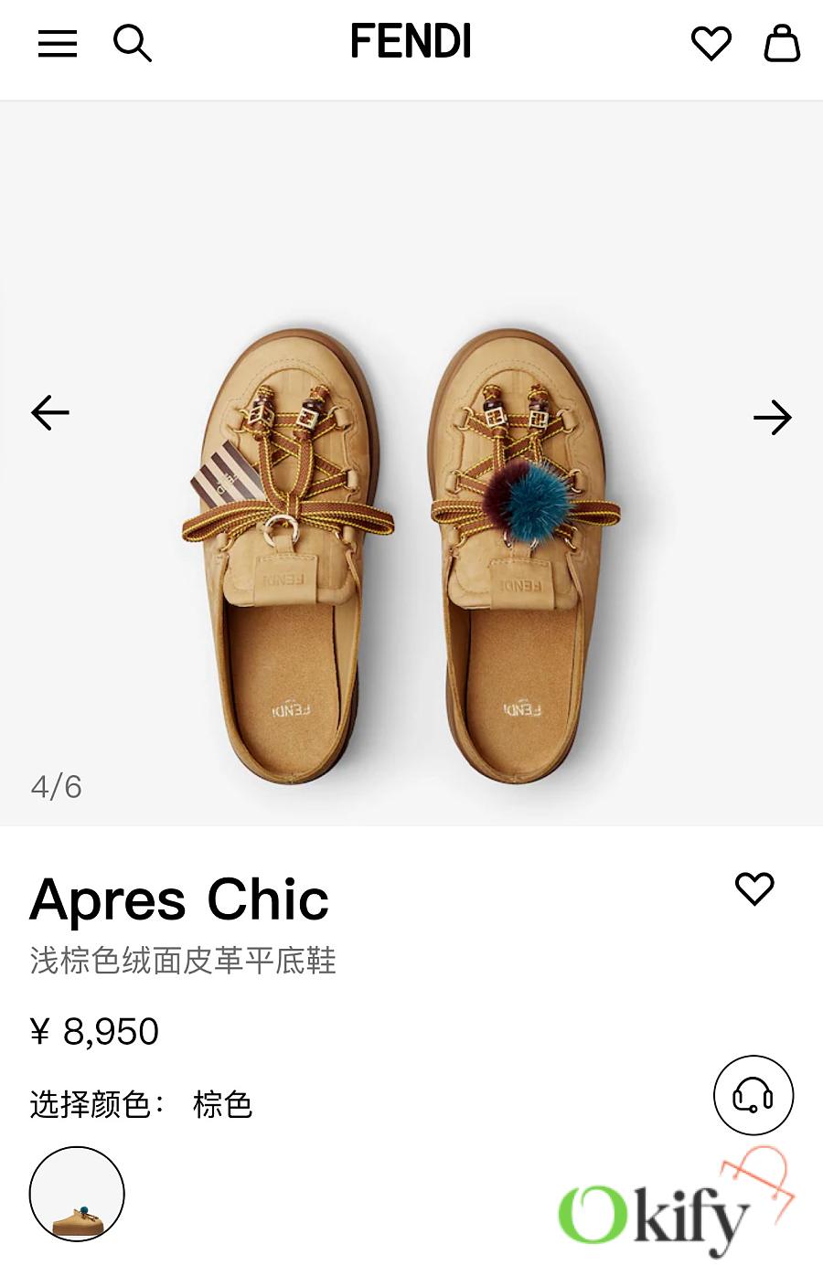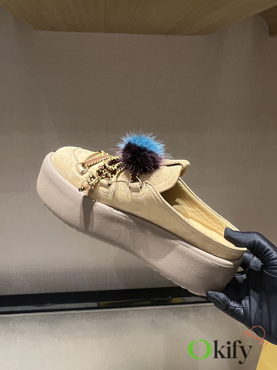The shoes are crafted from light brown waterproof suede leather with a tonal embossed FF pattern on the upper. The tongue features a metal ring charm; the right shoe has a braided cord with a mink pom-pom and gold-tone FF bead; the left shoe features a two-tone cord with gold-tone FF beads and an embossed tag with the Pequin logo and pattern. A thick, tonal rubber sole completes the look, with the FEND1 logo on the heel.