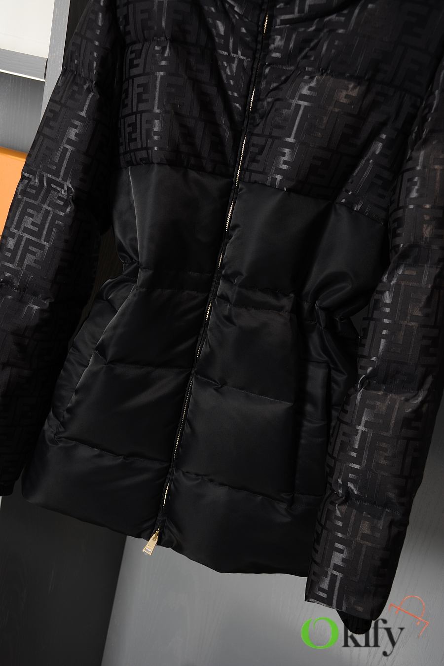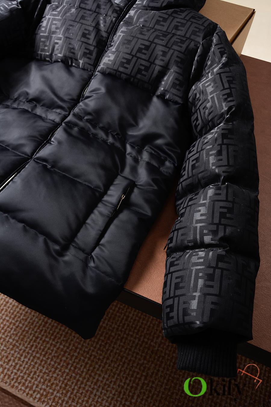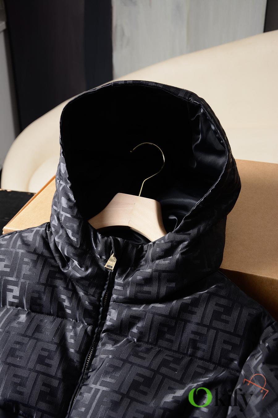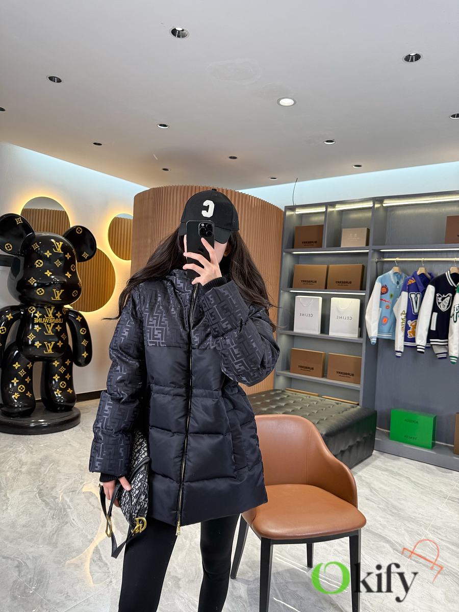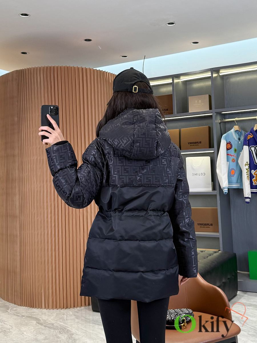 High-neck parka with a drawstring hood. Slanted pockets, knitted cuffs. Front zip closure. Glossy jacquard nylon material adorned with the iconic black FF pattern.