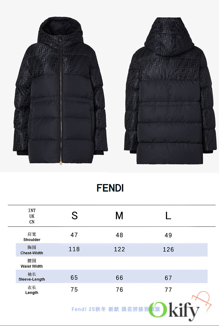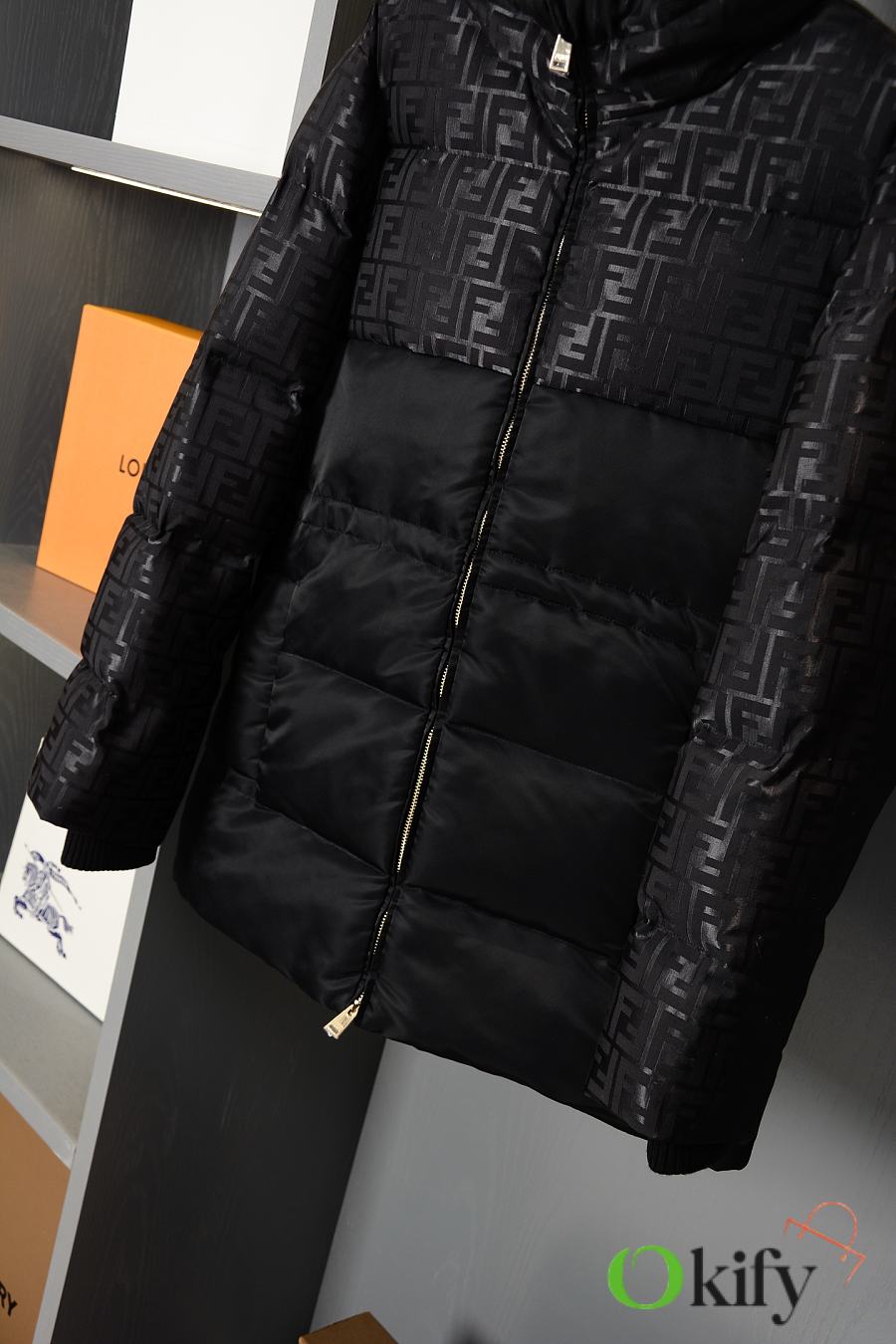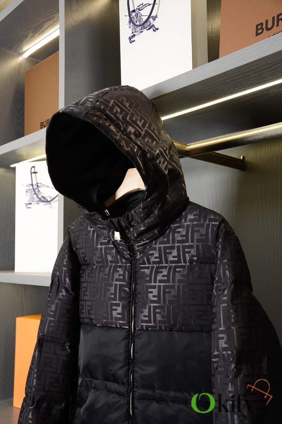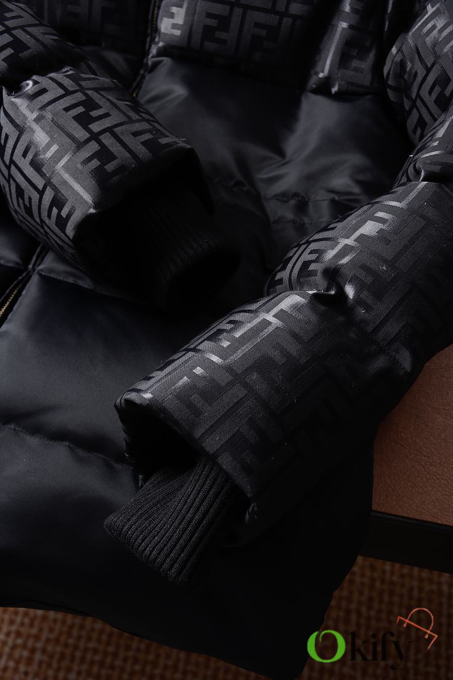High-neck parka with a drawstring hood. Slanted pockets, knitted cuffs. Front zip closure. Glossy jacquard nylon material adorned with the iconic black FF pattern.