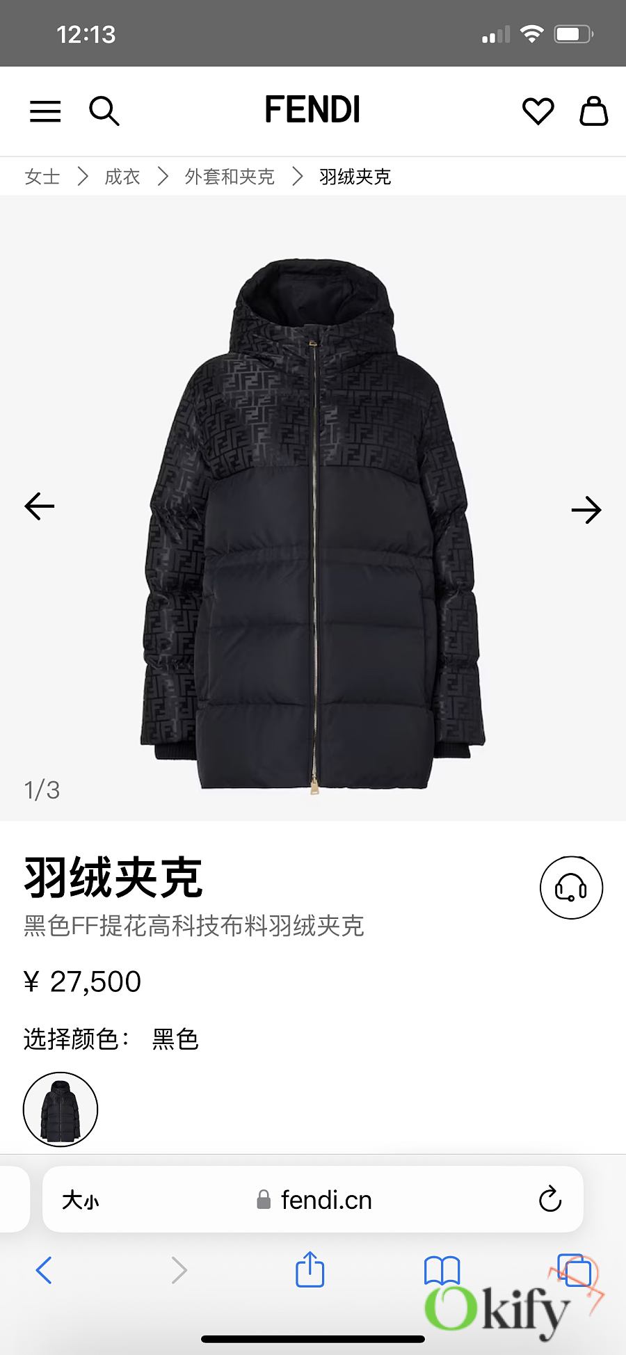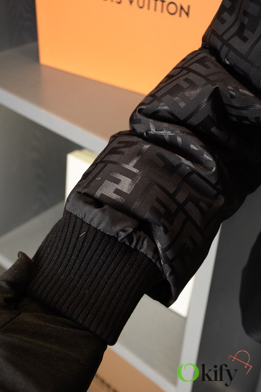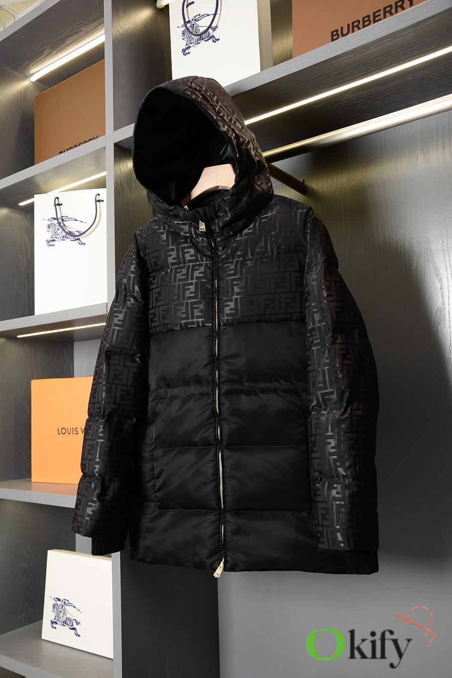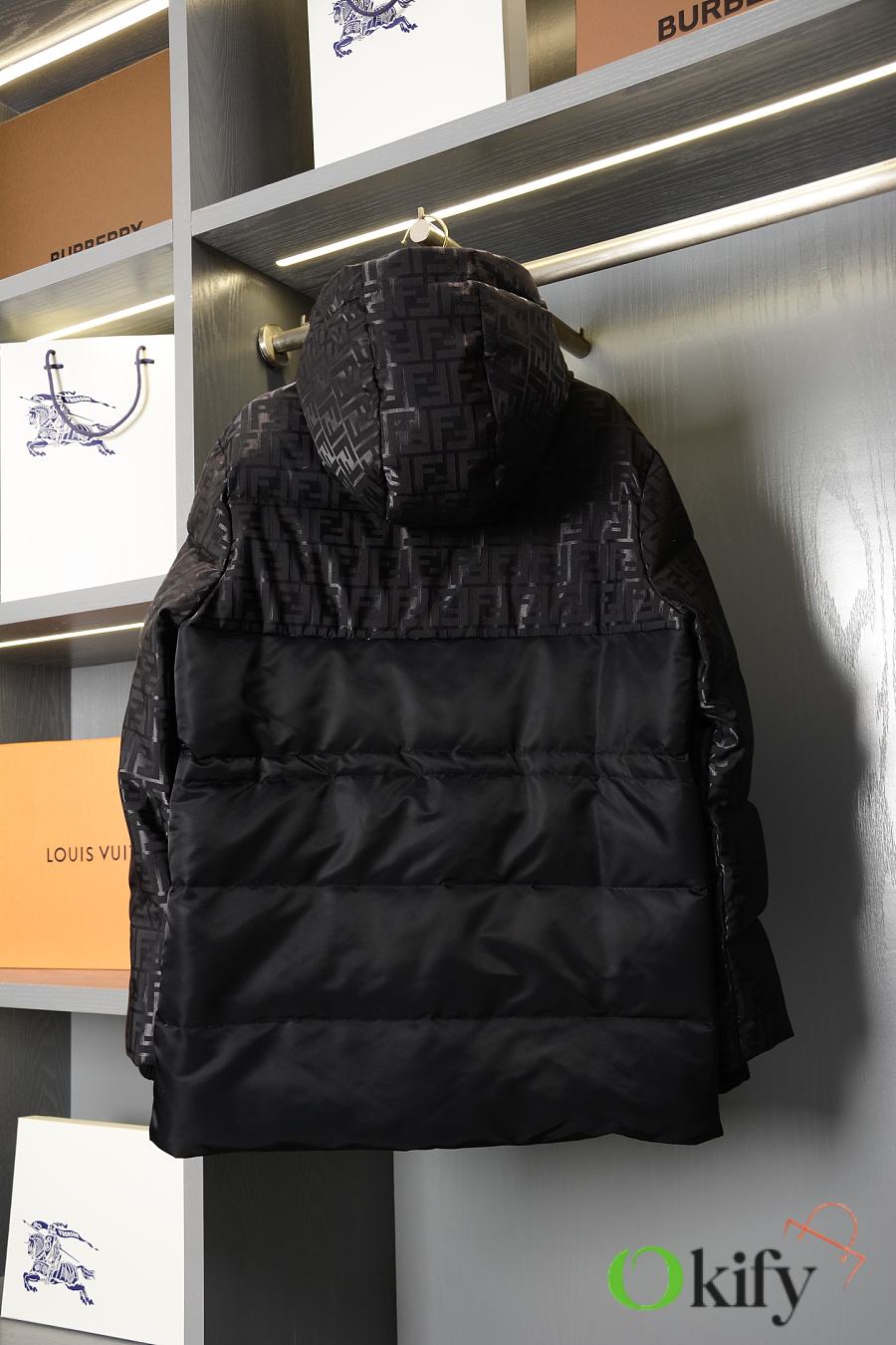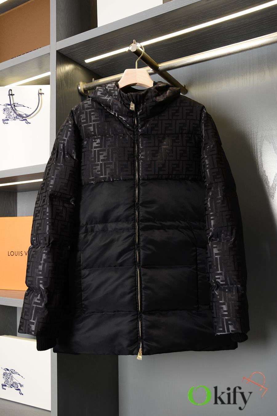 High-neck parka with a drawstring hood. Slanted pockets, knitted cuffs. Front zip closure. Glossy jacquard nylon material adorned with the iconic black FF pattern.