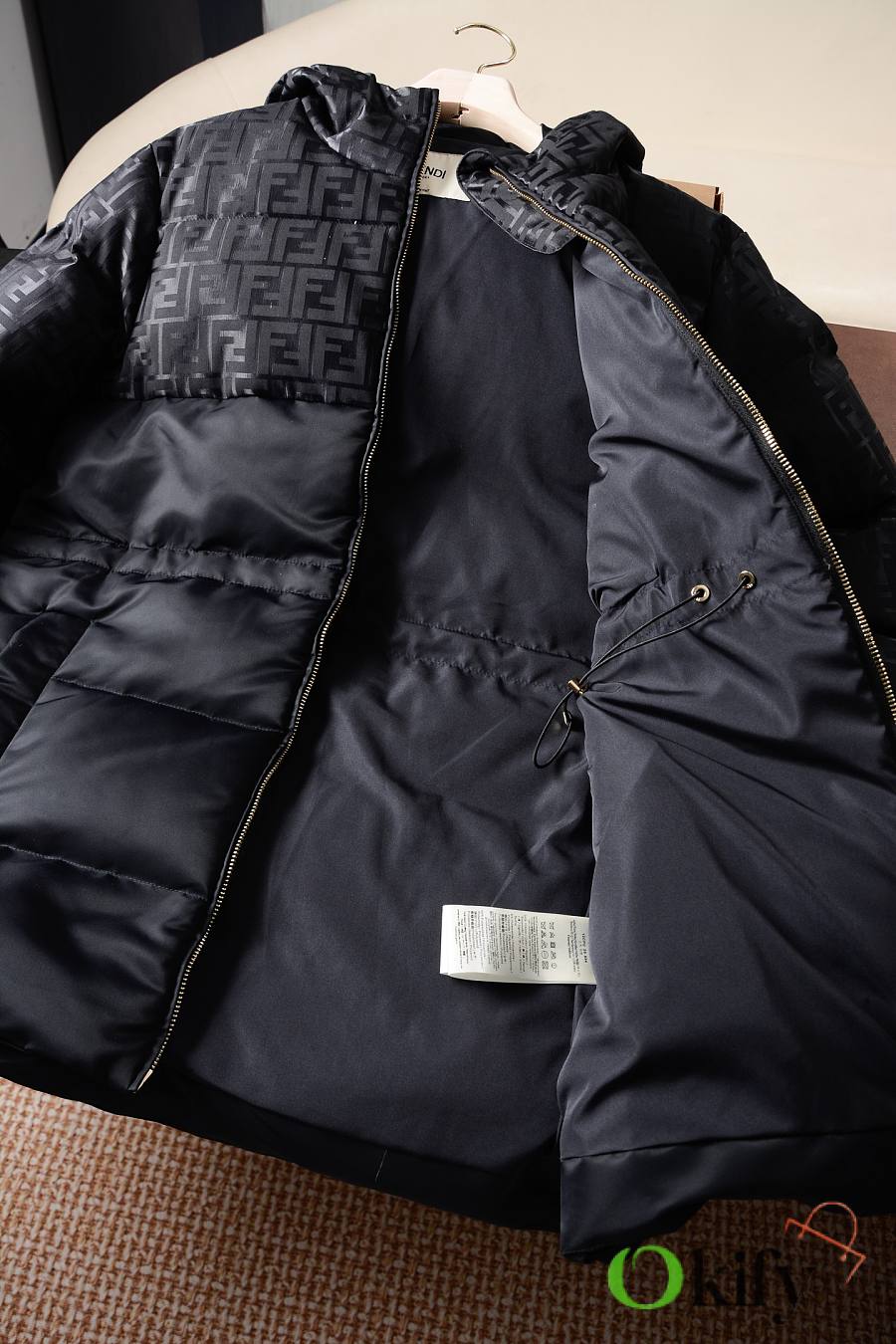 This Fendi monogram down jacket features high-tech waterproof and windproof nylon fabric. Filled with duck down, it offers exceptional warmth. The drawstring waist allows for both a fitted and relaxed fit, making it both practical and stylish.