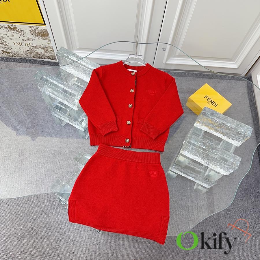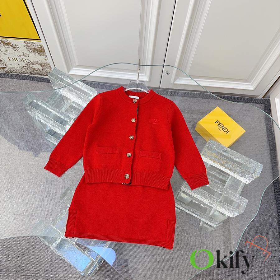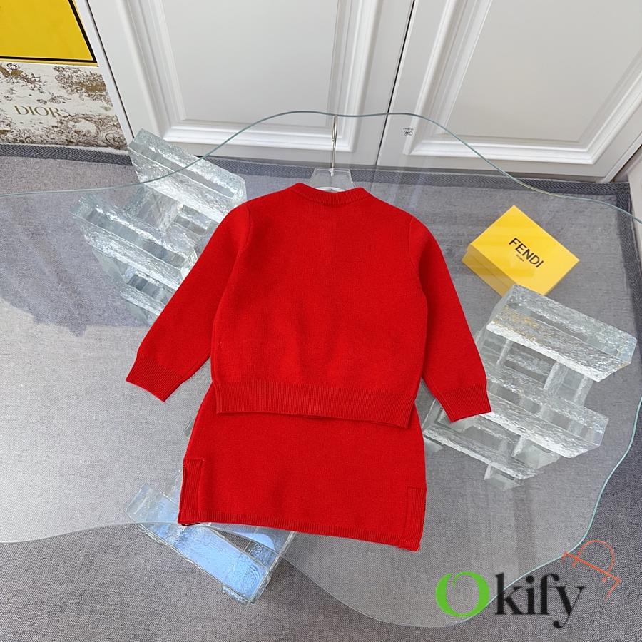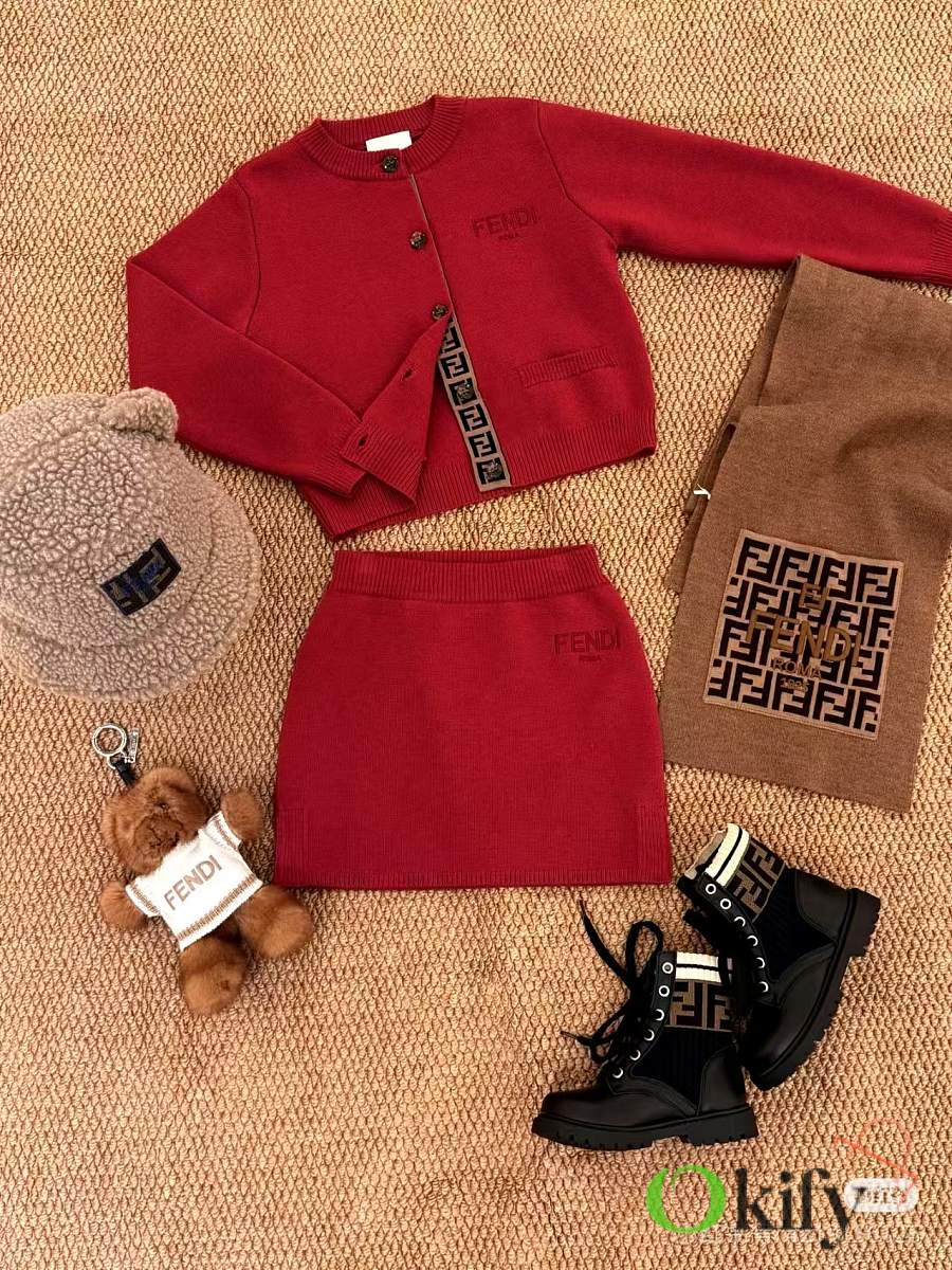 FD children's knitted set in a super vibrant red! The latest children's F-ribbon set with embroidered logo design! Knitted cardigan + pencil skirt. See the detailed pictures for the knitted ribbon craftsmanship!