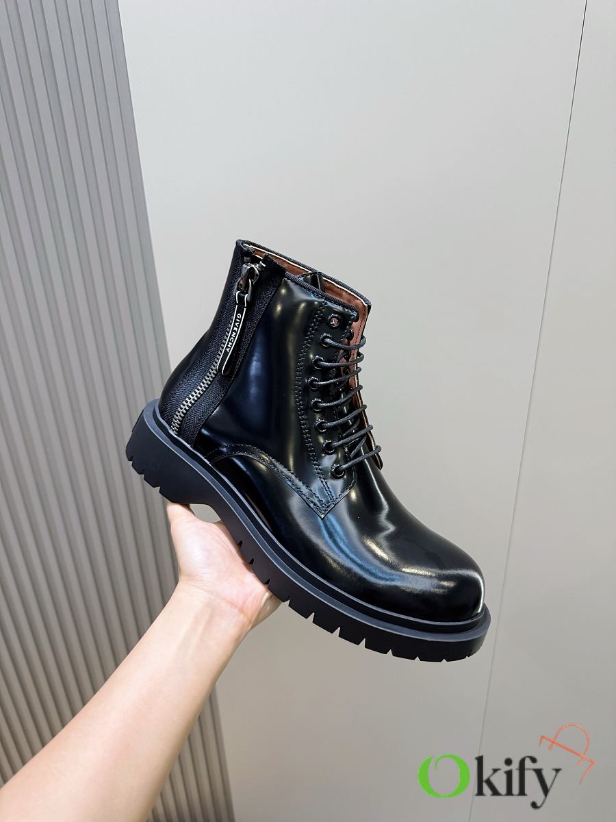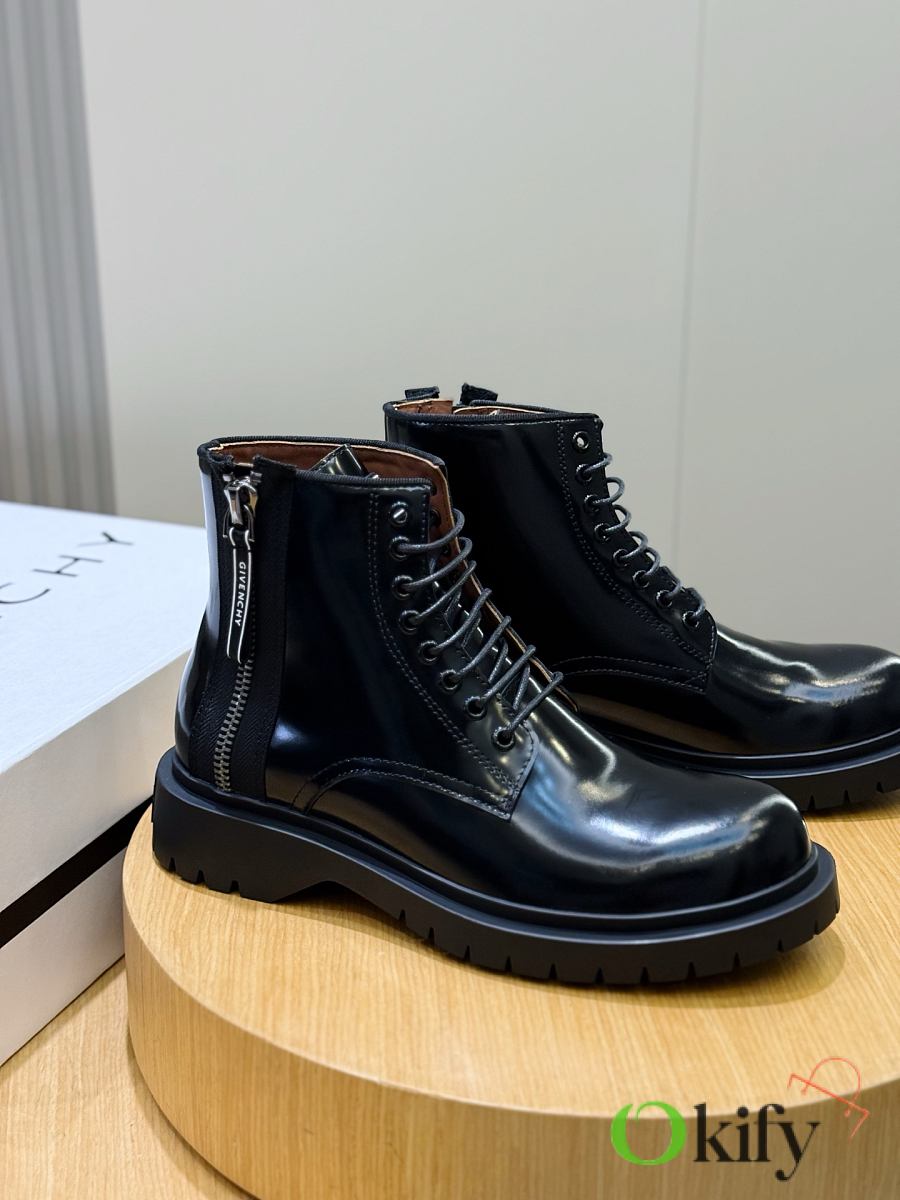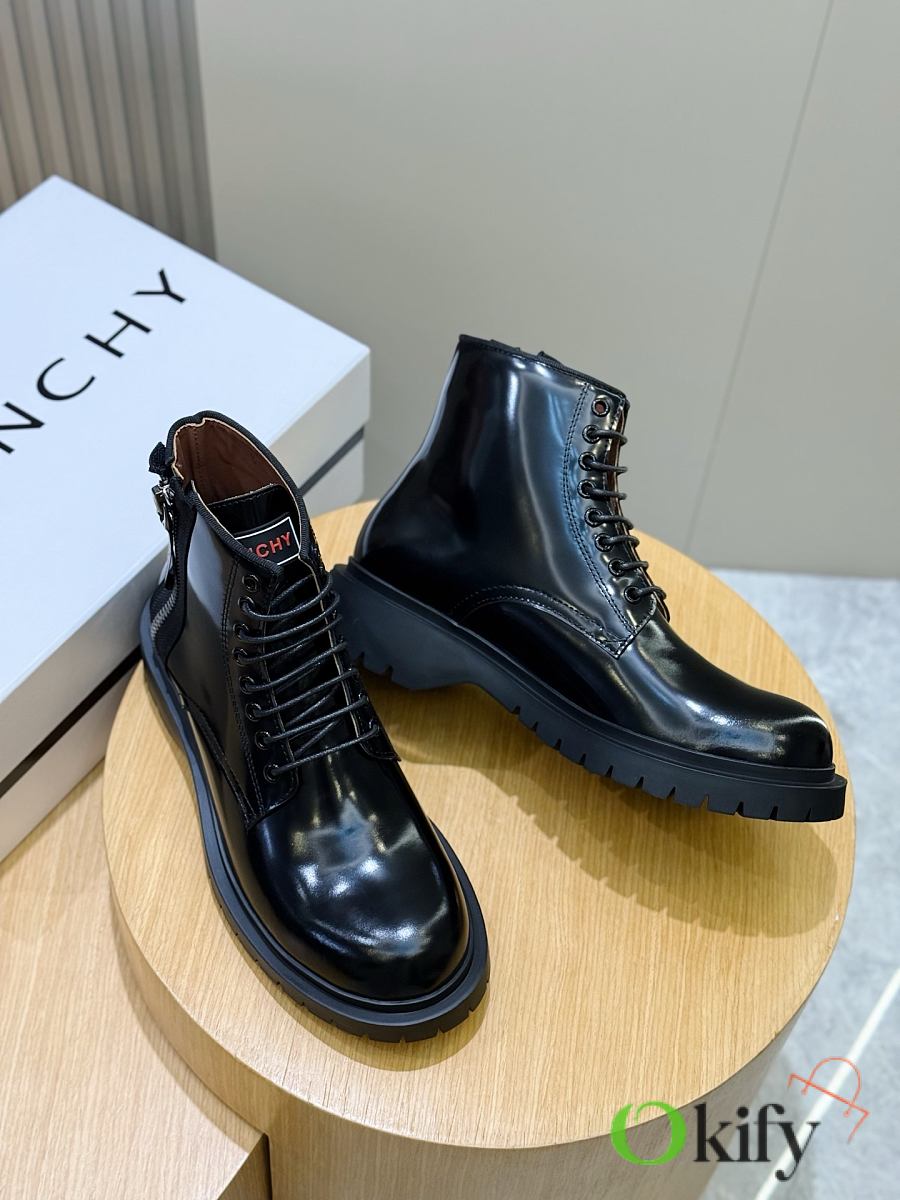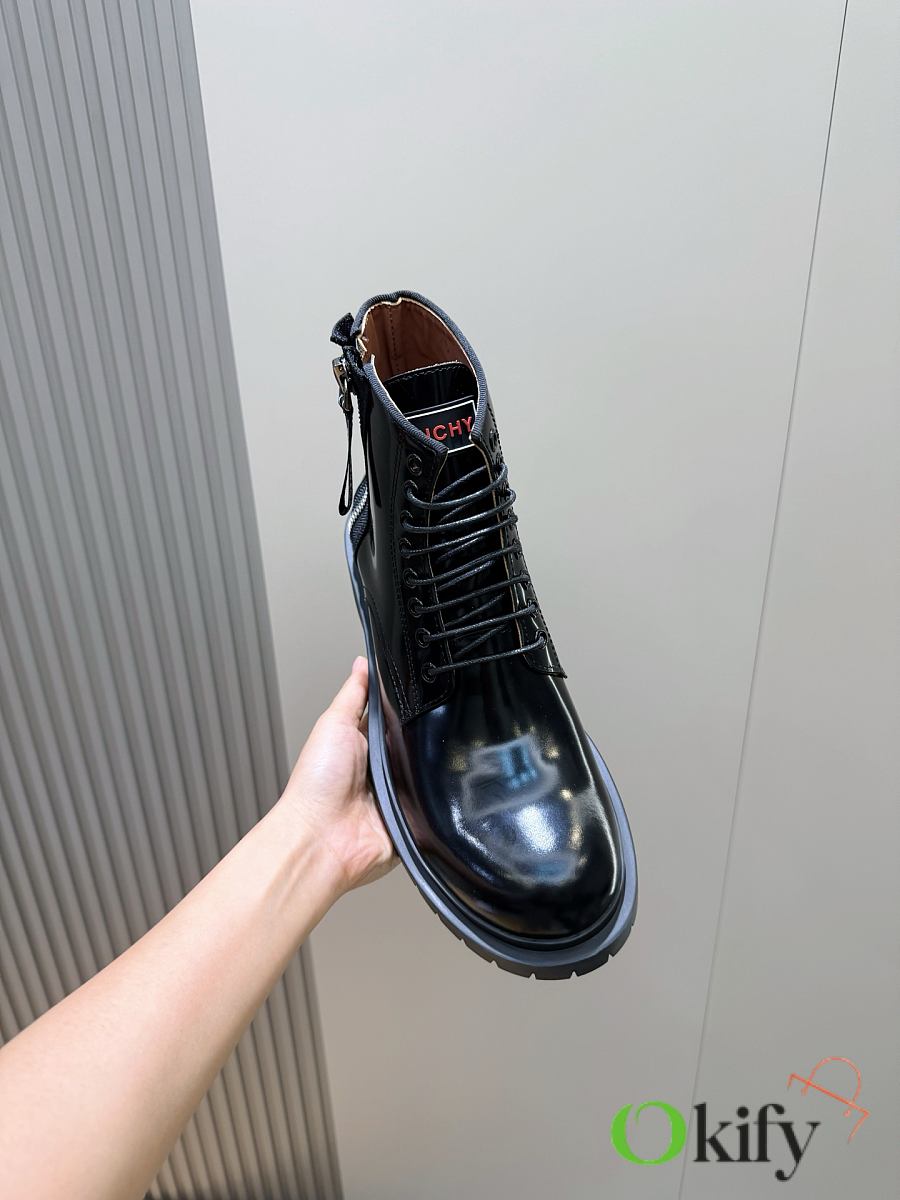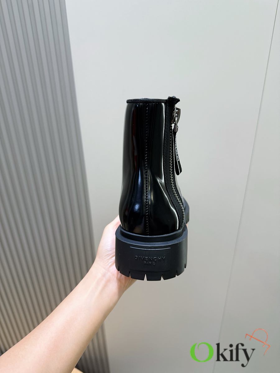 • Cowhide split-edge patent leather ankle boots Show series • Comfortable padded shoe opening • Gold-plated metal hook-and-eye clasp • The tongue features an embossed GIVENCHY logo, and the heel of the sole is adorned with GIVENCHY branding. LOGO embossing 4G logo embossed on the heel • Thick rubber sole
