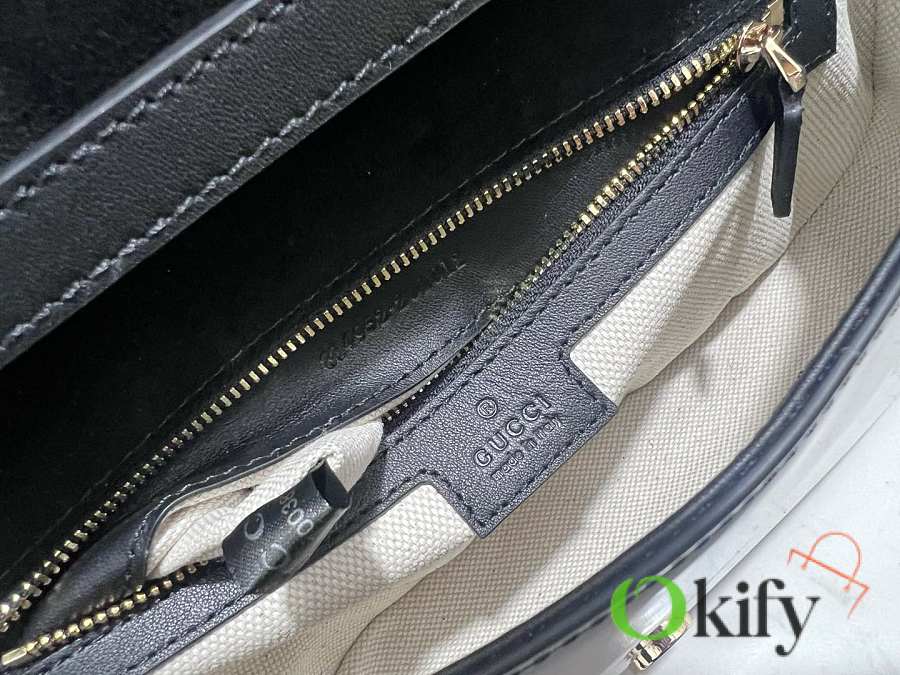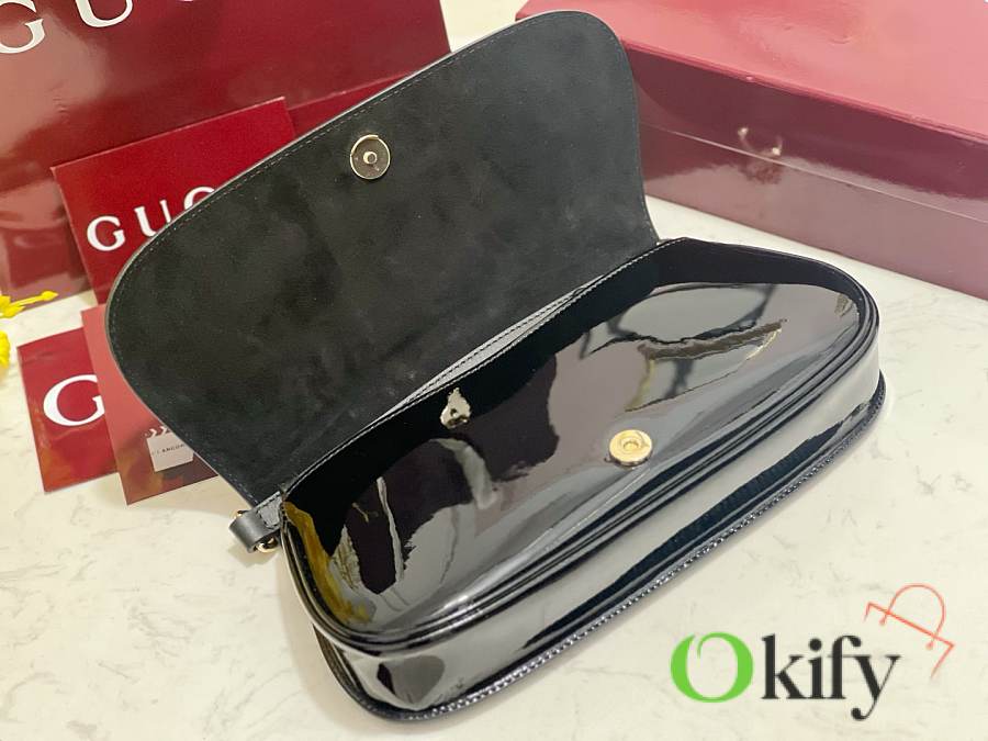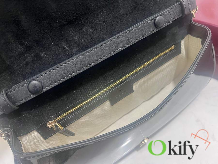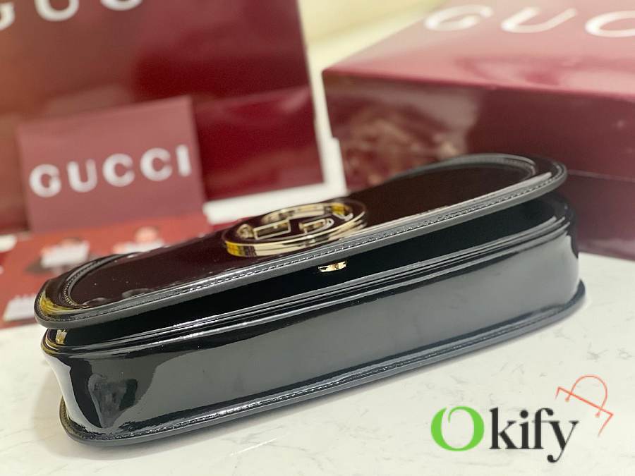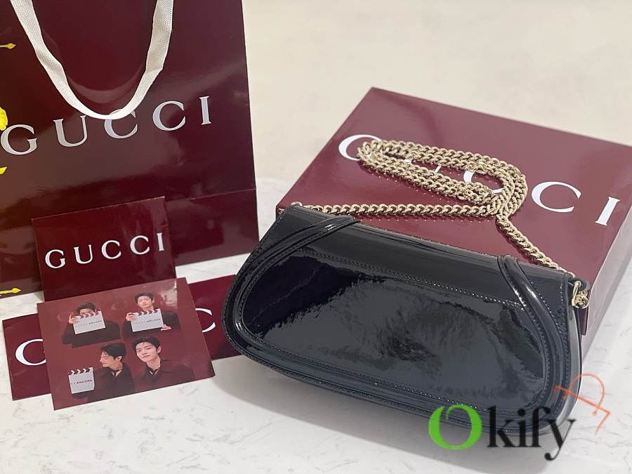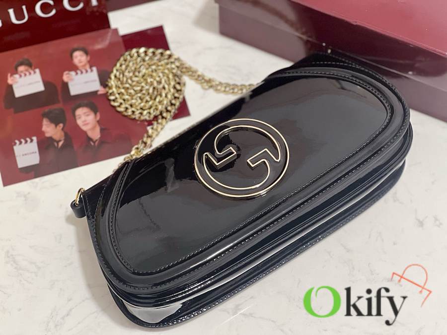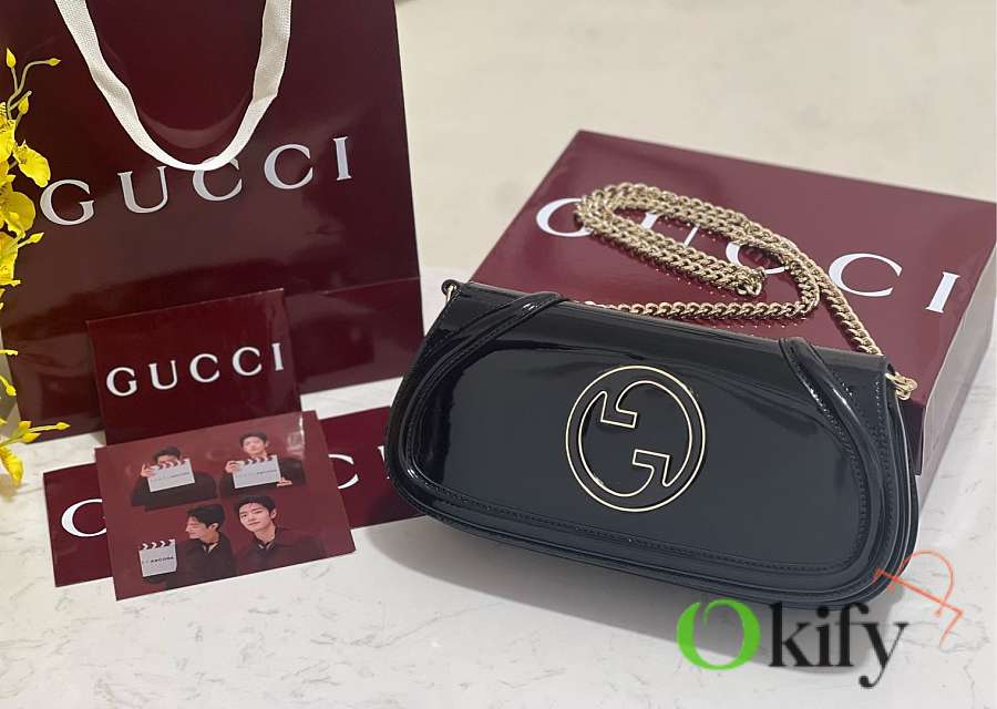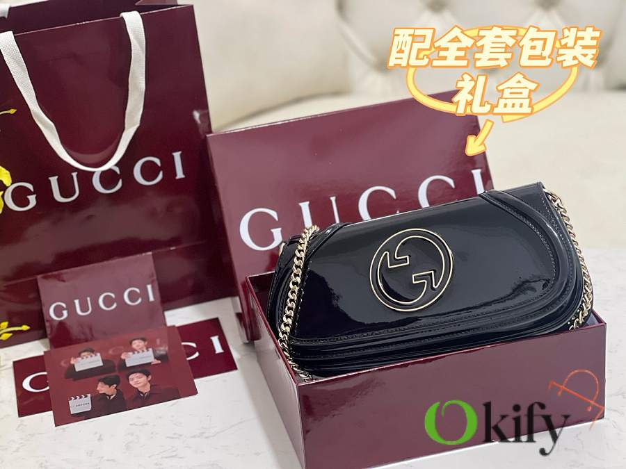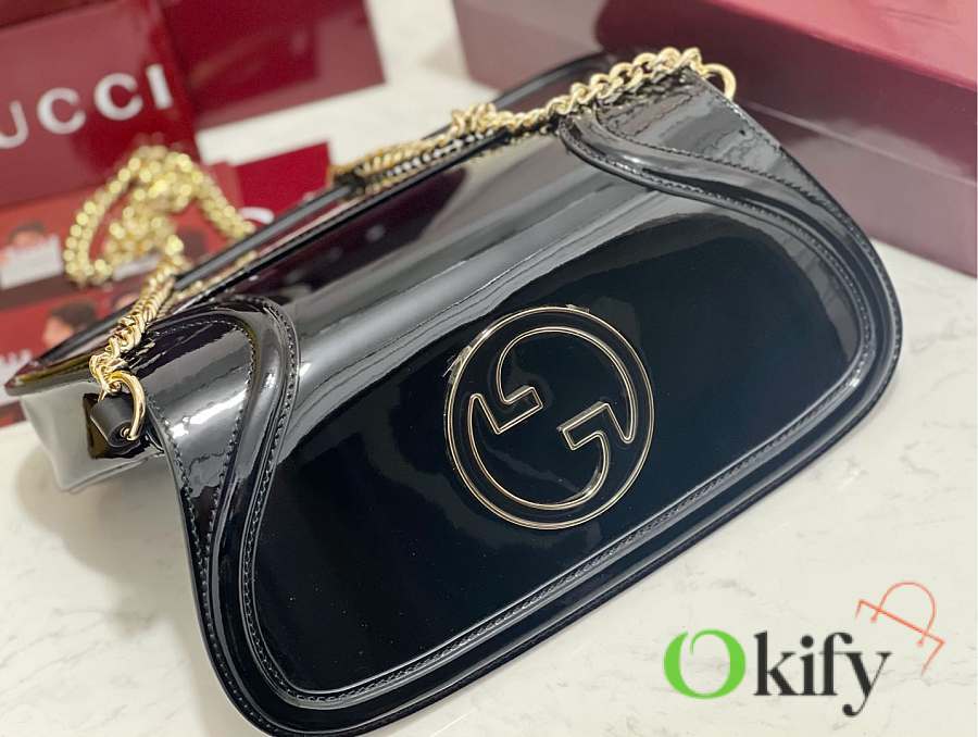 Gucci Blondie Small Shoulder Bag The new Gucci Blondie handbag collection features the iconic logo of the brand's collection, which first debuted in the early 1970s. It cleverly combines heritage charm with contemporary style, brilliantly interpreting the brand's classic design and modern essence. This small shoulder bag is crafted from black patent leather, adorned with an enamel circular logo, and features a gold-tone chain shoulder strap. Model: 814952